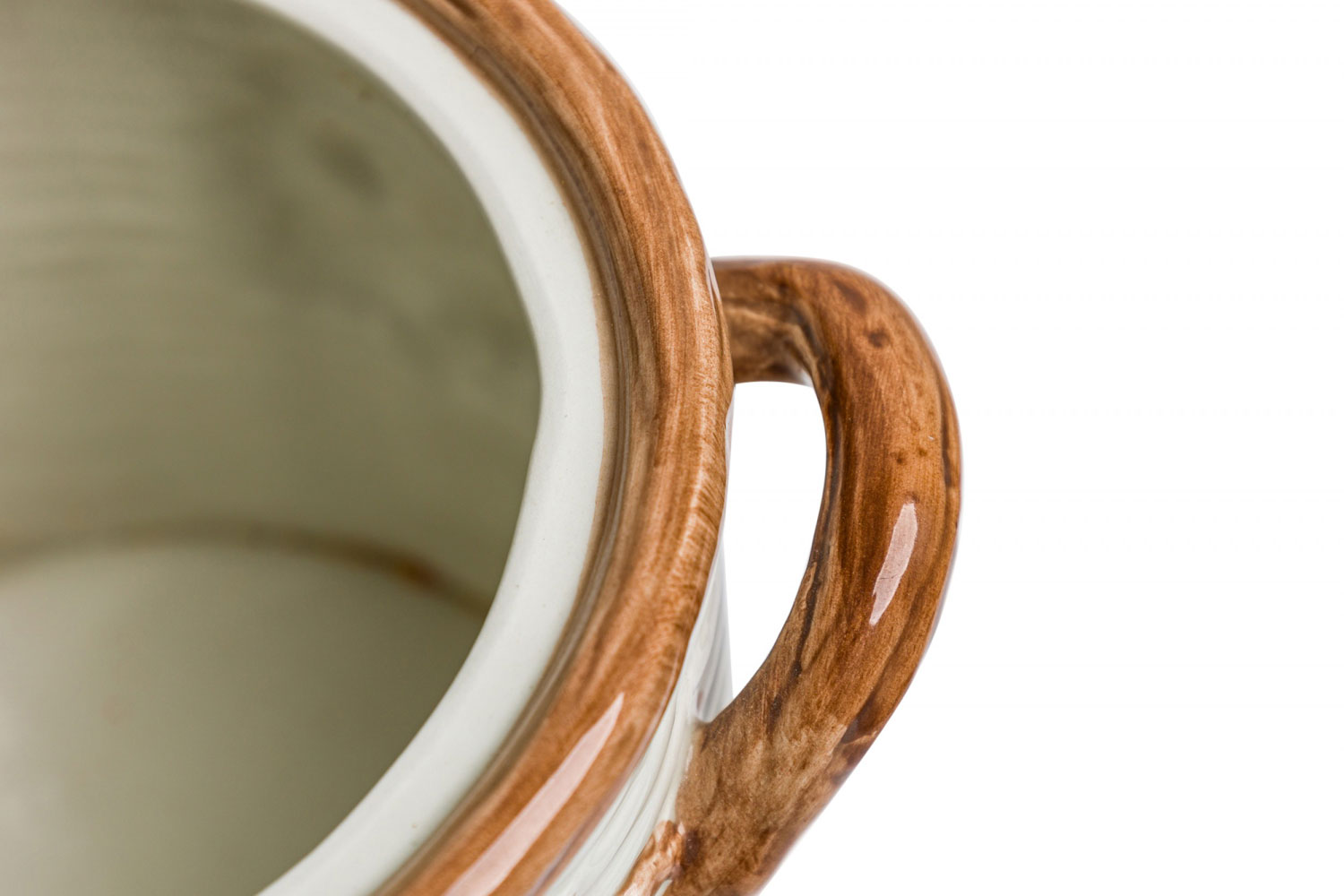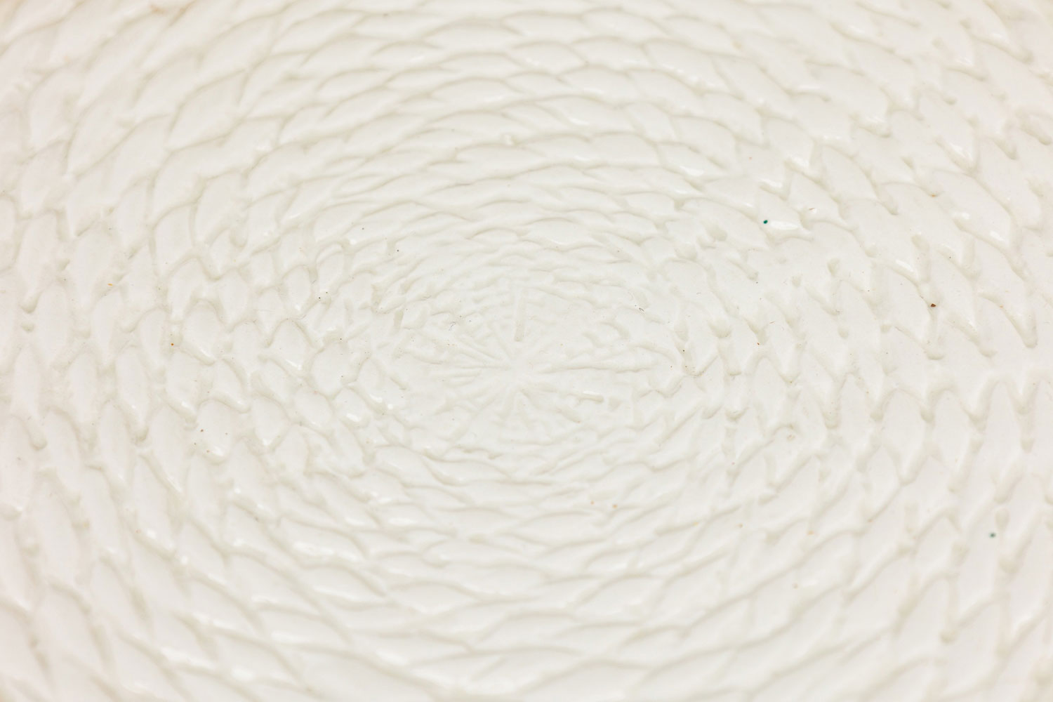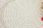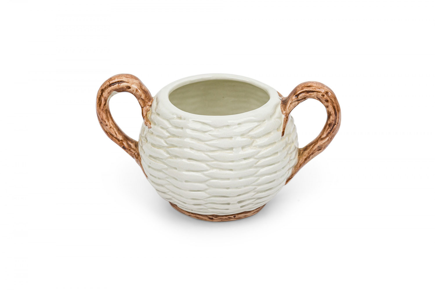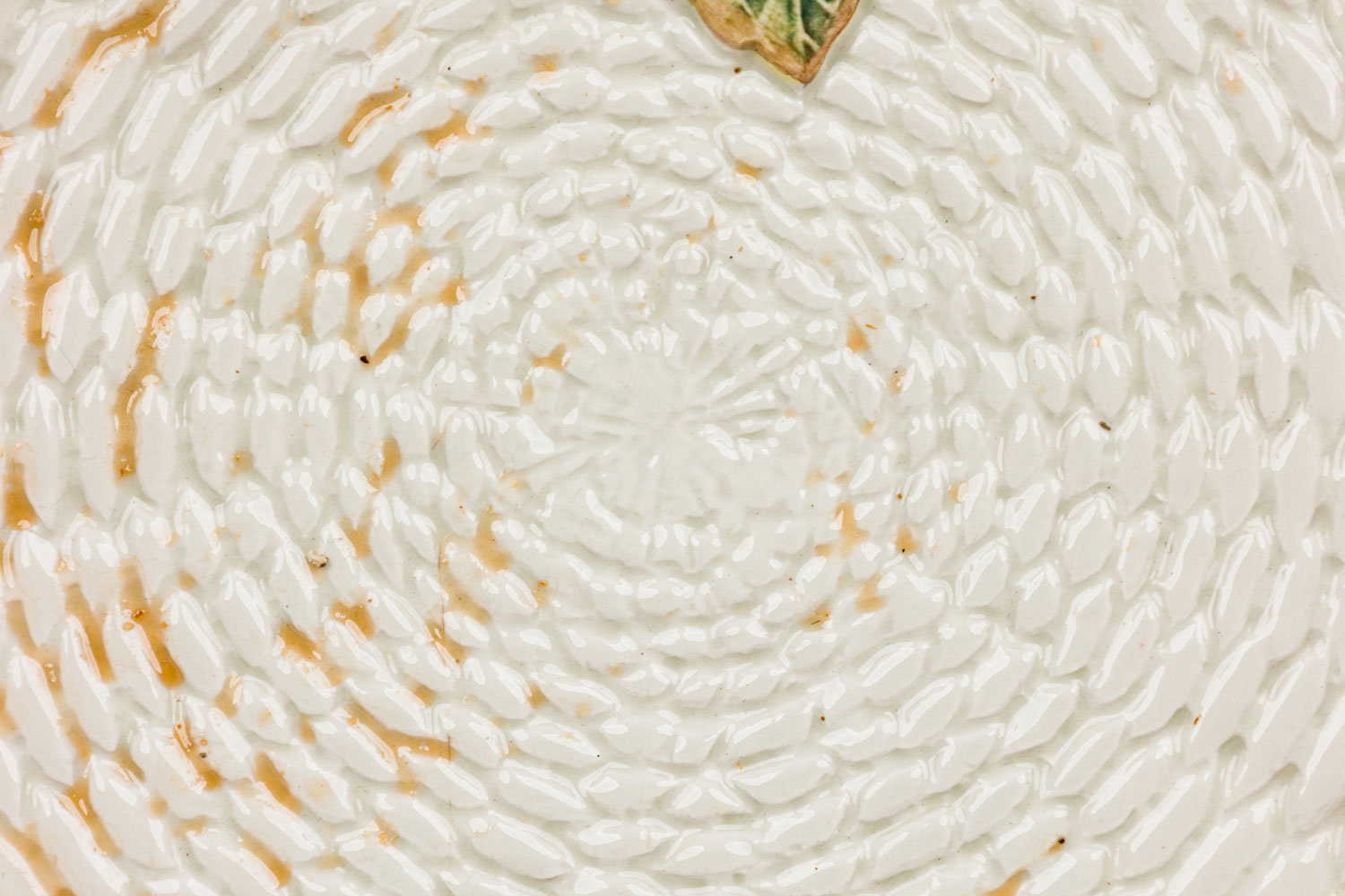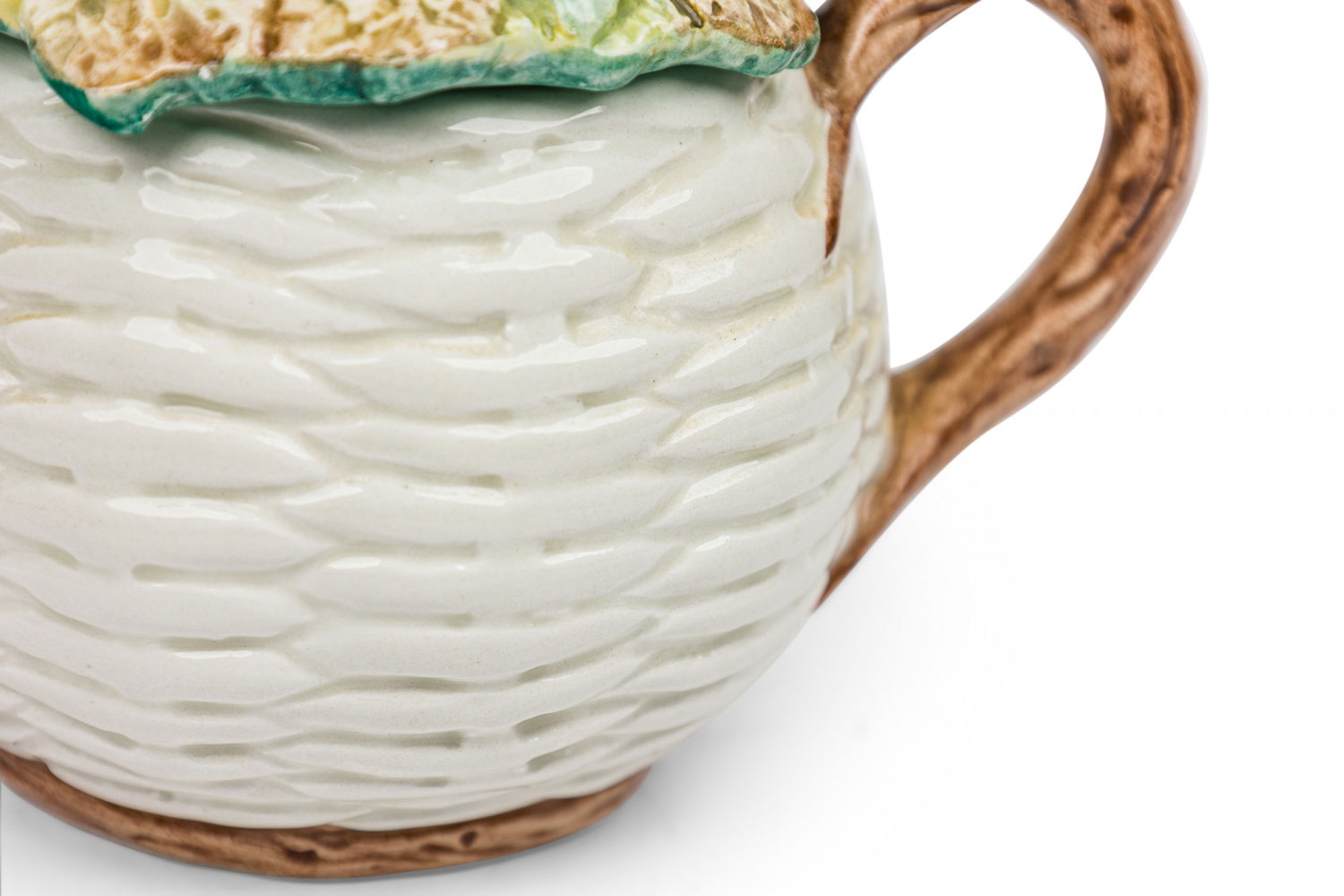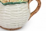 17 PIECE-SET of Vintage crockery including 3 small plates, 1 large plate, 2 large trays, a water pitcher, 2 cream pitchers, a sugar bowl, a soup tureen, and four dry good cannisters, all with basket weave white surfaces with colorful accents featuring mushrooms, berries, asparacus, leaks, and other vegetables. (PRICED AS SET)