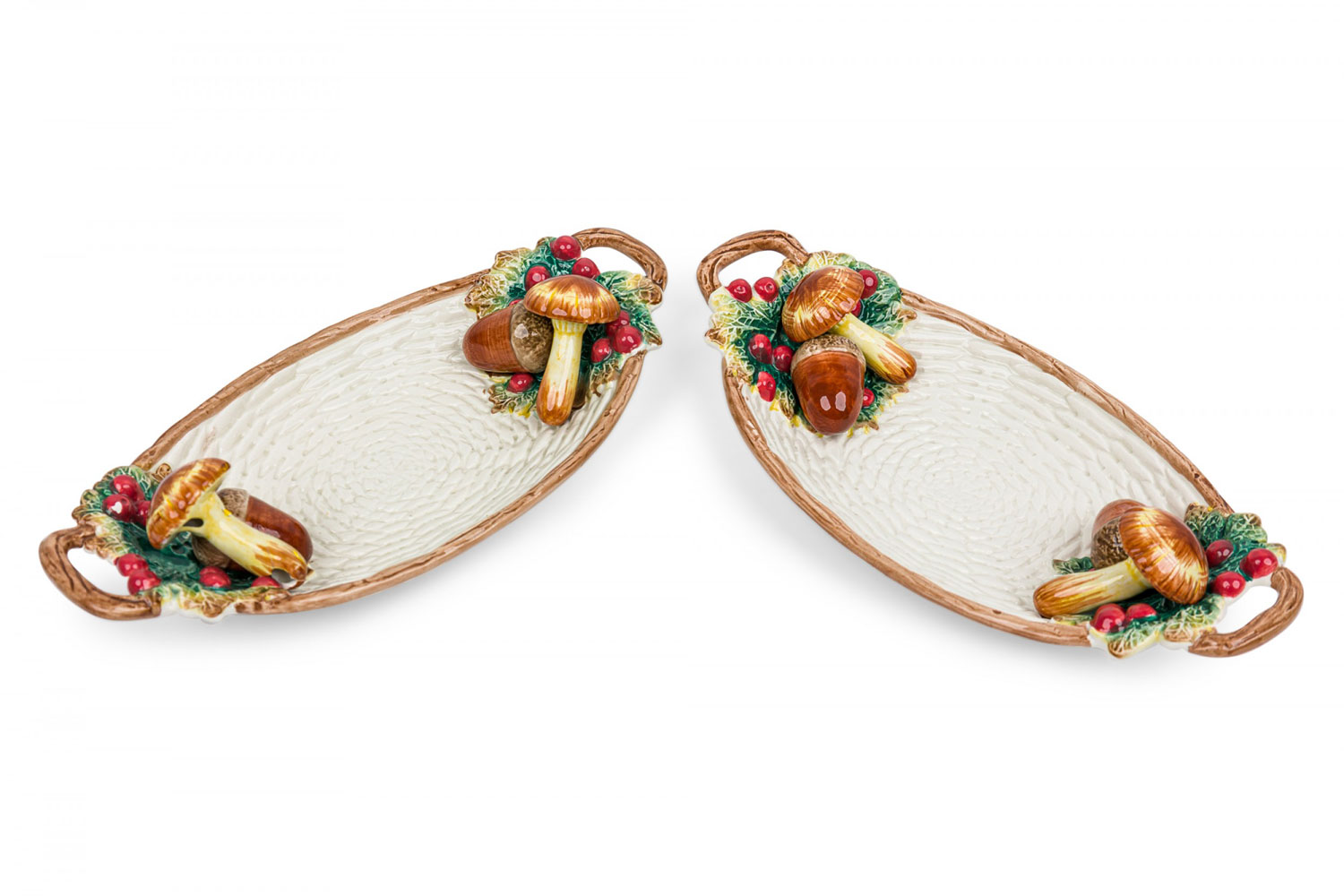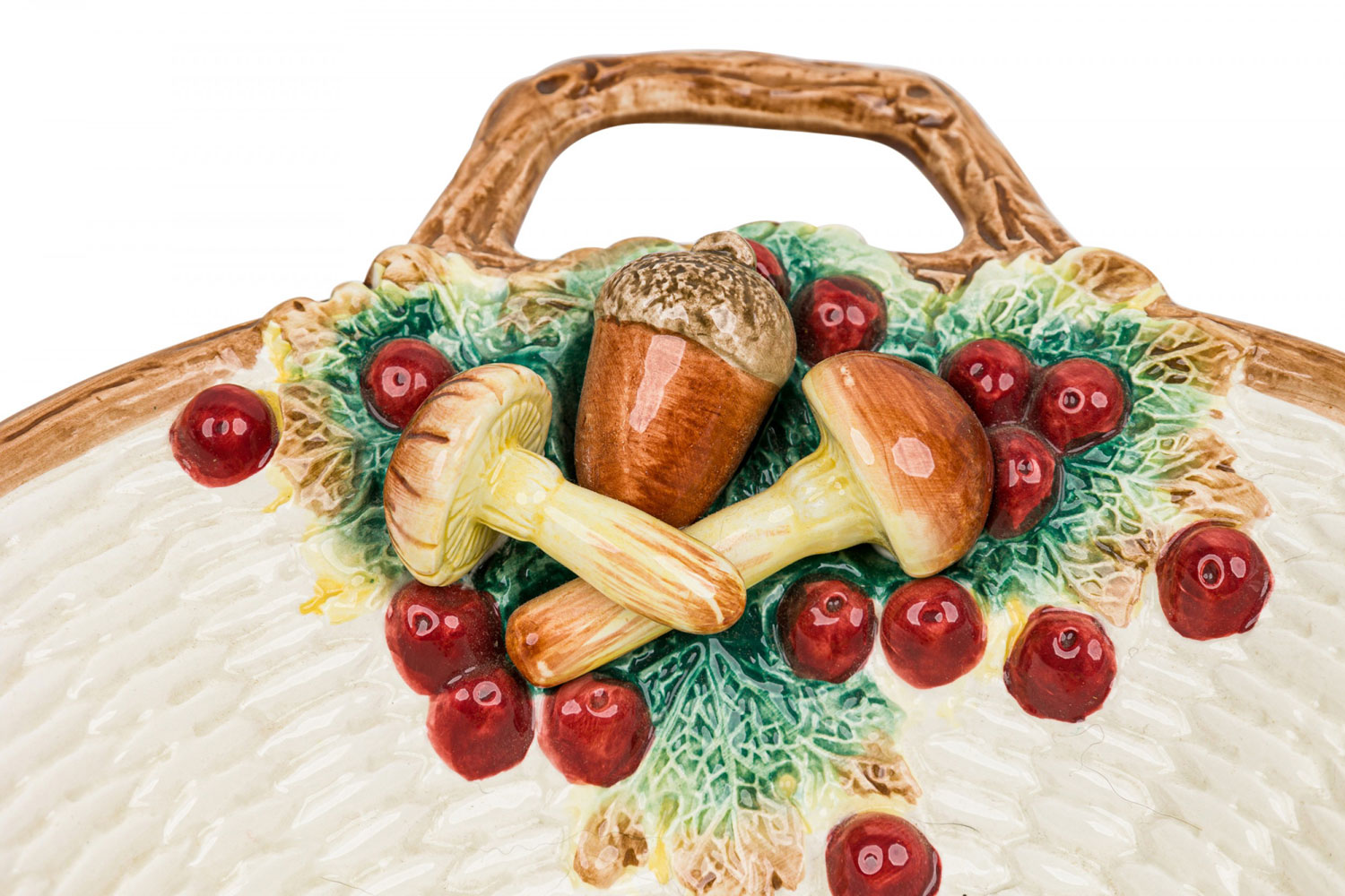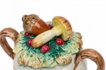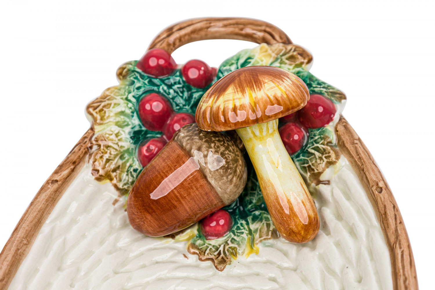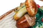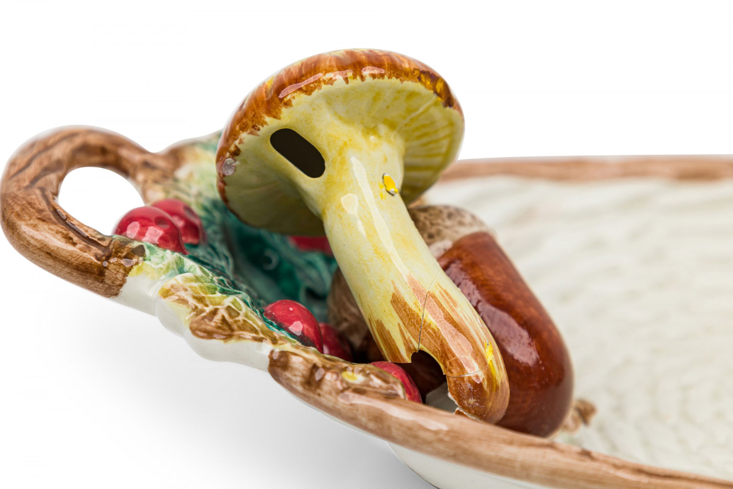 Style: Mid-Century Materials & Techniques: Ceramic, painted Category: Dining Room Condition: A few chips. Mushroom on small oblong dish has been broken and repaired. Good; Minor losses