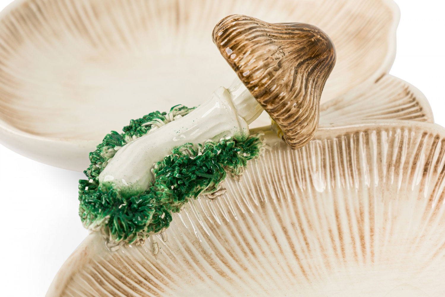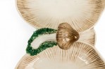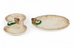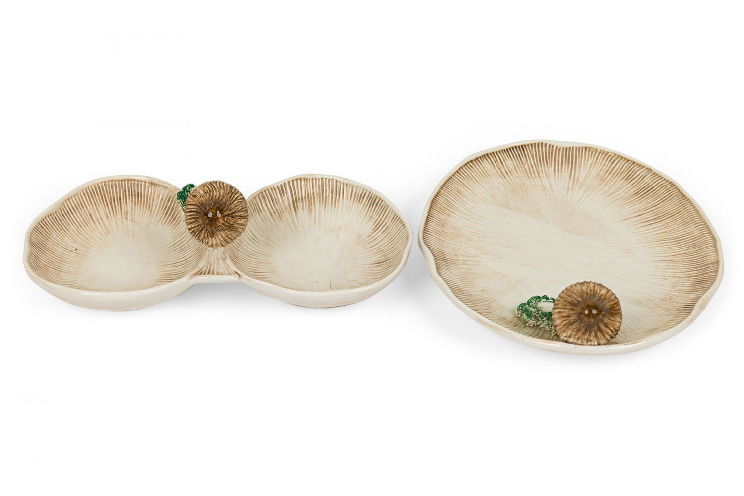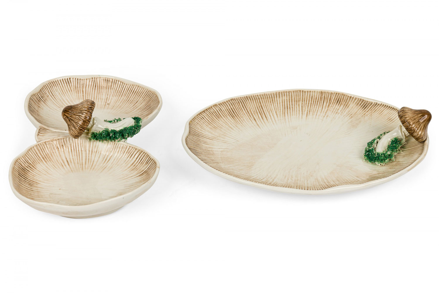 2-Piece Vintage ceramic plate set containing one large serving plate and a double compartments serving plate with a mushroom motif, incised surfaces, and a beige, brown, and green glazed finish. (PRICED AS SET)
