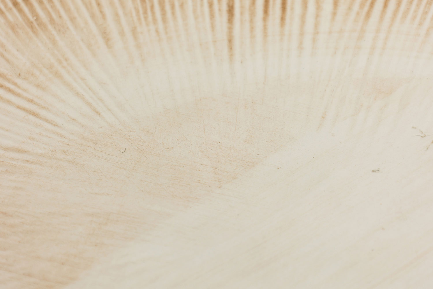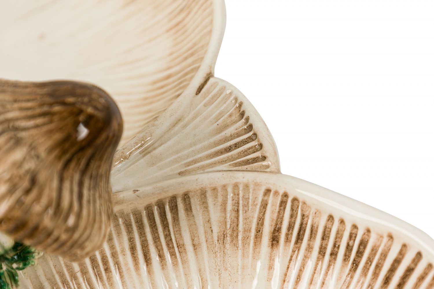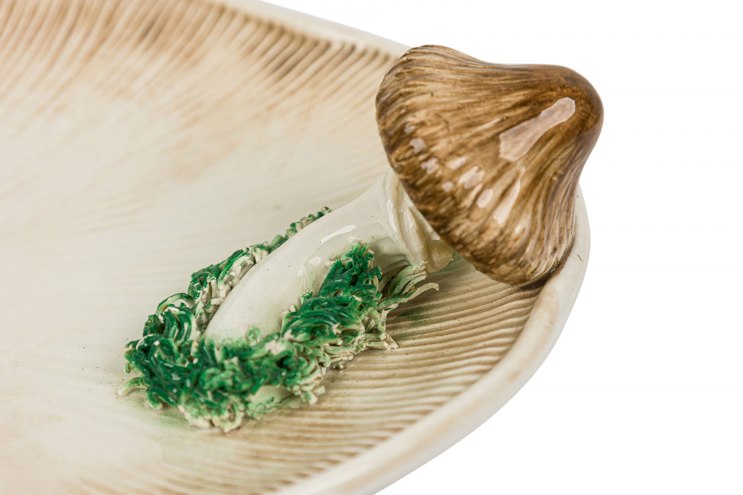 2-Piece Vintage ceramic plate set containing one large serving plate and a double compartments serving plate with a mushroom motif, incised surfaces, and a beige, brown, and green glazed finish. (PRICED AS SET)