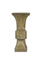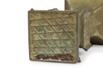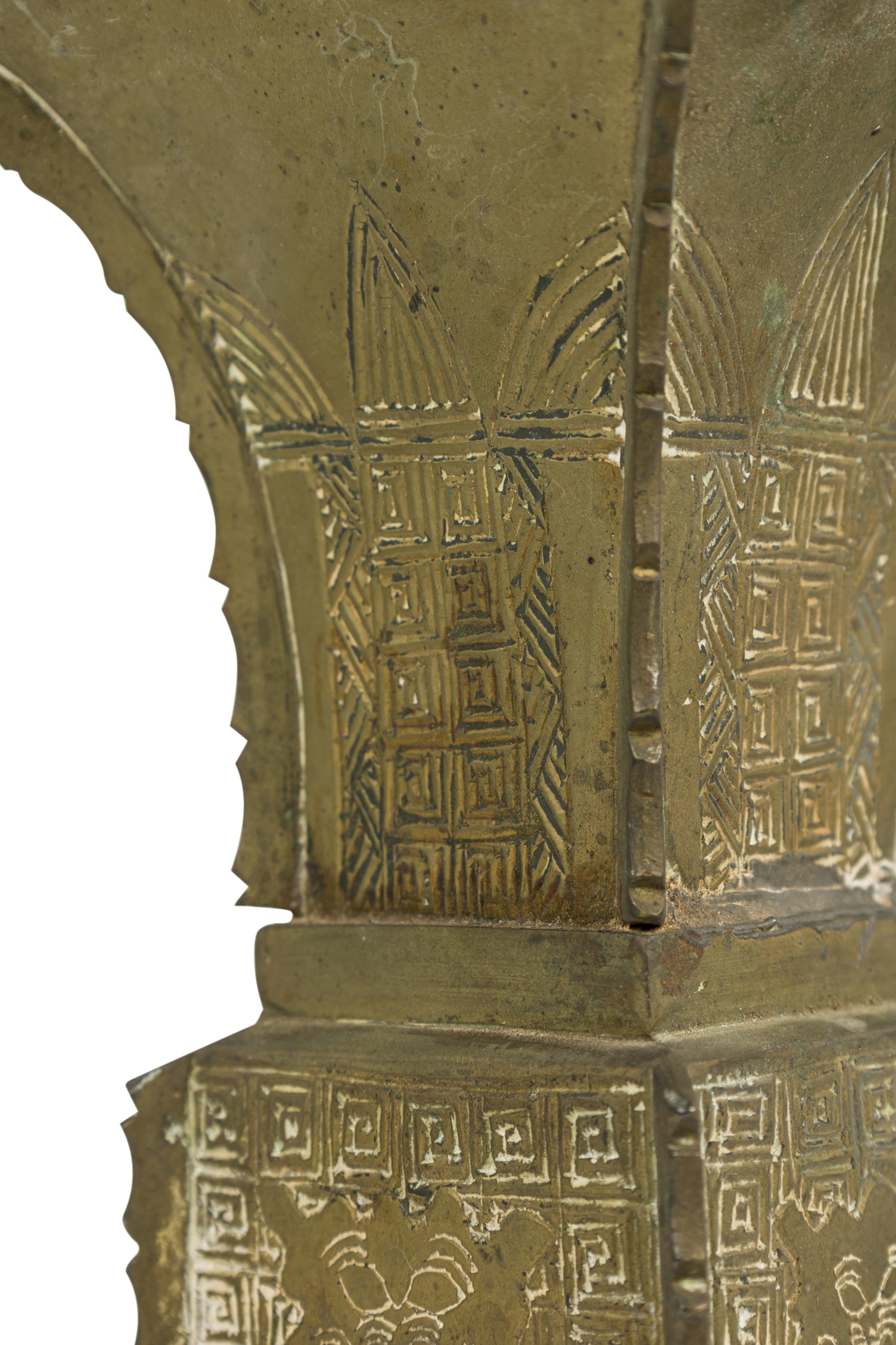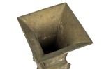 Asian Chinese style metal square funnel shape design vase with an antique patina and having an etched design