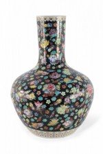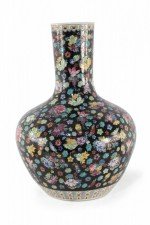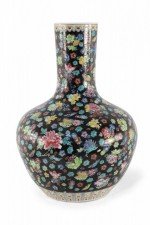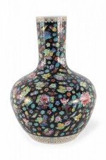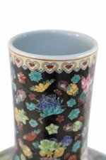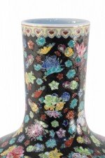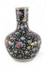 Chinese black porcelain vase decorated with an abundance of flowers varying in size, shape and color and two patterned bands around the top and base..