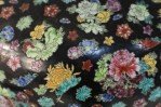 Chinese black porcelain vase decorated with an abundance of flowers varying in size, shape and color and two patterned bands around the top and base.