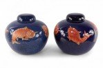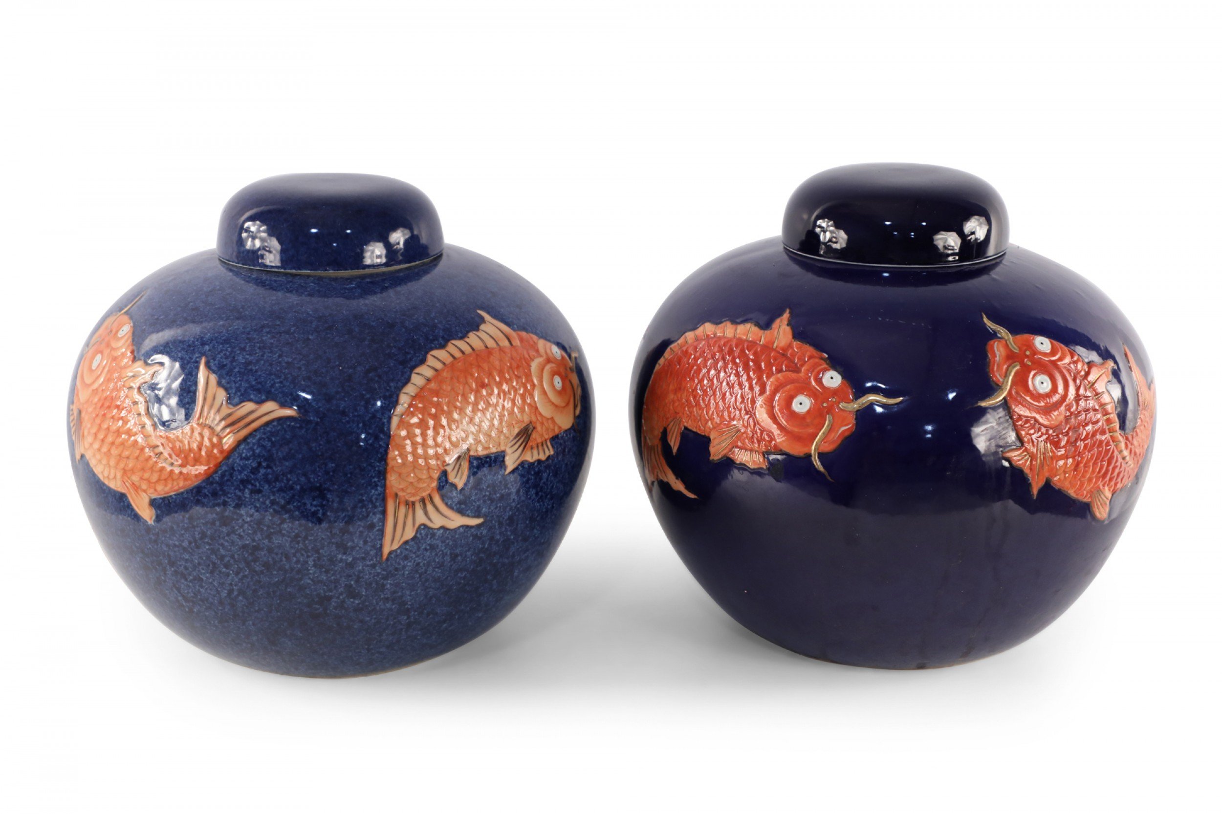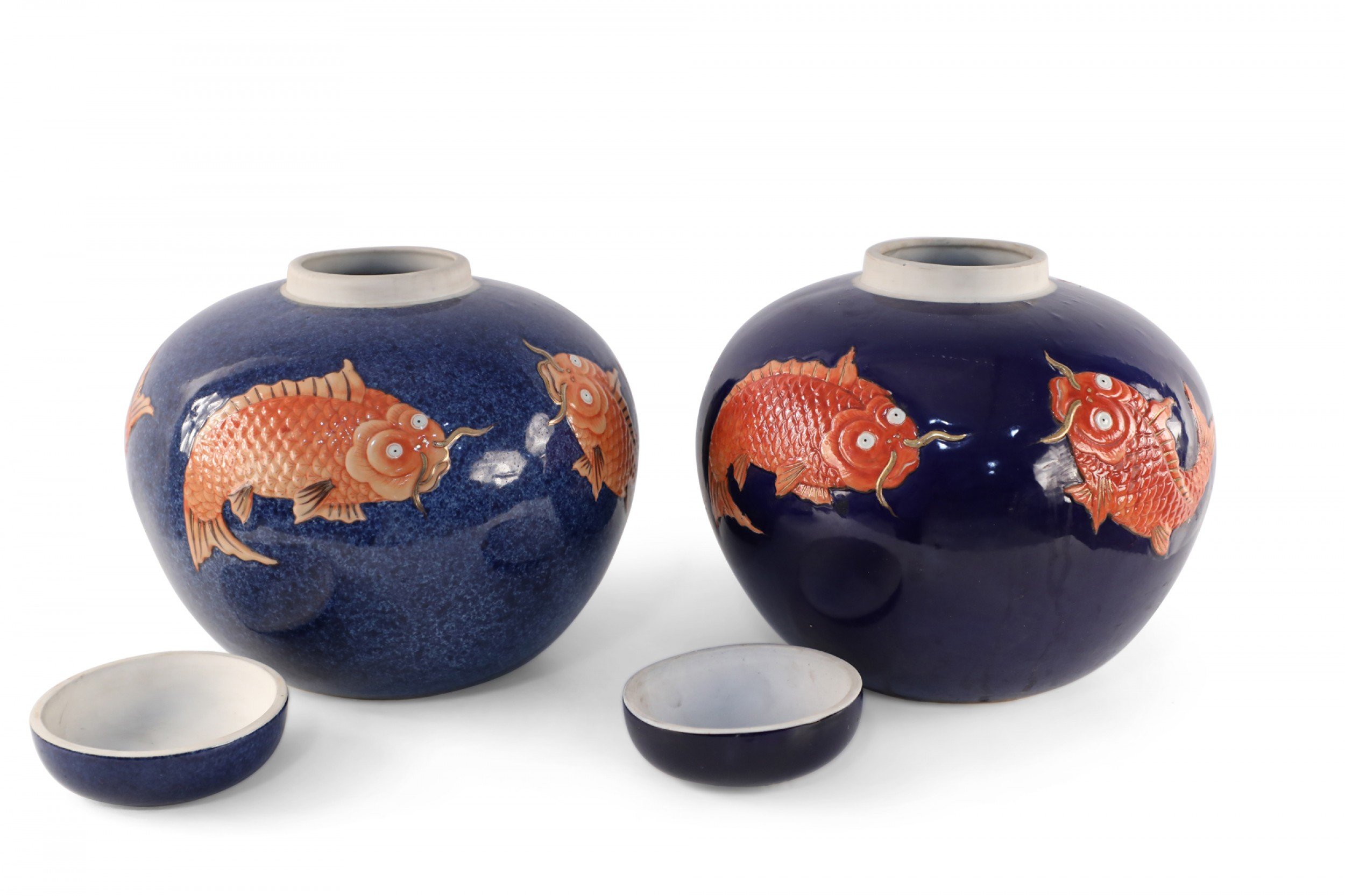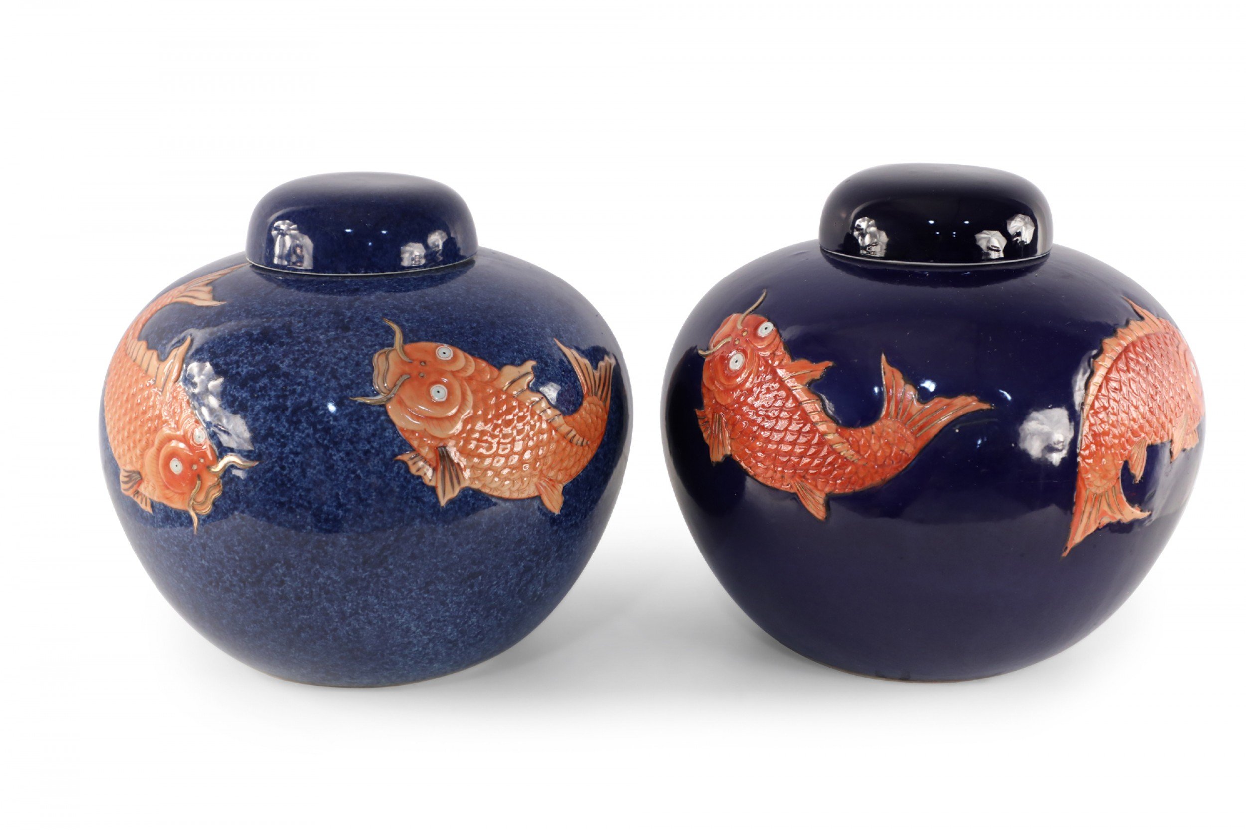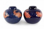 Chinese Blue and Orange Fish Design Round Lidded Porcelain Jars