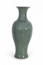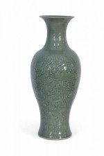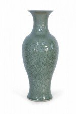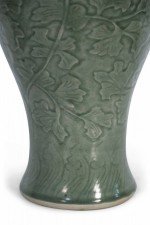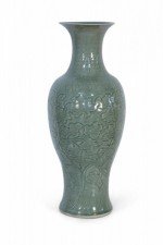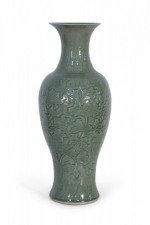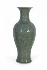 Chinese sage-colored porcelain vase decorated in an incised floral and swirling pattern that travels up the curves of the body to the concave neck, before the shape flares out once again at the trumpeted opening..