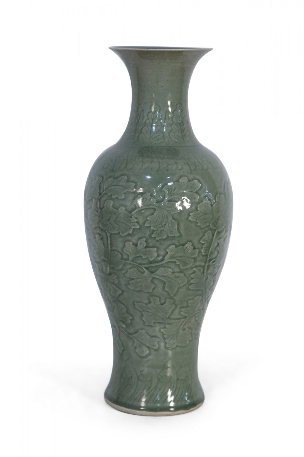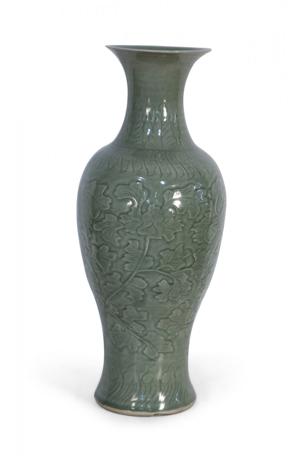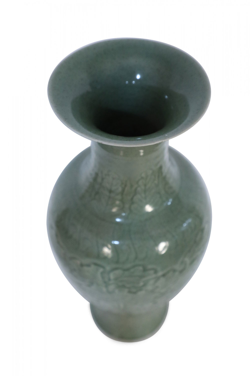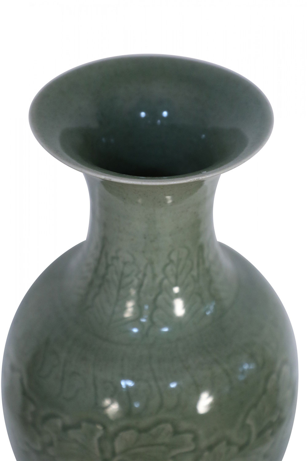 Chinese sage-colored porcelain vase decorated in an incised floral and swirling pattern that travels up the curves of the body to the concave neck, before the shape flares out once again at the trumpeted opening.
