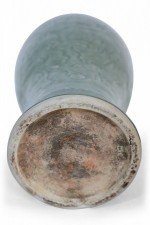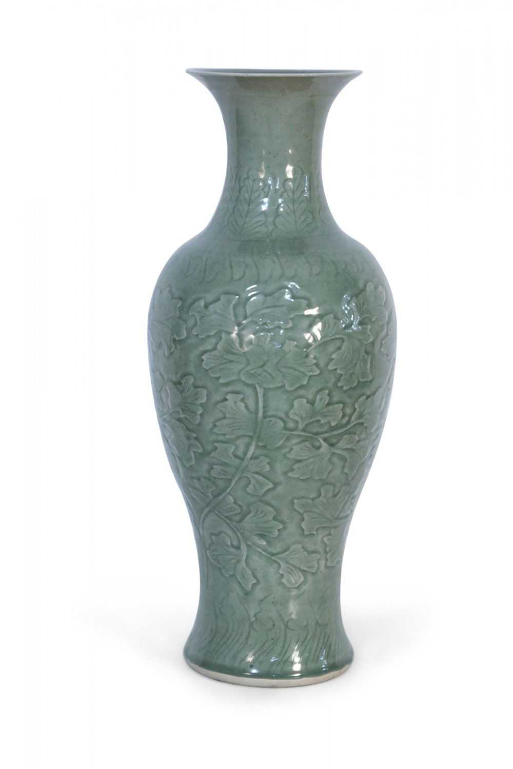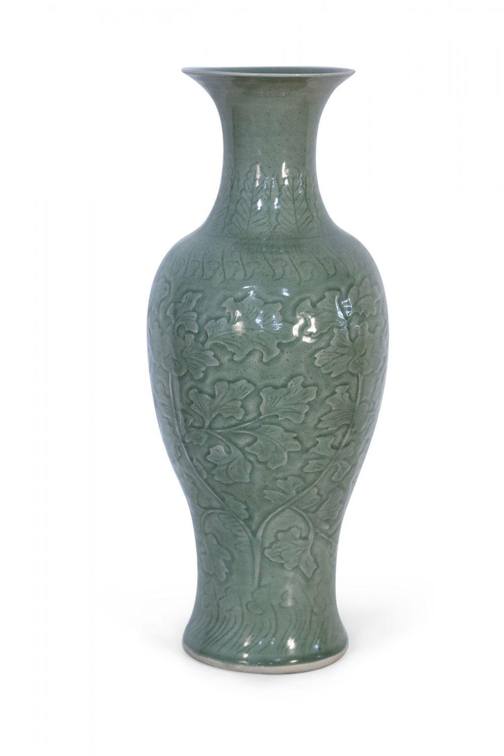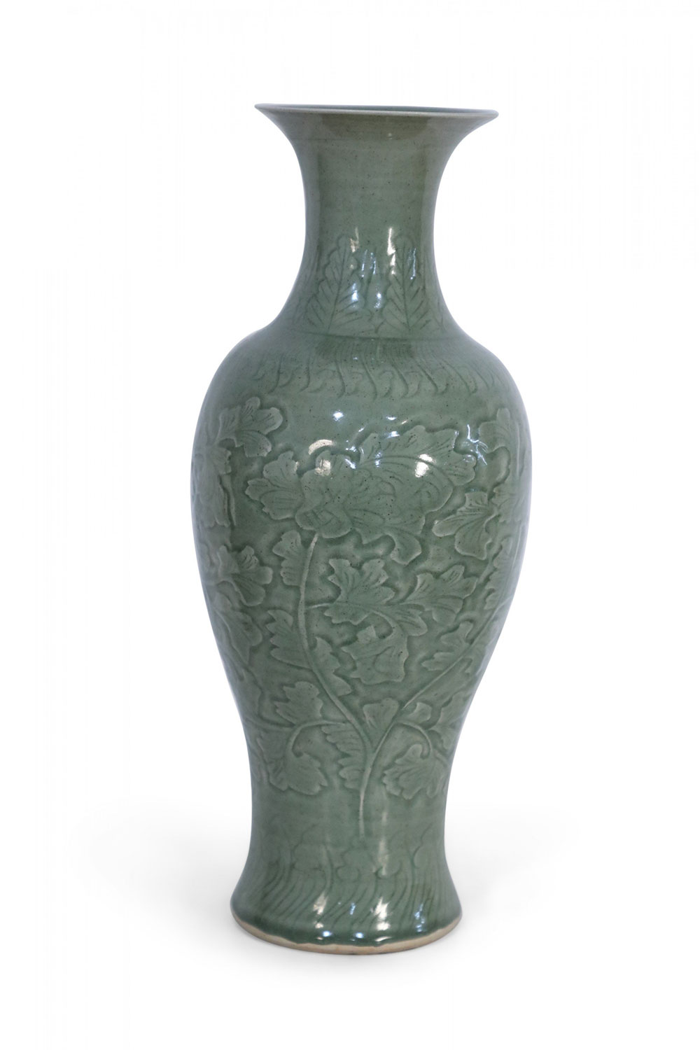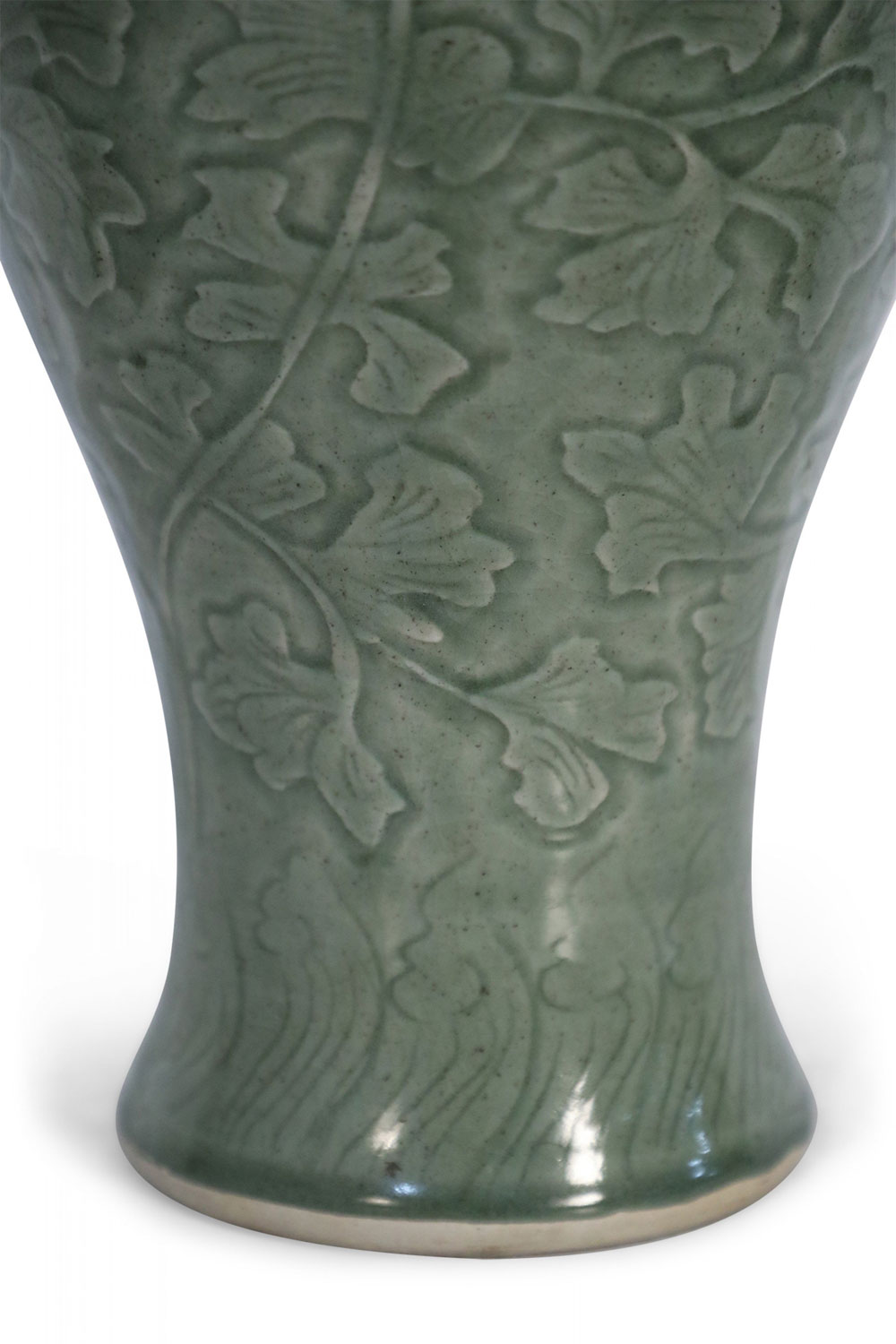 Chinese sage-colored porcelain vase decorated in an incised floral and swirling pattern that travels up the curves of the body to the concave neck, before the shape flares out once again at the trumpeted opening.