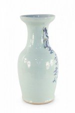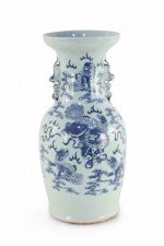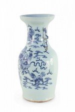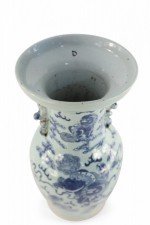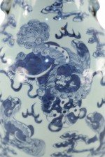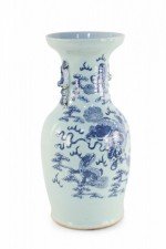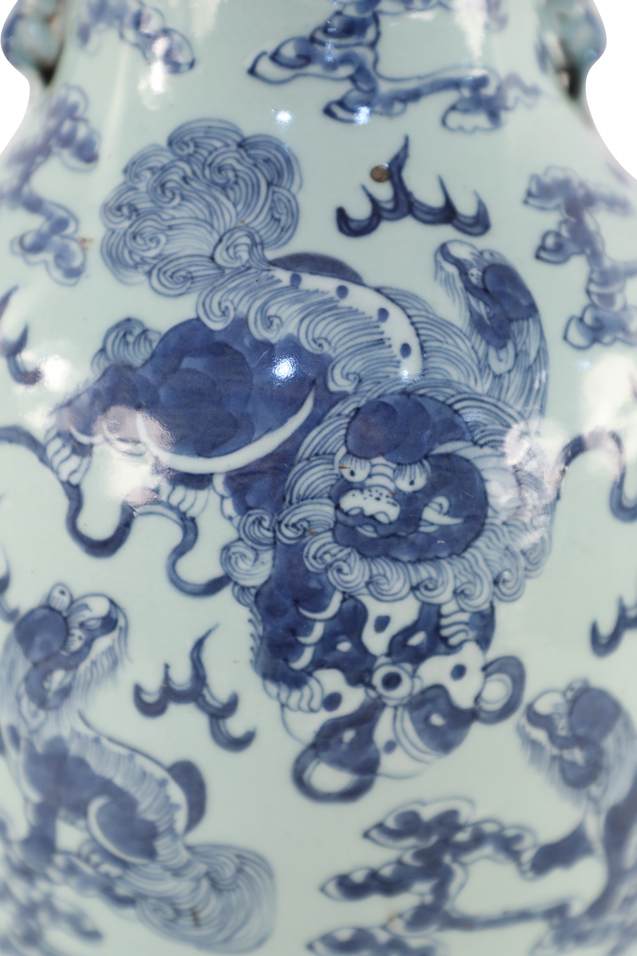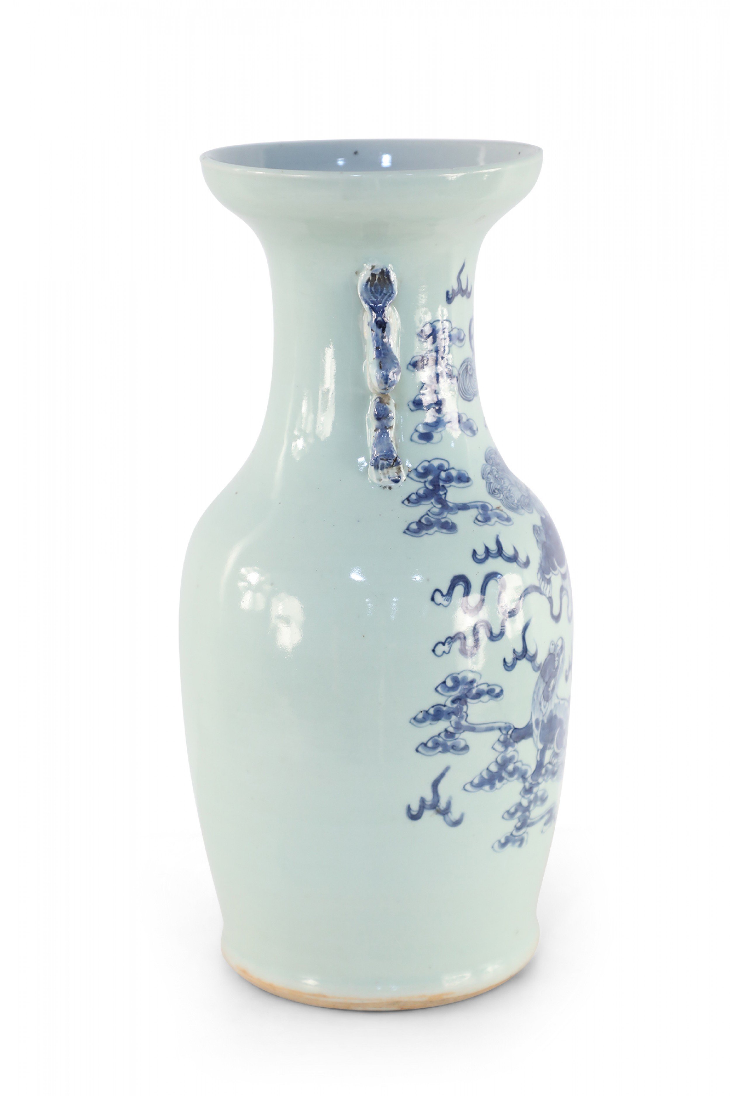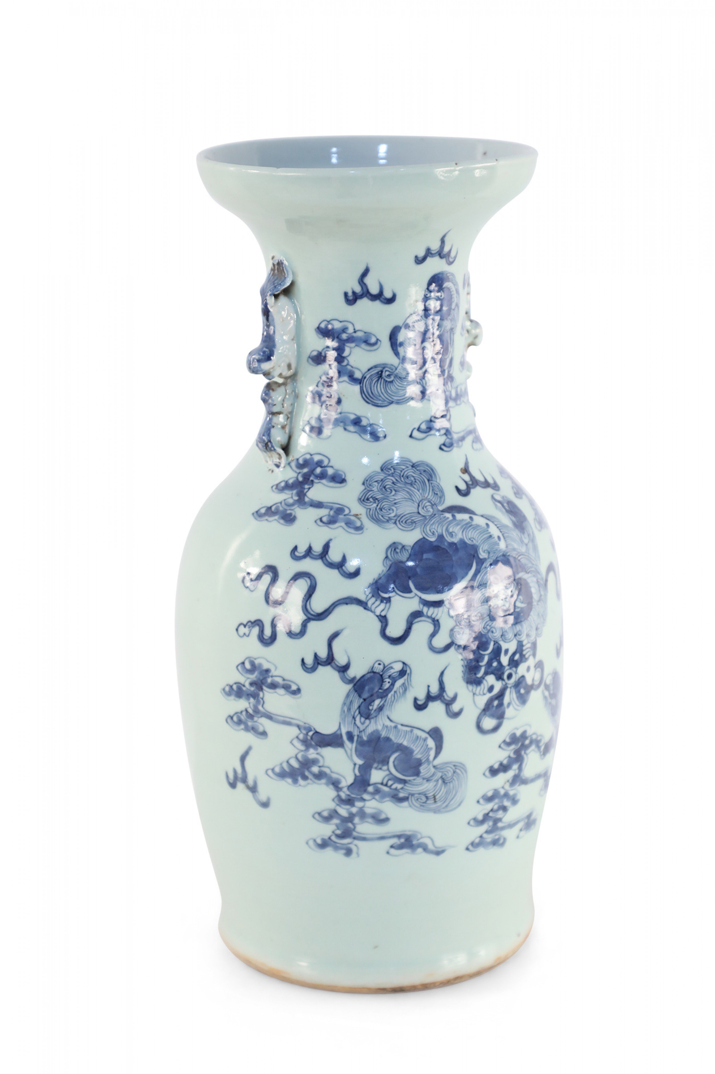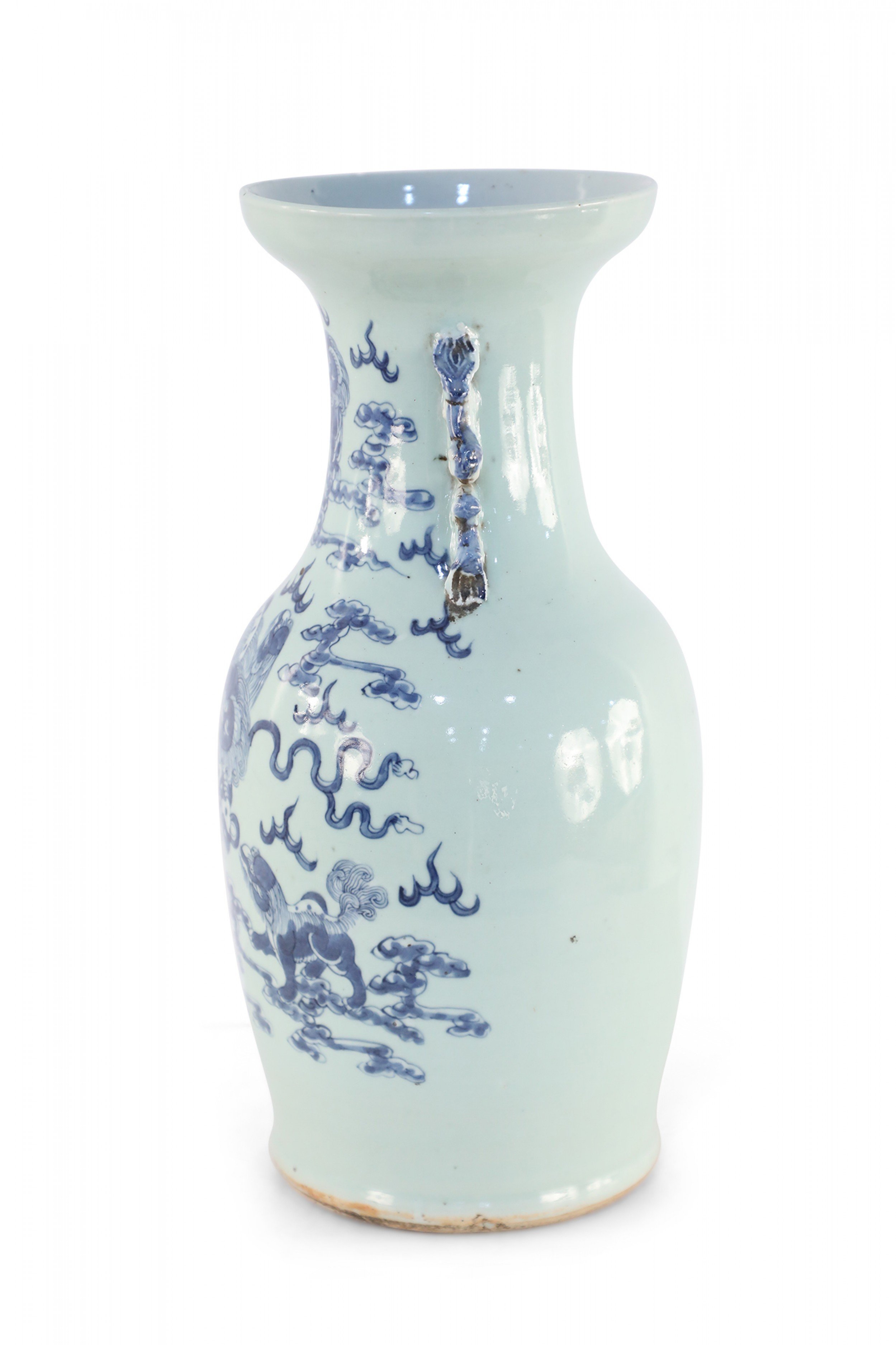 Antique Chinese (Late 19th Century) off-white porcelain urn decorated with blue foo dogs playing amid the clouds and accented in two pale blue scrolled handles along the neck..
