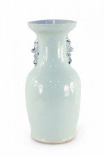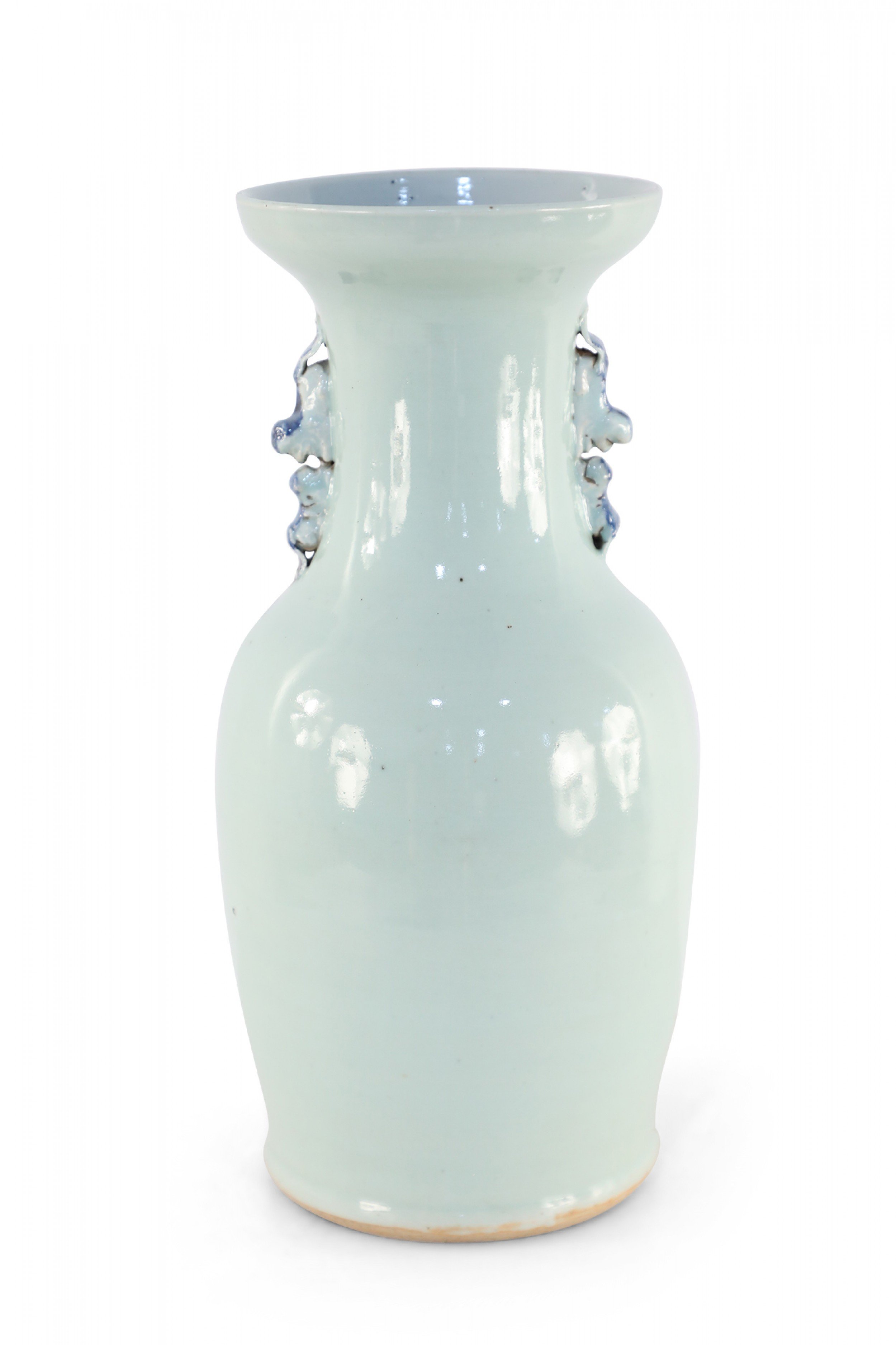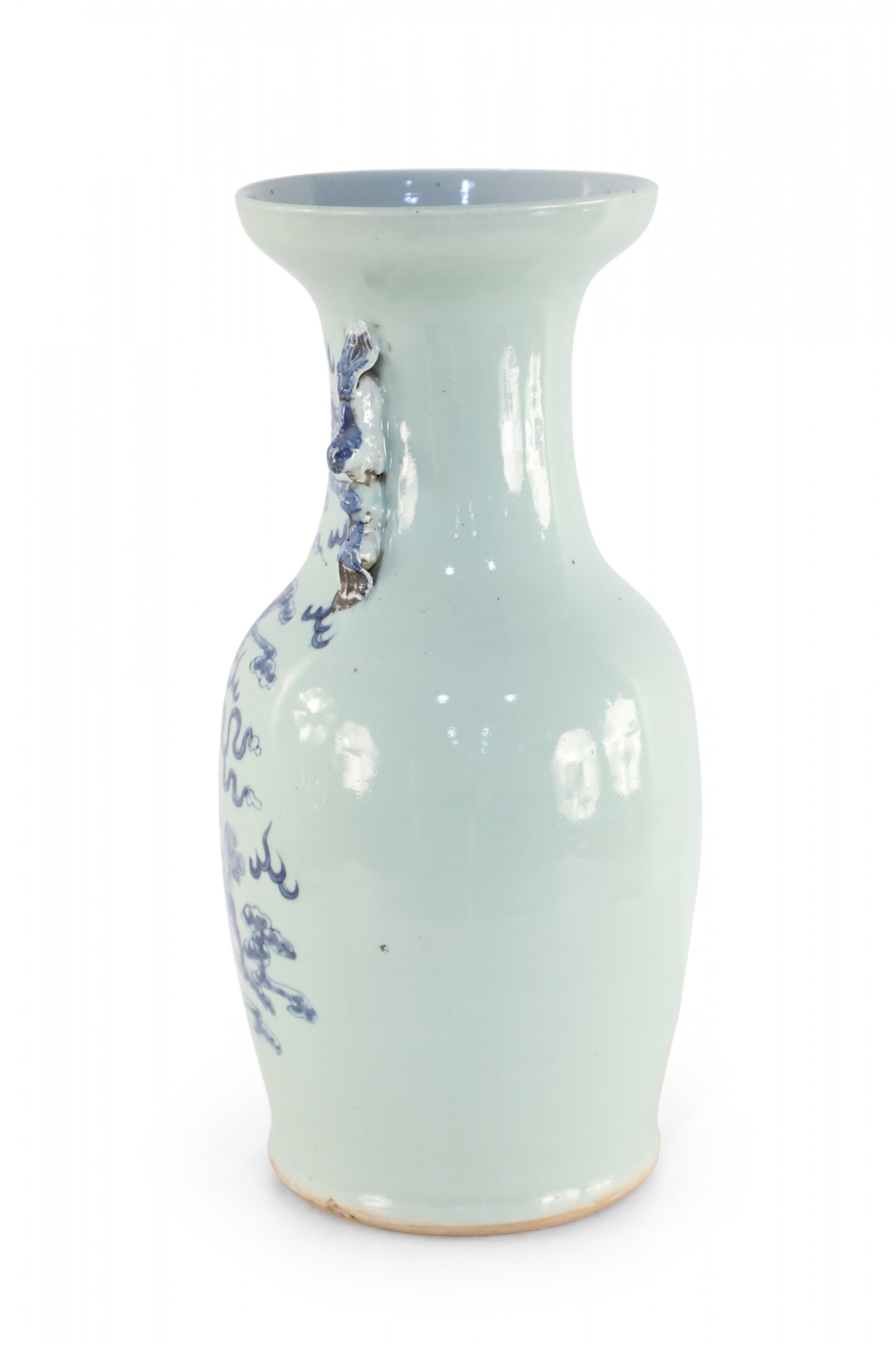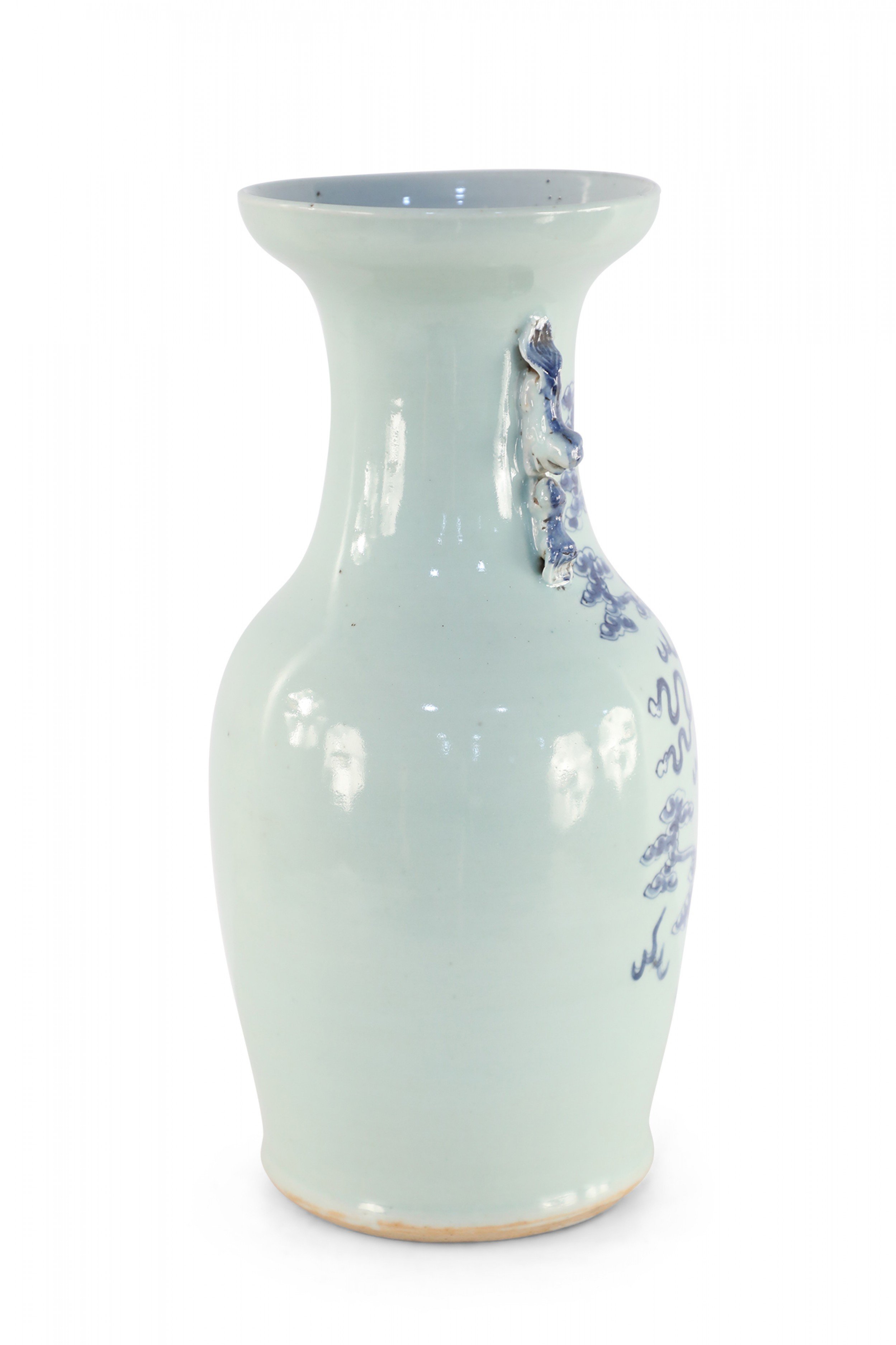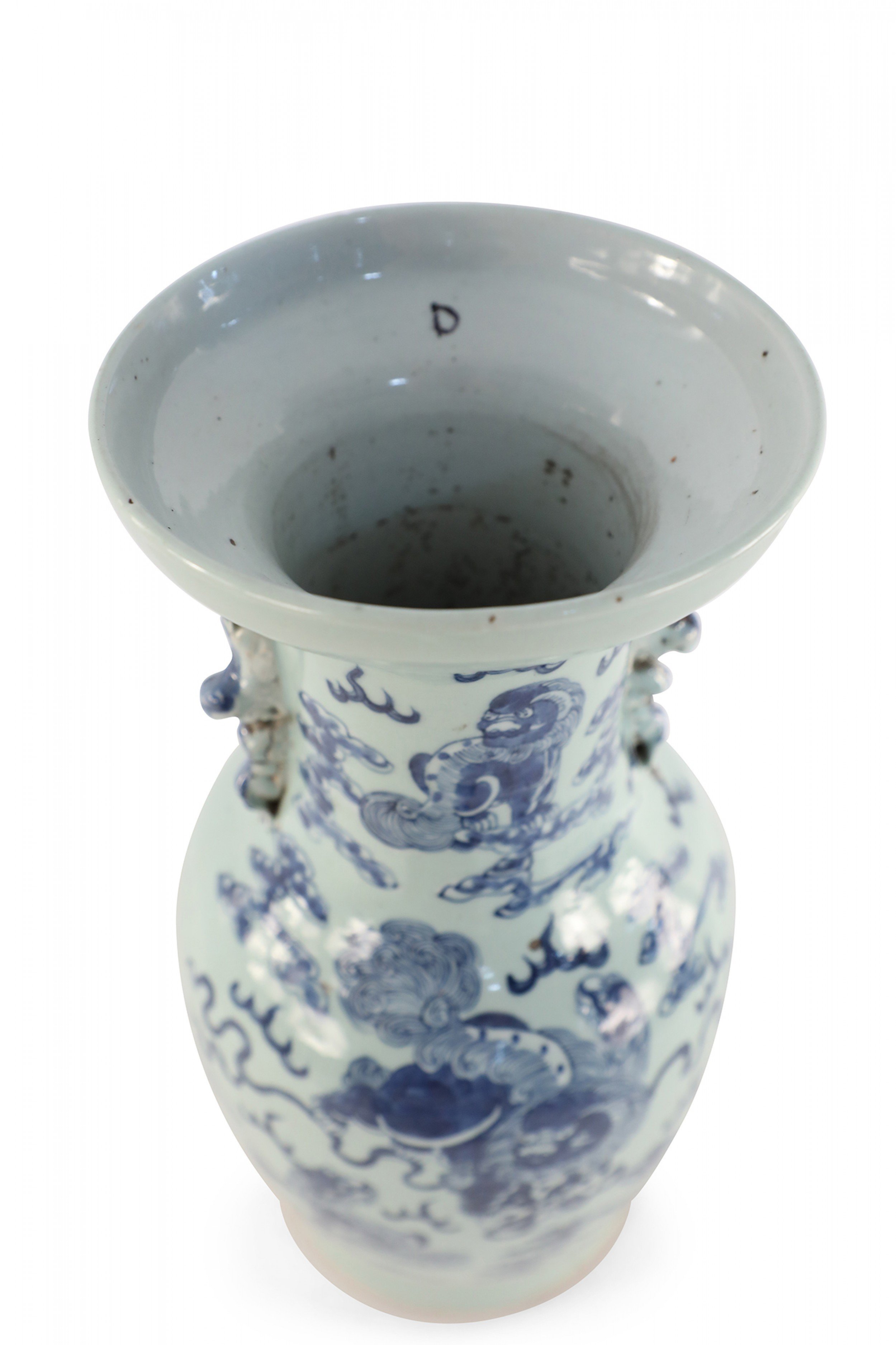 Antique Chinese (Late 19th Century) off-white porcelain urn decorated with blue foo dogs playing amid the clouds and accented in two pale blue scrolled handles along the neck.