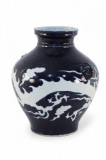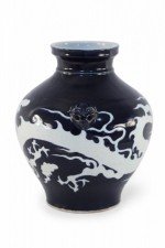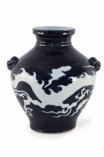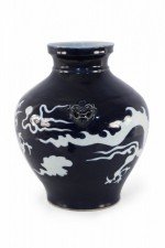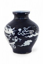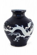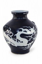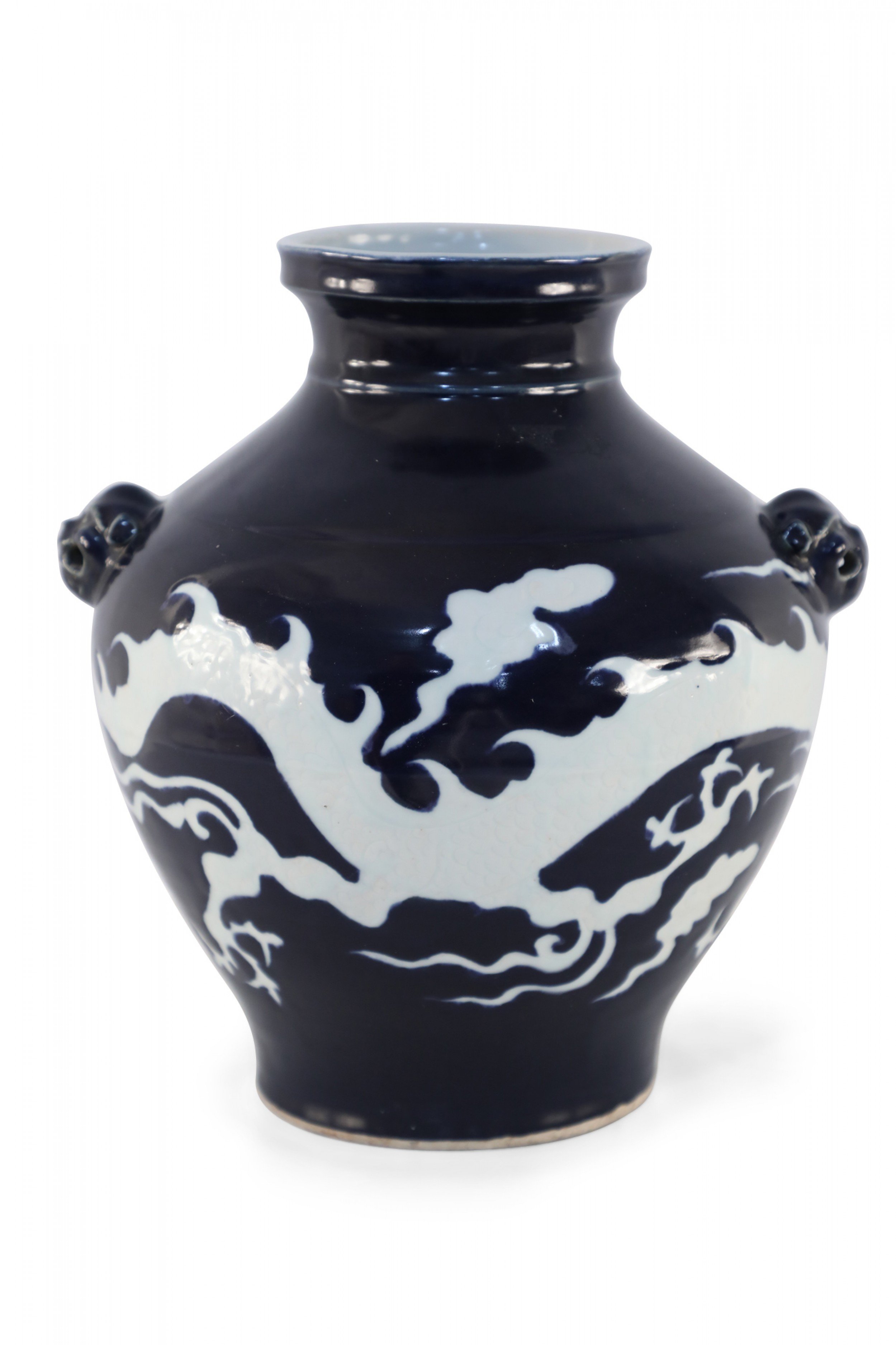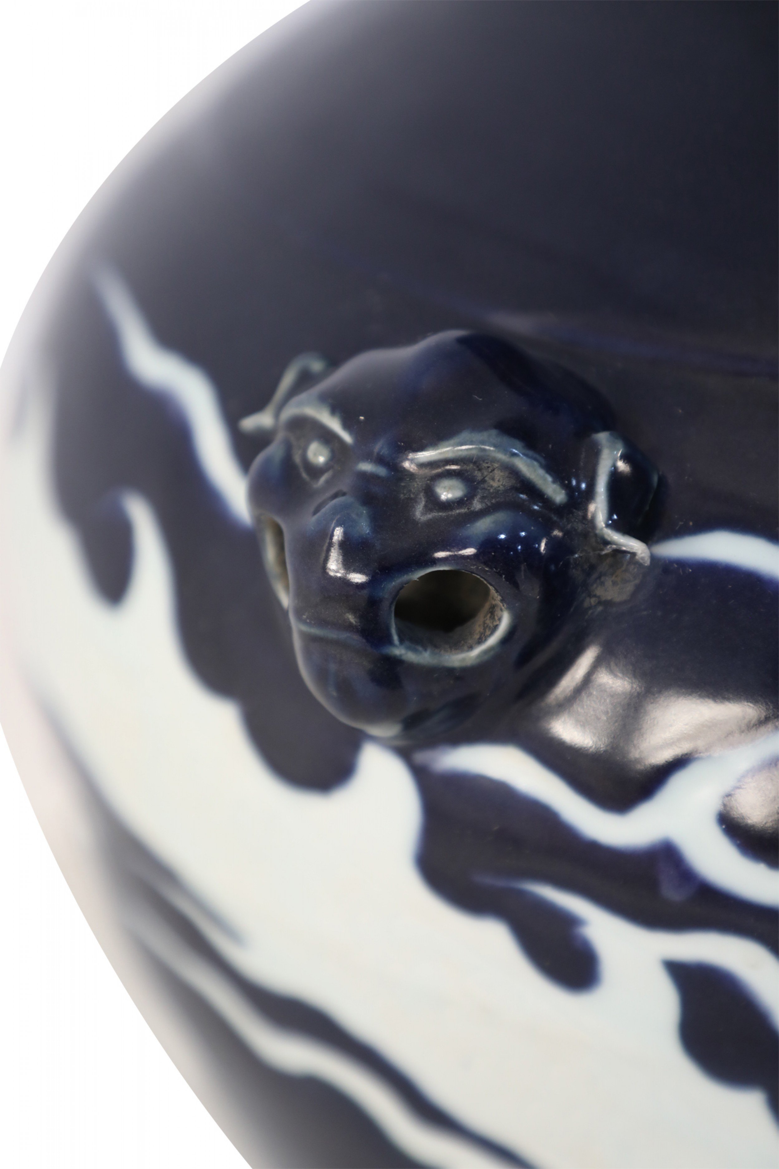 Chinese bulbous, dark blue porcelain pot crafted in the Yuan Dynasty style, wrapped in the dynamic white shape of a dragon and accented with foo dog ornamentation along the sides.