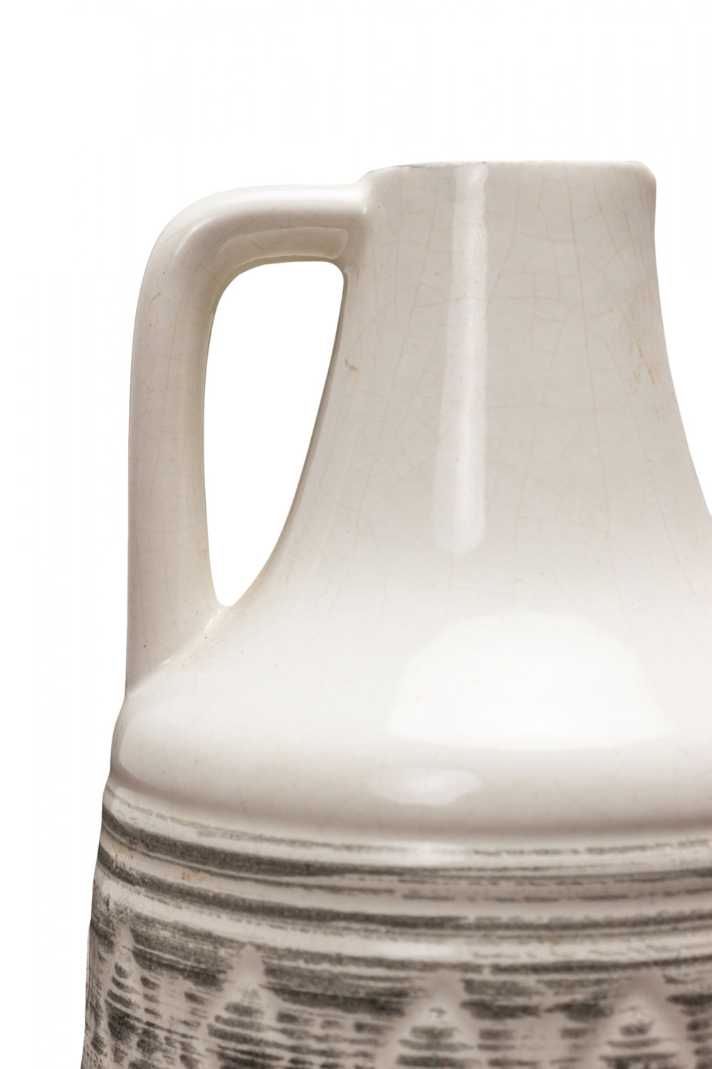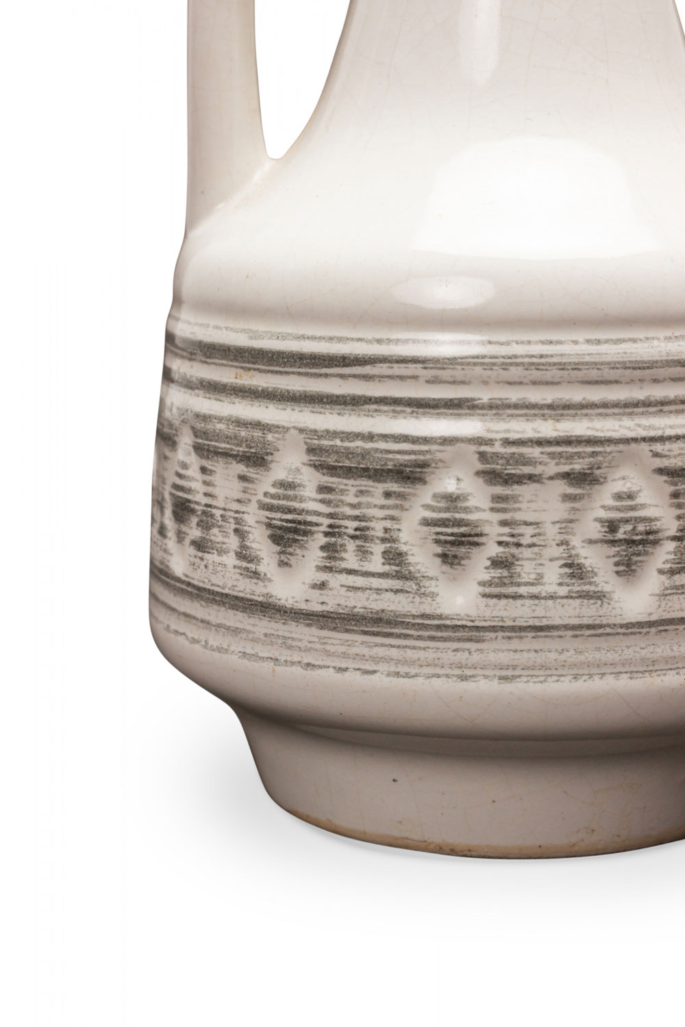 German Mid-Century ceramic pitcher with a diamond banded pattern created by several small incised black horizontal lines against a beige glazed ground. (numbered on bottom: 100).