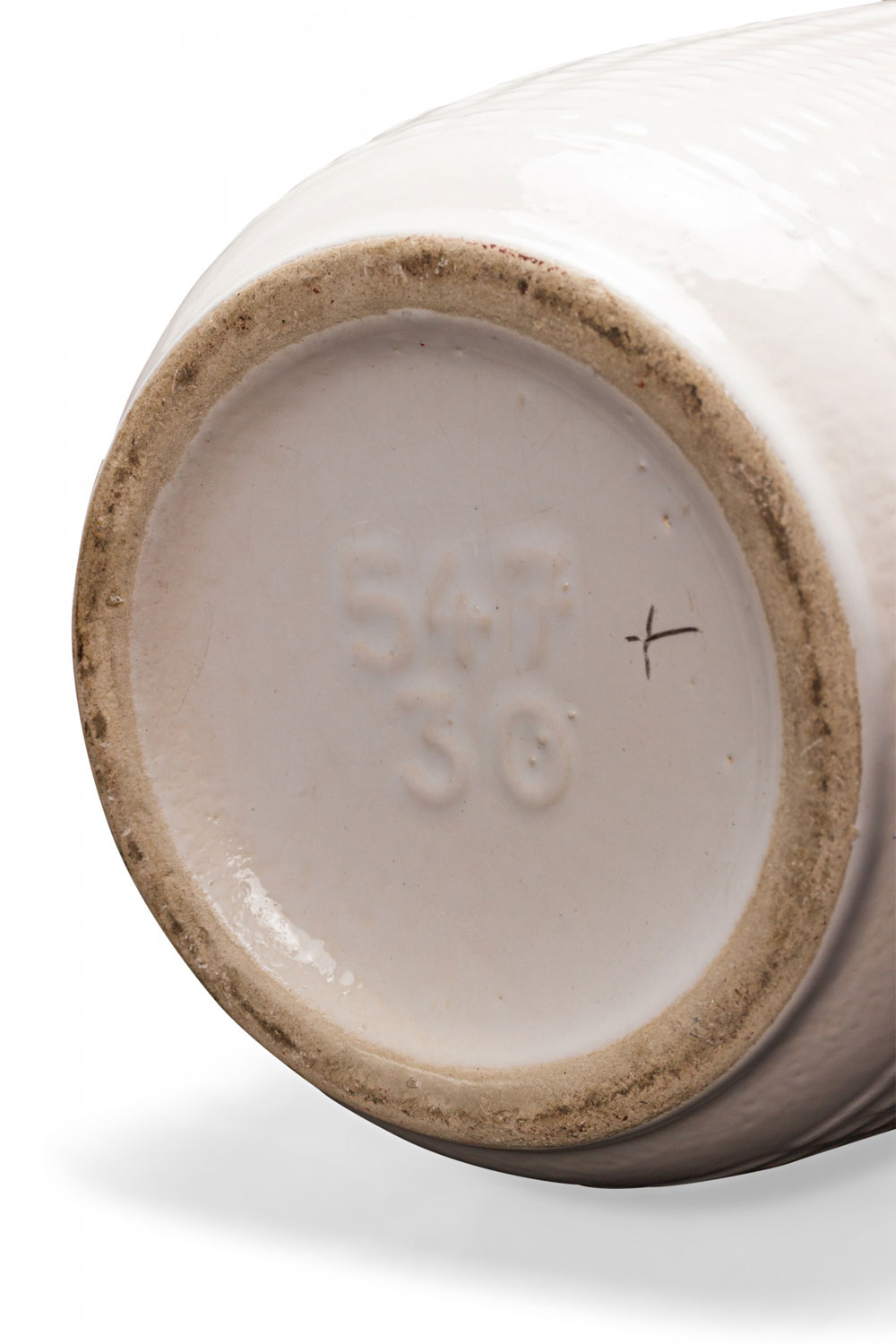 German Mid-Century white porcelain cylindrical vase with a raised irregular grid pattern. (numbered on bottom, 547-30).