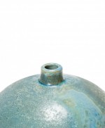 German Mid-Century round form ceramic vase with a narrow circular opening with a multi-tonal green and gold glaze.