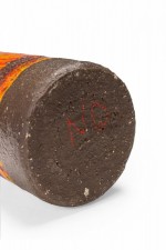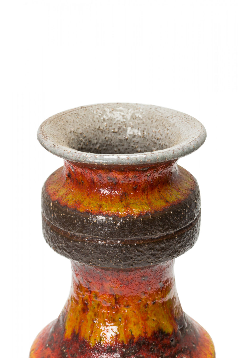 German Mid-Century cylindrical-form ceramic vase with a tapered neck with two larger rings below a flared opening with a textured and mottled fat lava-style glaze..