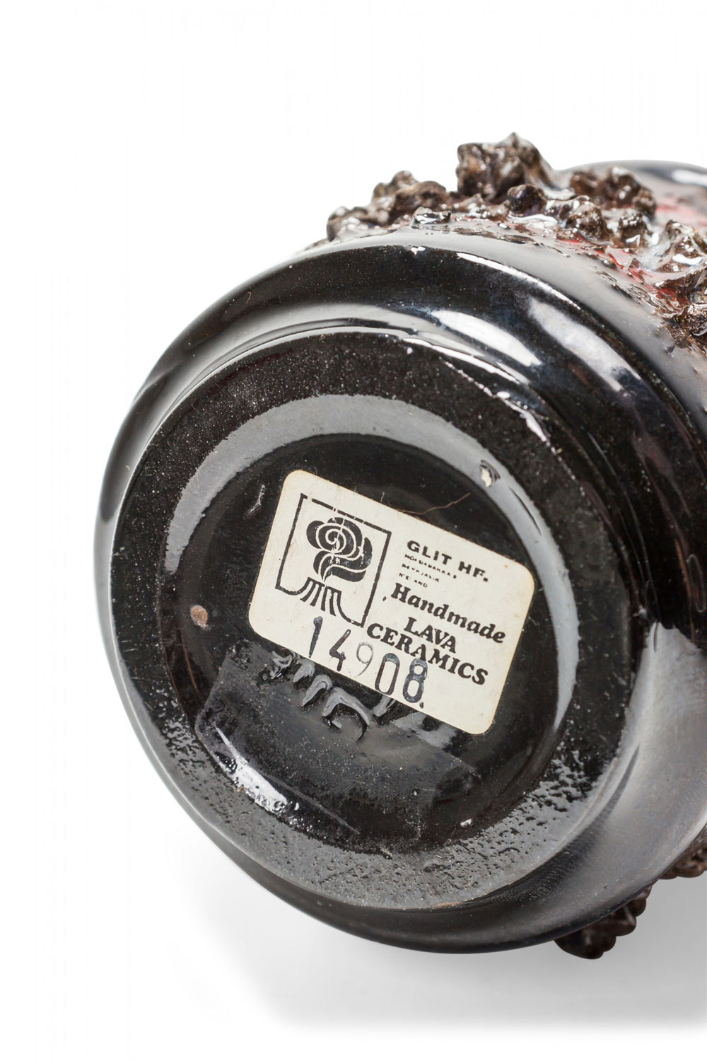 Icelandic Mid-Century ceramic pot with a textured dimensional band around the center and a red and black fat lava glaze. (label on bottom: GLIT HF REKJAVIK ICELAND, HANDMADE LAVA CERAMICS 14908).