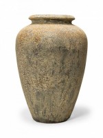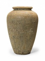 Contemporary monumental cast iron outdoor garden urn / vase with a tapered body that slopes gradually upward to a circular opening with a rounded lip (Similar urn: 062956).