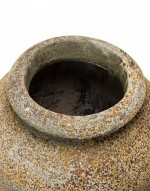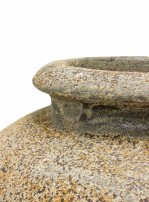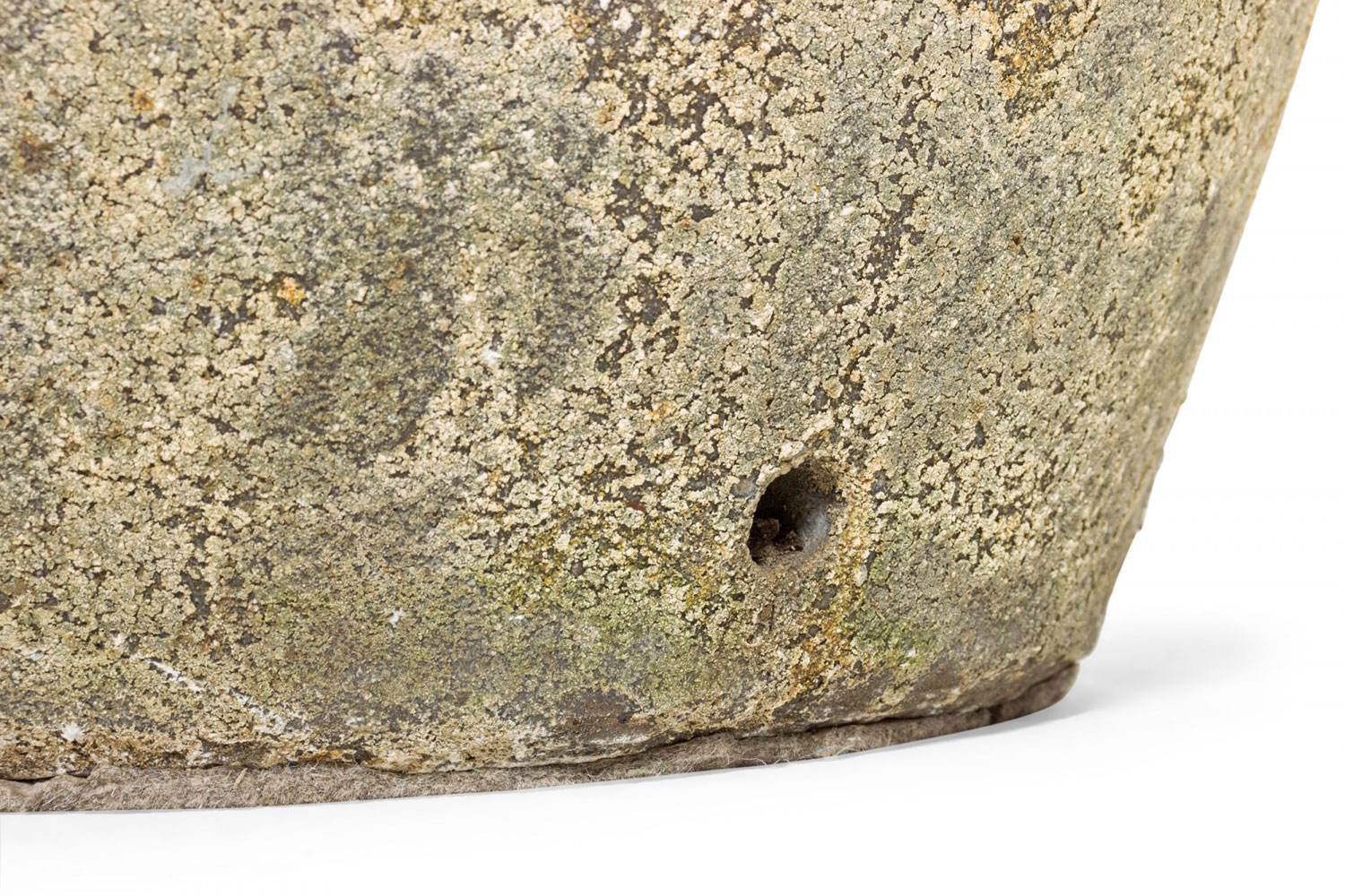Contemporary monumental cast iron outdoor garden urn / vase with a tapered body that slopes gradually upward to a circular opening with a rounded lip (Similar urn: 062956)