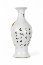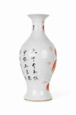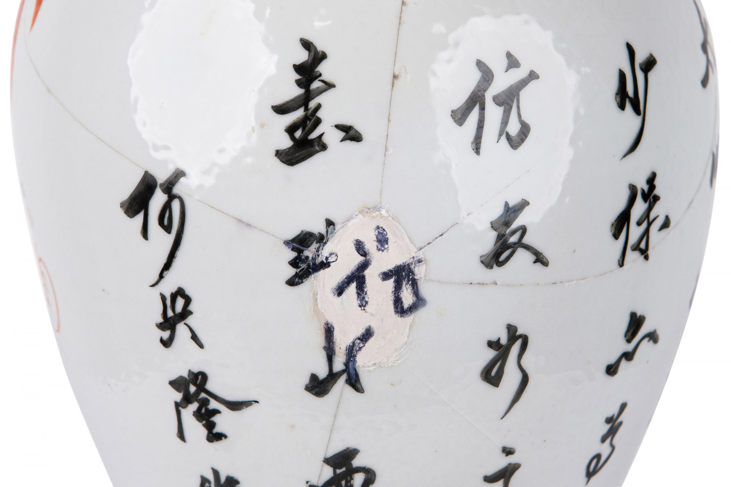 Chinese porcelain vase with an urn-shaped form and swirling orange foo dog designs on a grayish-beige background. (Previously broken and repaired. Matching in-tact vase: NWL2688).