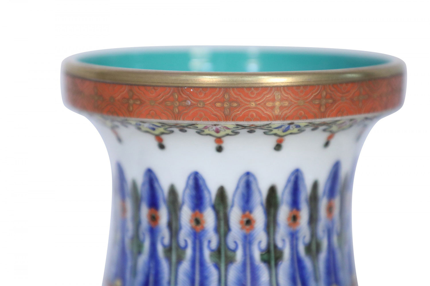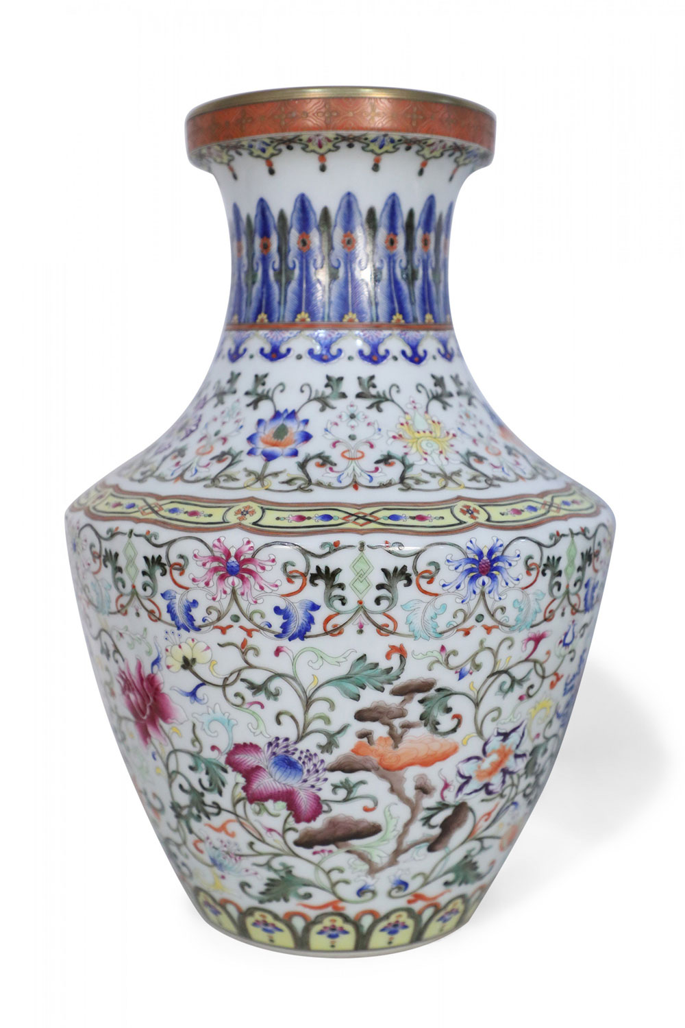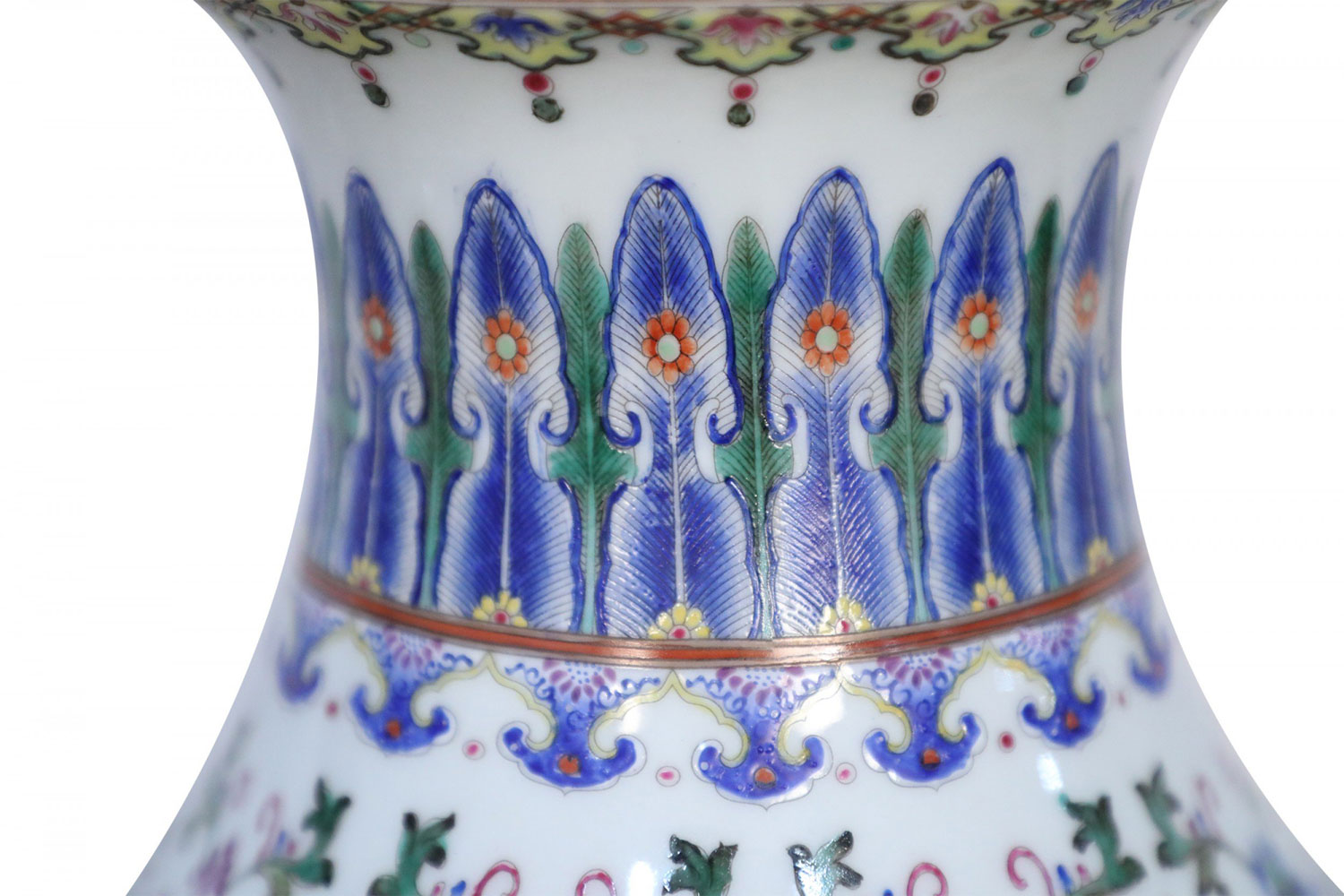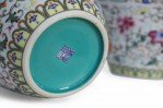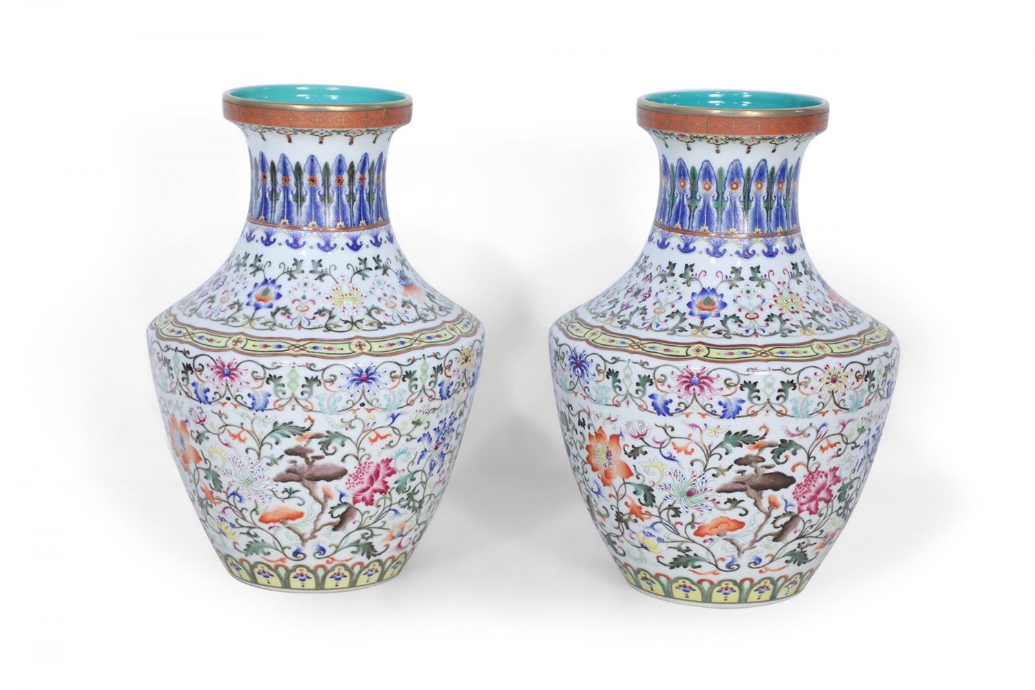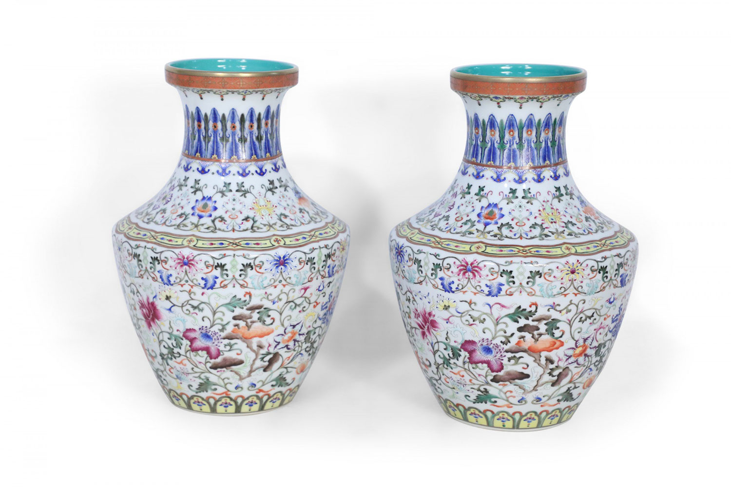 PAIR of Chinese vases decorated with all-over swirling floral motifs intercepted by yellow patterned bands at the bottom and top of the base and striking blue designs wrapping concaved necks, and turquoise blue interiors (mark on bottom, see photos)(PRICED AS PAIR).