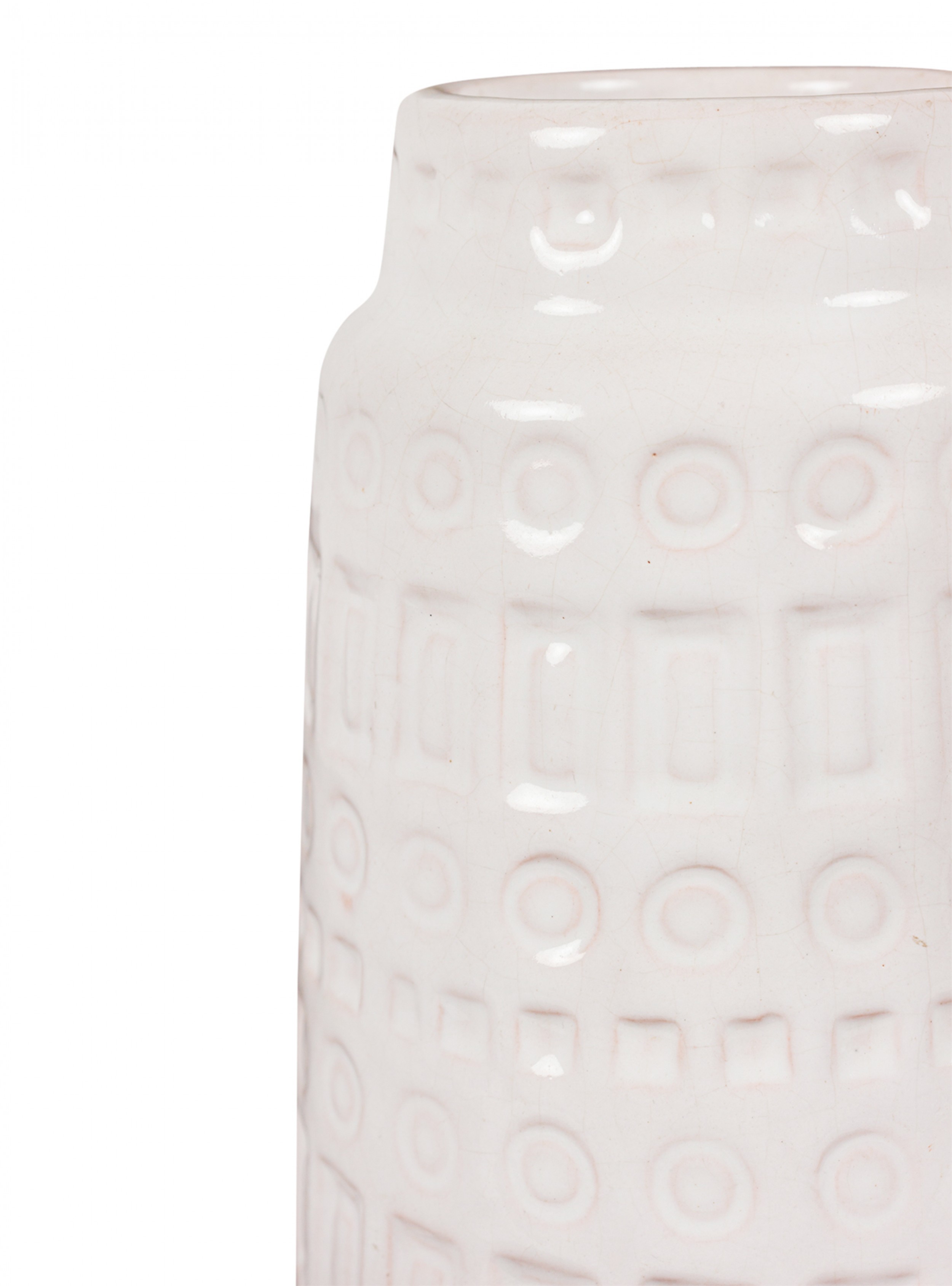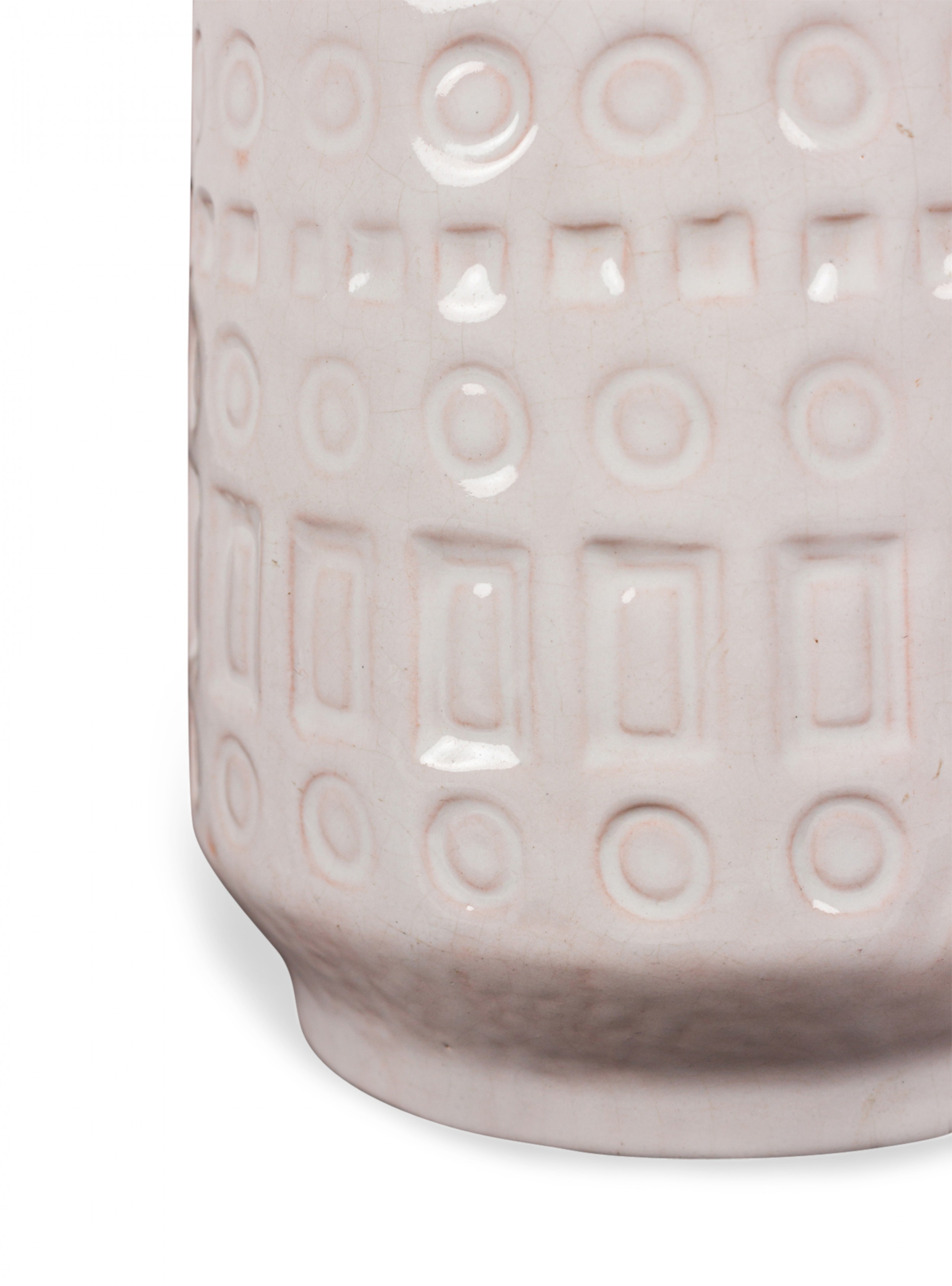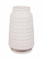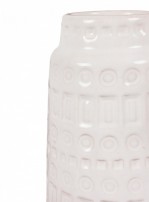 West German Mid-Century cylindrical white ceramic vase with an incised banded rectangle and circle 'Inka' pattern. (SCHEURICH, mark on bottom, W. GERMANY 260-18)