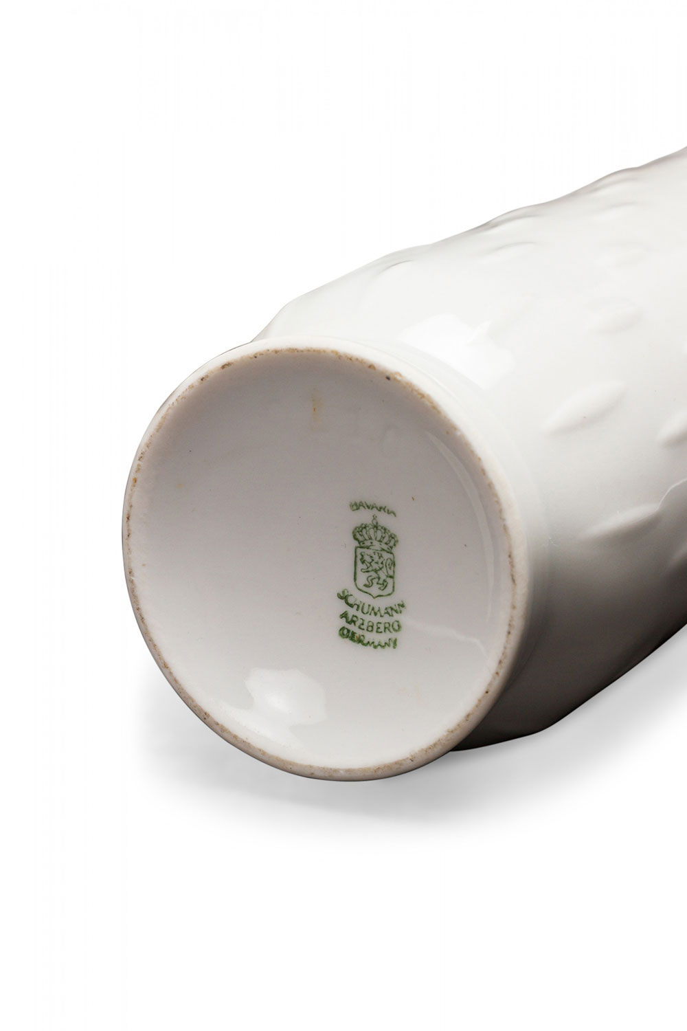 Bavarian German Mid-Century white porcelain cylindrical-form vase with a vertical raised dashed line pattern. (mark on bottom, SHUMANN ARZBERG BAVARIA GERMANY).