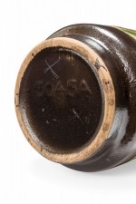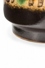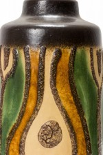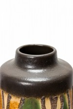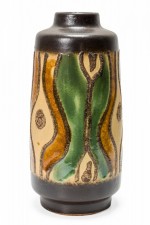 German Mid-Century cylindrical-form ceramic vase with a brown, green, and beige organic wavy shape patter around the body with a band of deep brown at the base and mouth. (VEB HALDENSLEBEN, numbered on the bottom, 3045A)