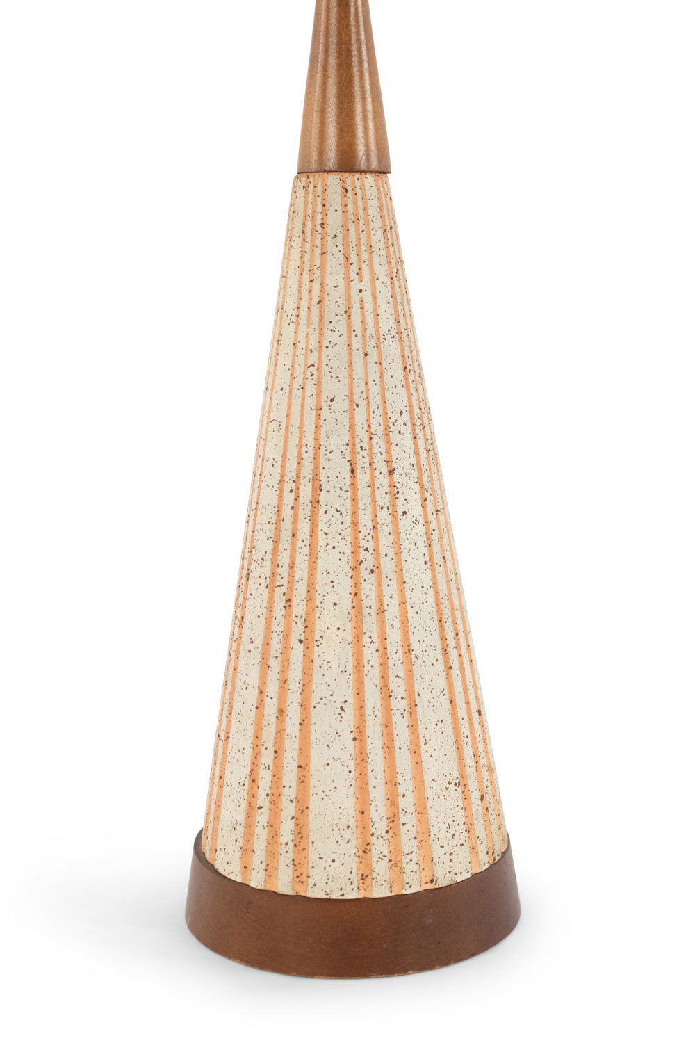American Mid-Century (1960s) beige cone shaped ceramic table lamp with an orange fluted design resting on a round wood base with a similar tapered top.