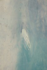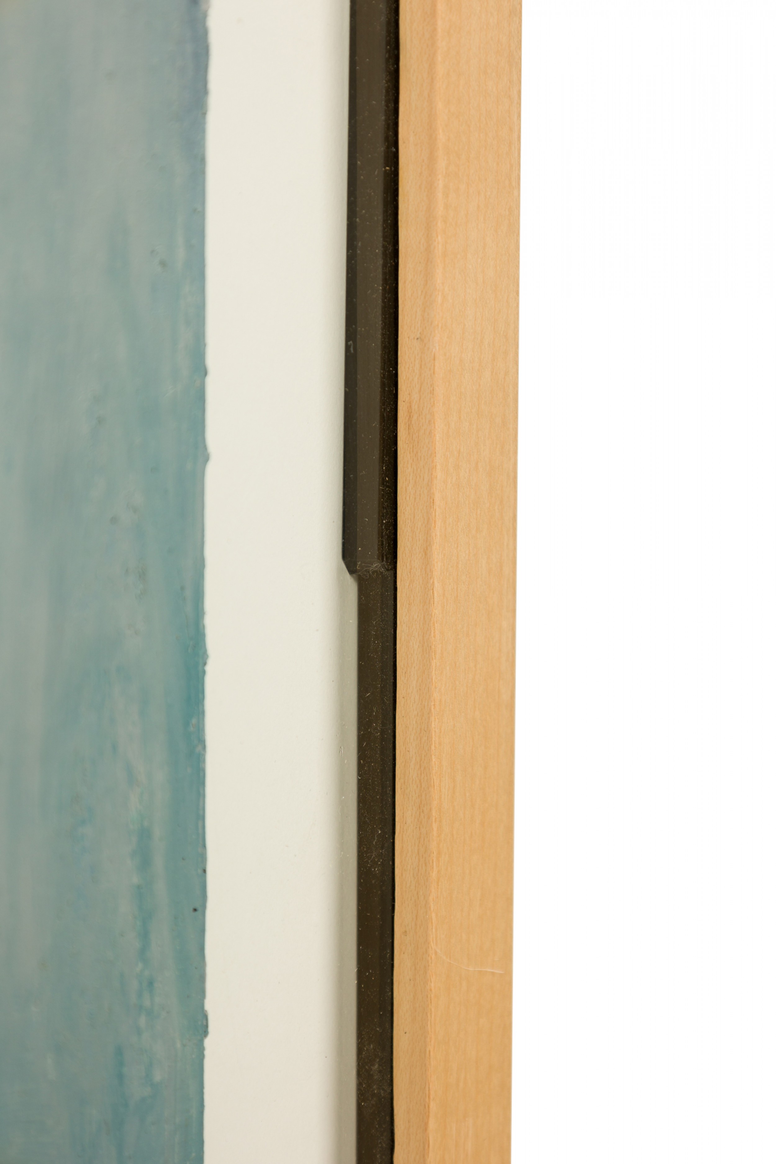 American Post-War Design abstract art, oil painting with shades of pale blue in a pine frame.