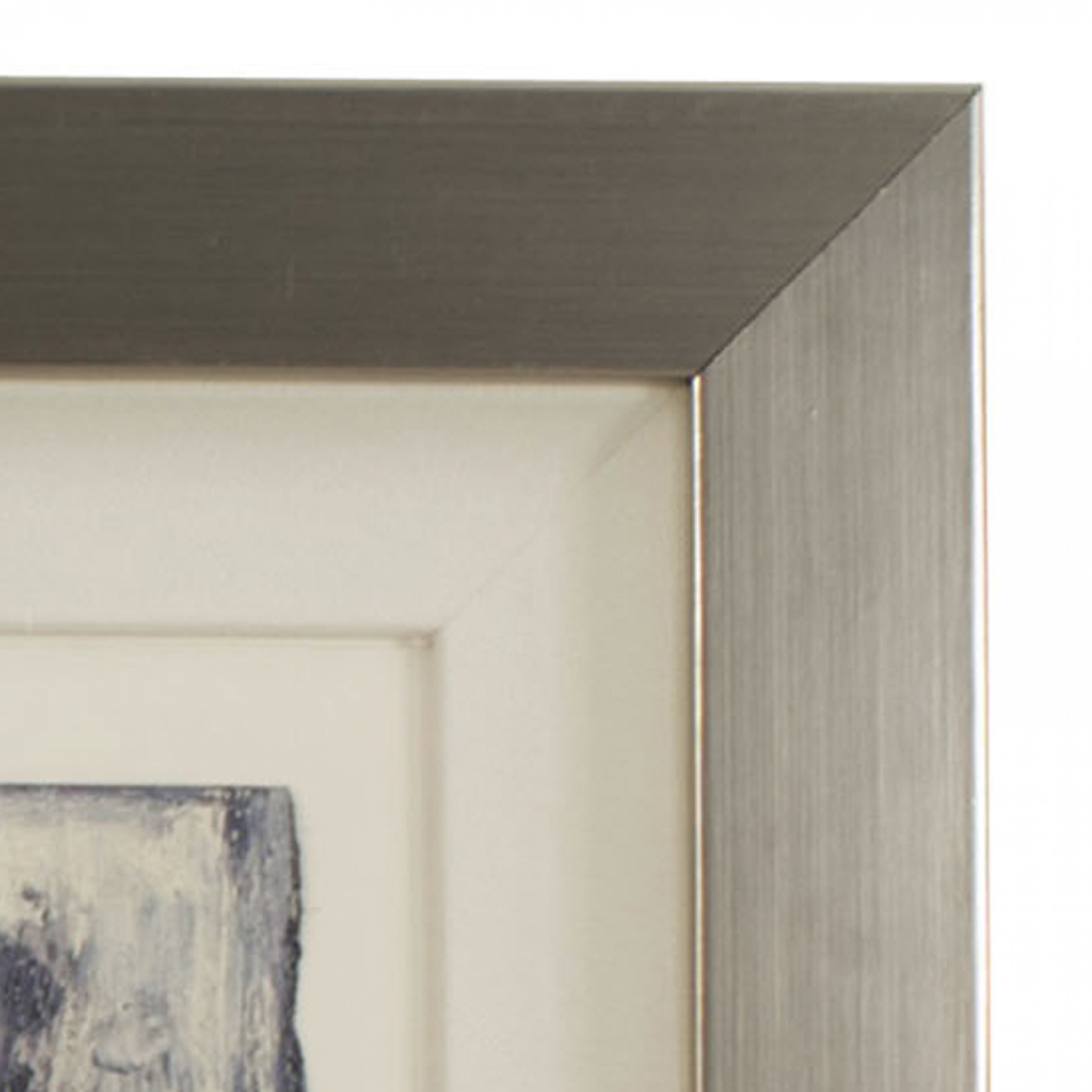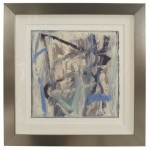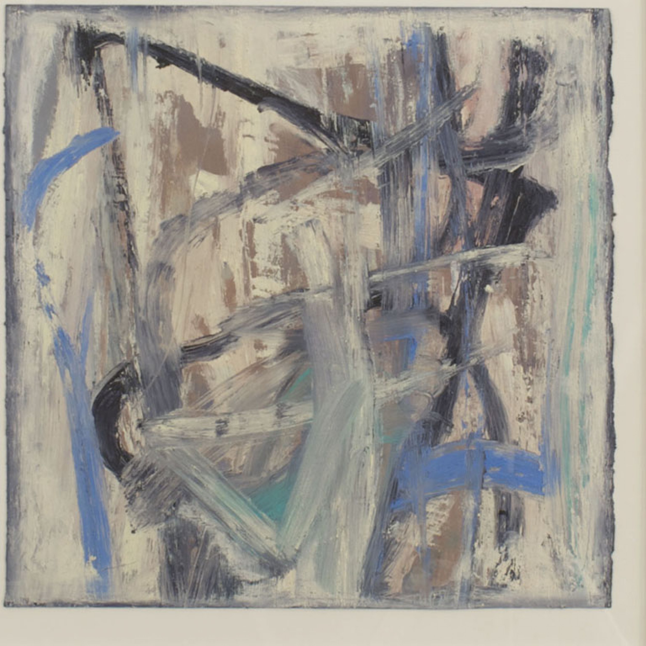 American Post-War Design abstract art, oil painting on paper with shades of multicolored blue & beige in a silver frame. (One of series of 4: BLO010A-D).