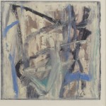 American Post-War Design abstract art, oil painting on paper with shades of multicolored blue & beige in a silver frame. (One of series of 4: BLO010A-D)