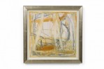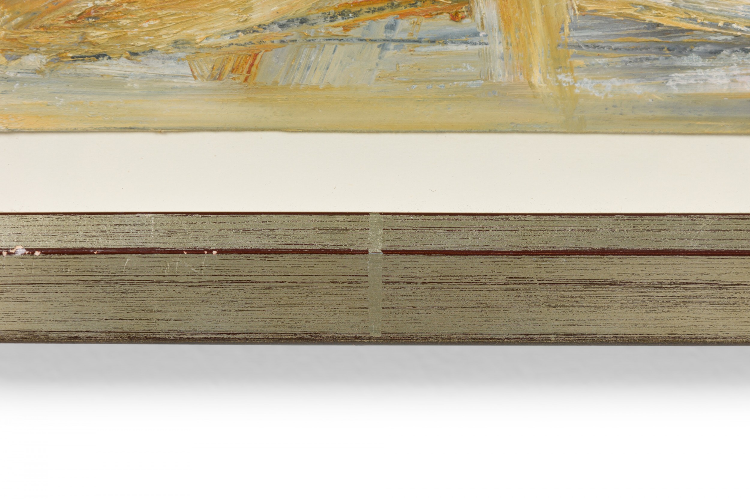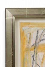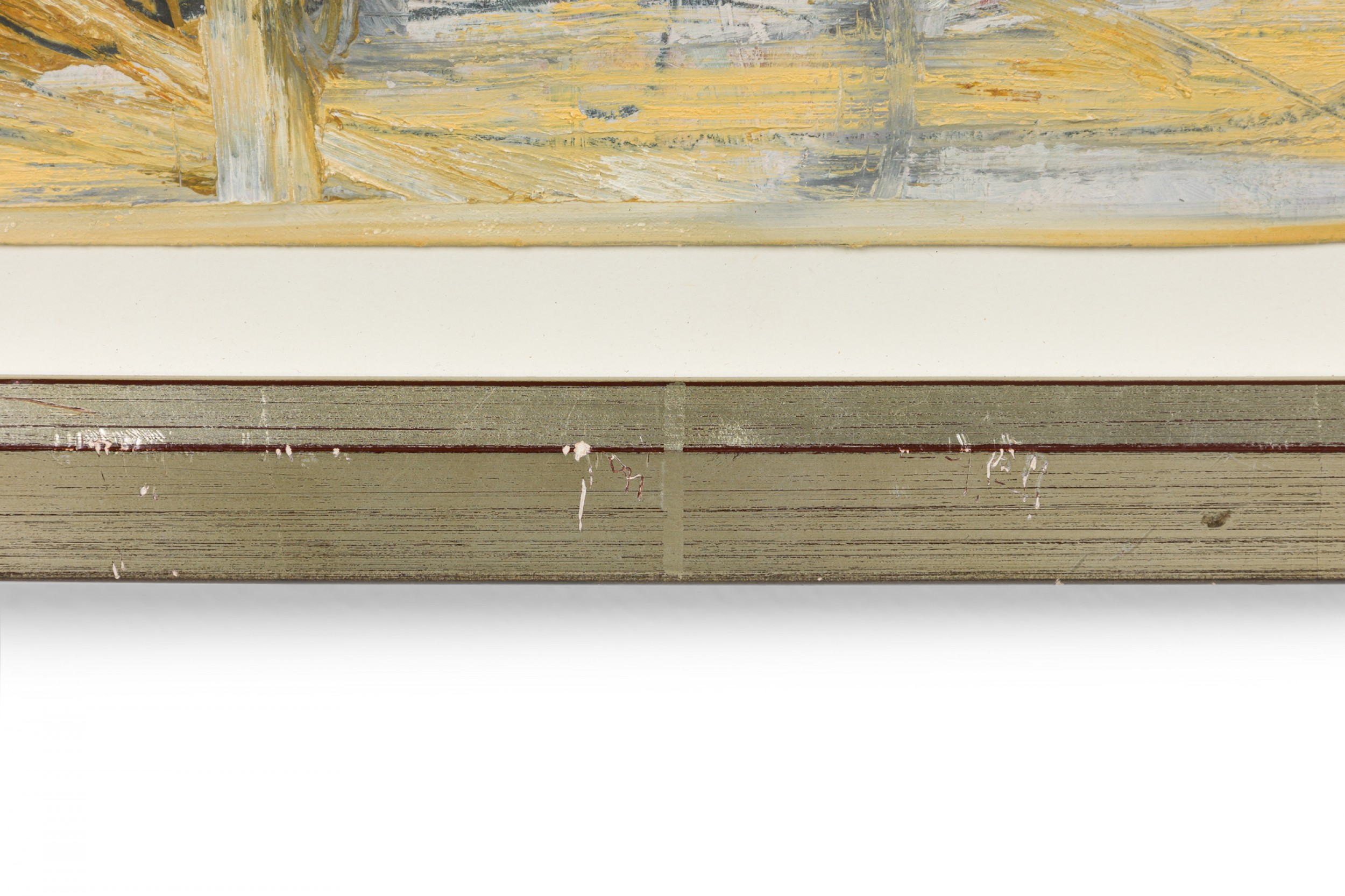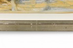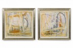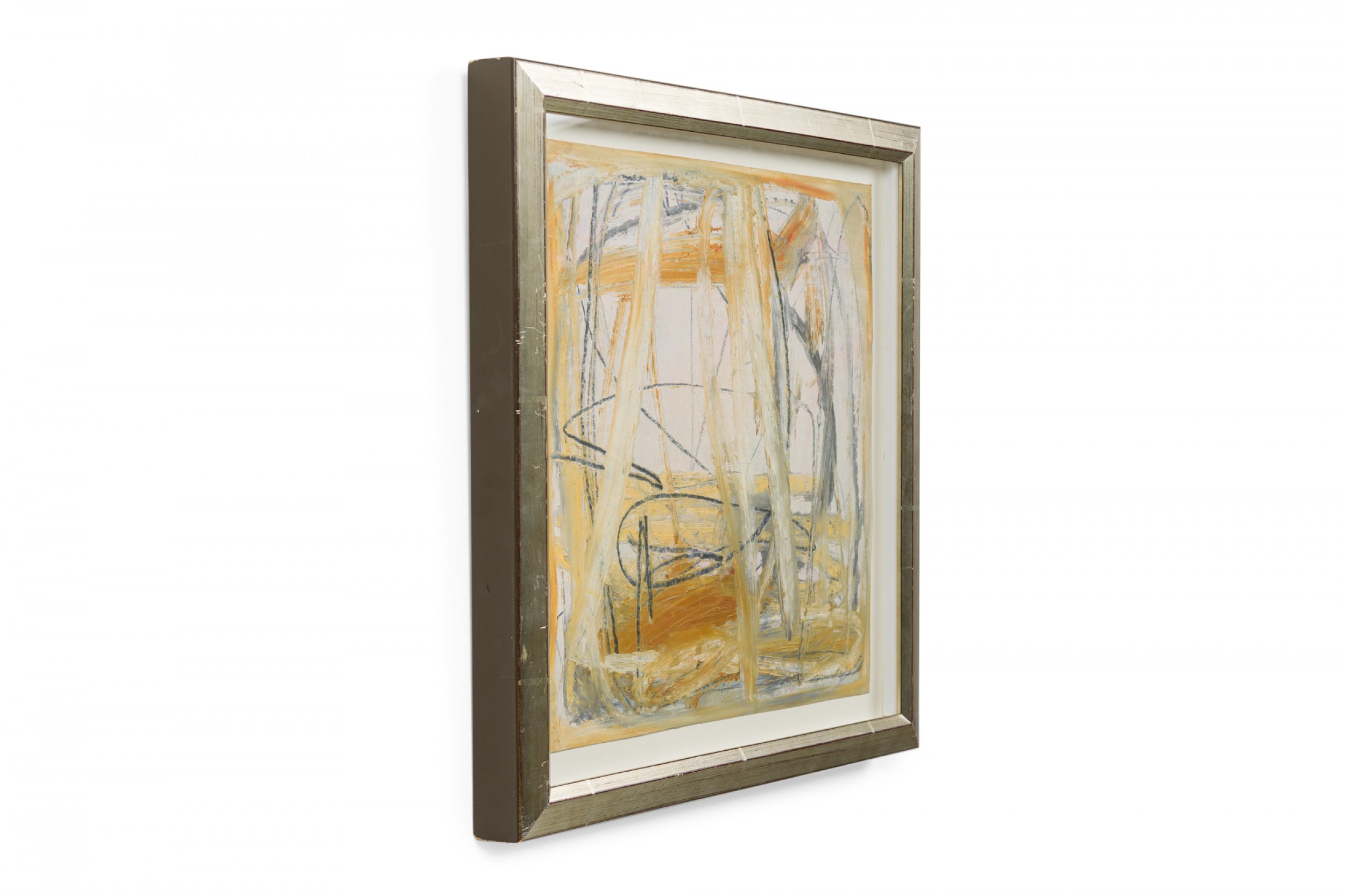 2 American Post-War Design abstract art, oil painting on paper with shades of green, yellow, and ochre in a silver frame. (PRICED EACH)