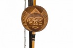 American Indian rustic decorative bow and arrow with a decorative gourd rattle with painted face in the center of the arrow..