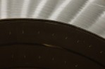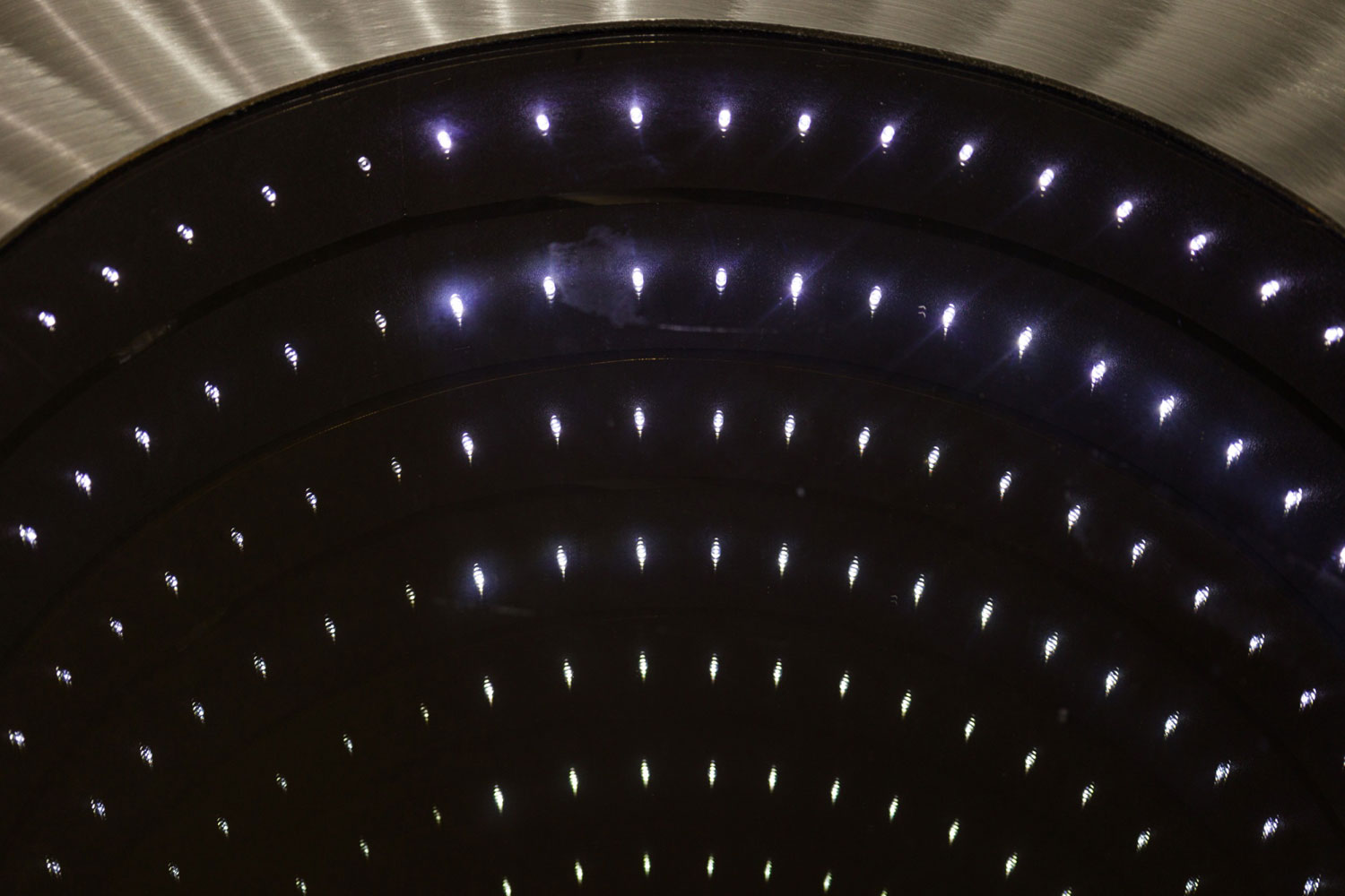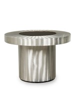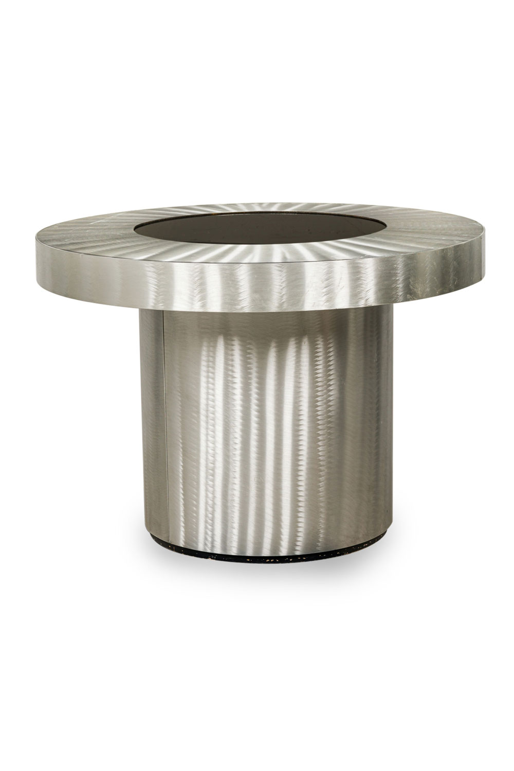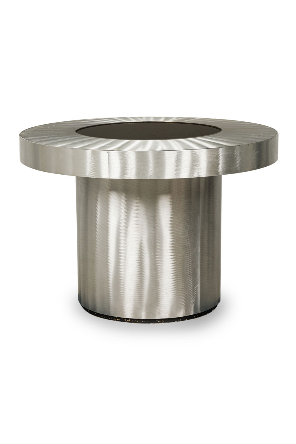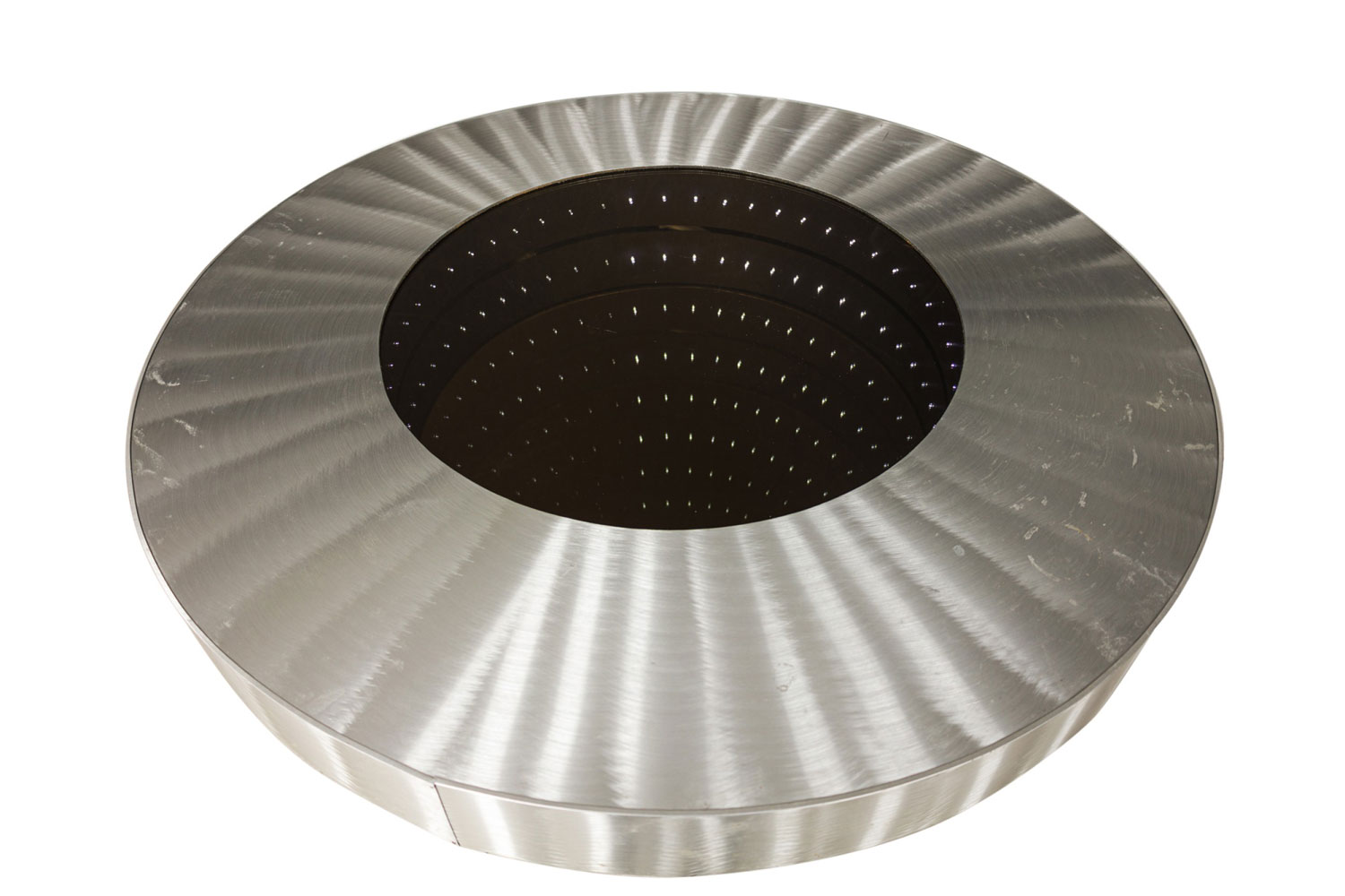 Contemporary American circular infinity center table with a brushed stainless steel cylindrical base and top with a central black glass panel with interior lights and mirrors to create an infinity light effect.