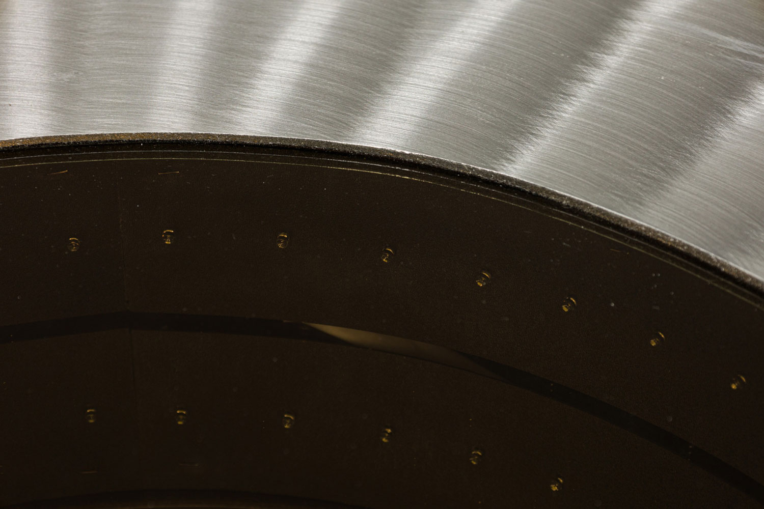Contemporary American circular infinity center table with a brushed stainless steel cylindrical base and top with a central black glass panel with interior lights and mirrors to create an infinity light effect..