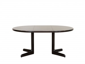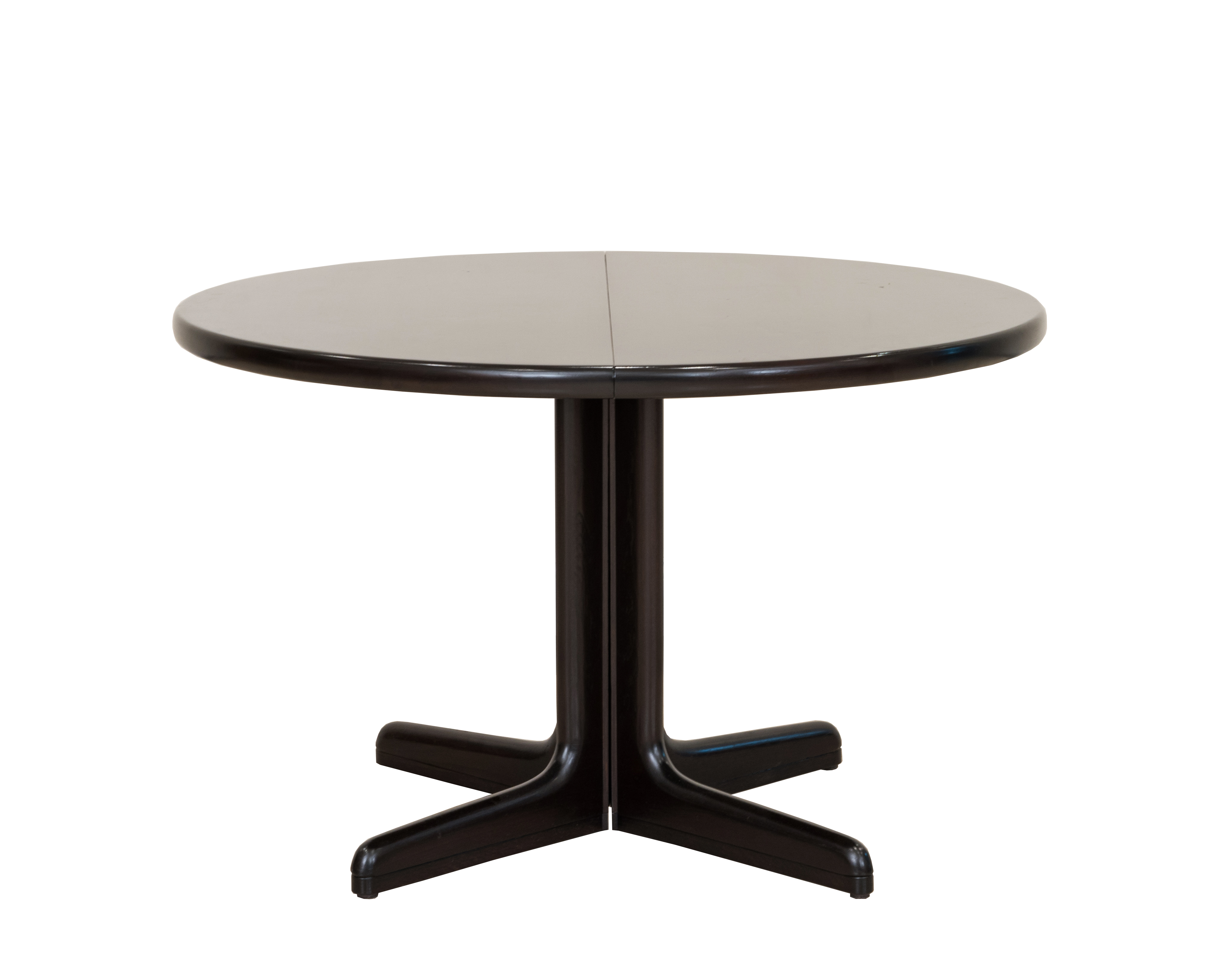 Contemporary black ebonized wooden round dining table with a pedestal base on 4 extended feet that open to support leaves (2 leaves- 21 inches each) (Related Item: 061108)