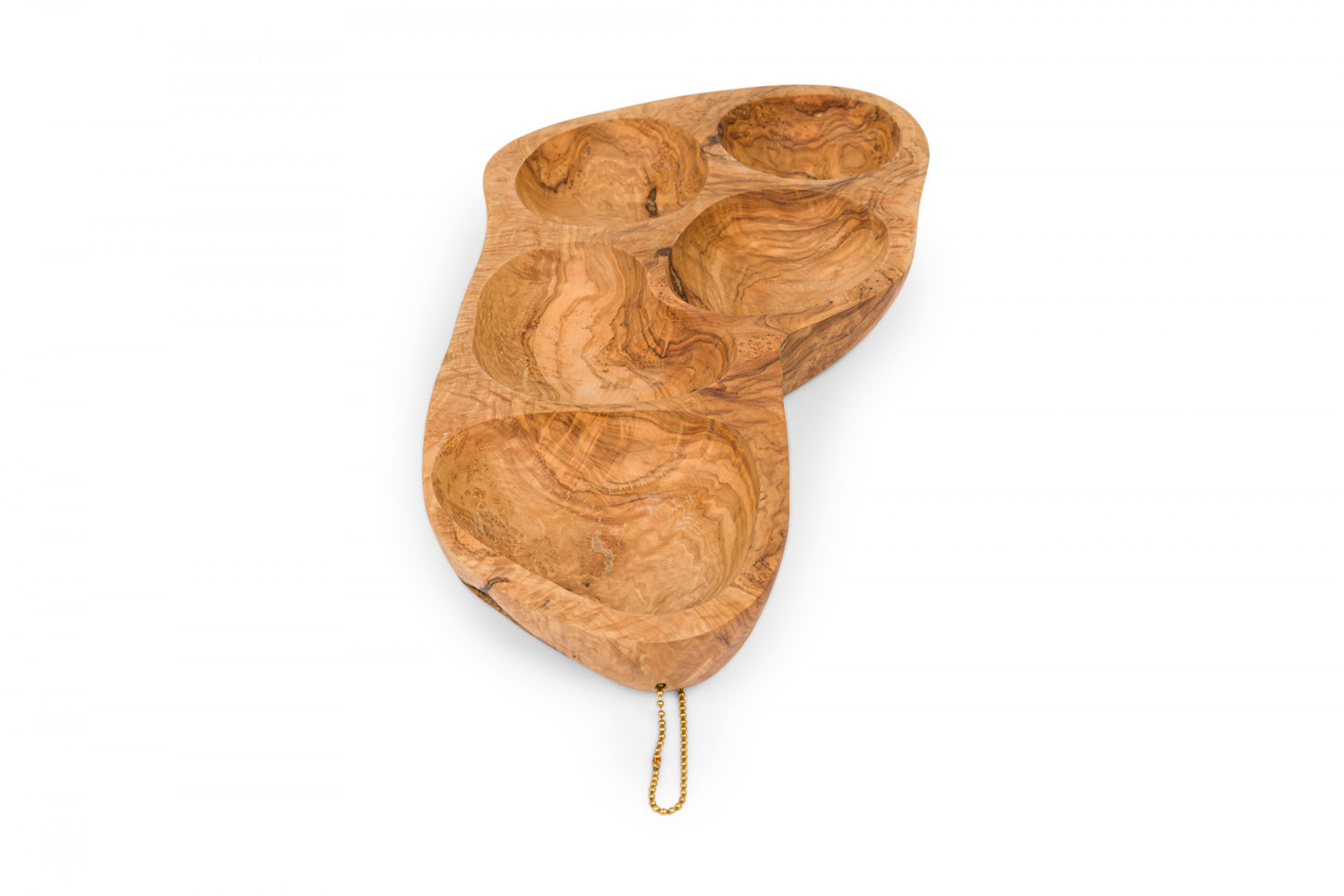 Contemporary modernist olive wood tray in an organic shape with 5 compartments..