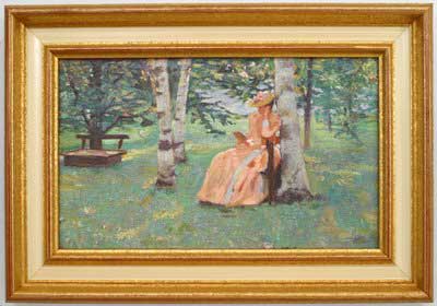 Copy of an impressionist landscape painting titled "Reverie" showing a woman reading a book