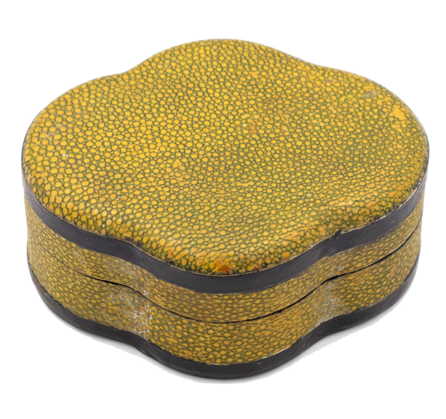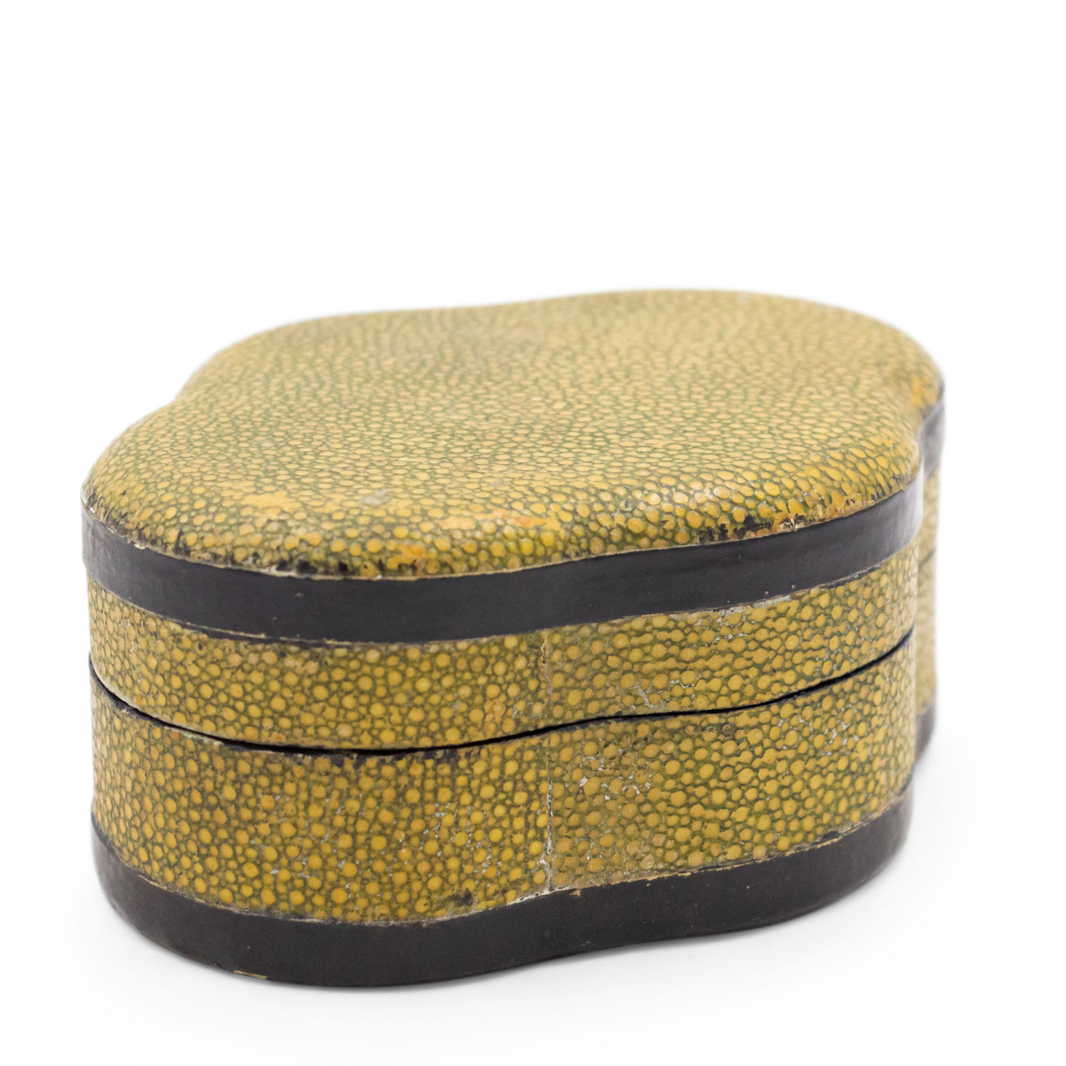 English Art Deco yellow/green shagreen ovoid shaped box with ebonized trim..