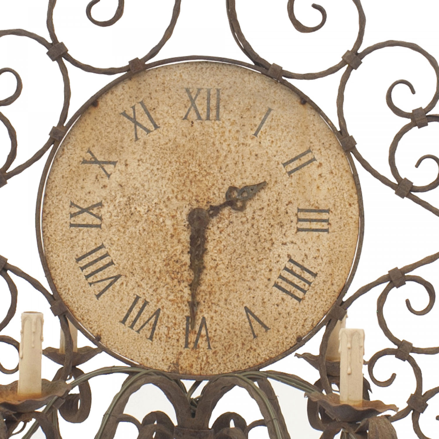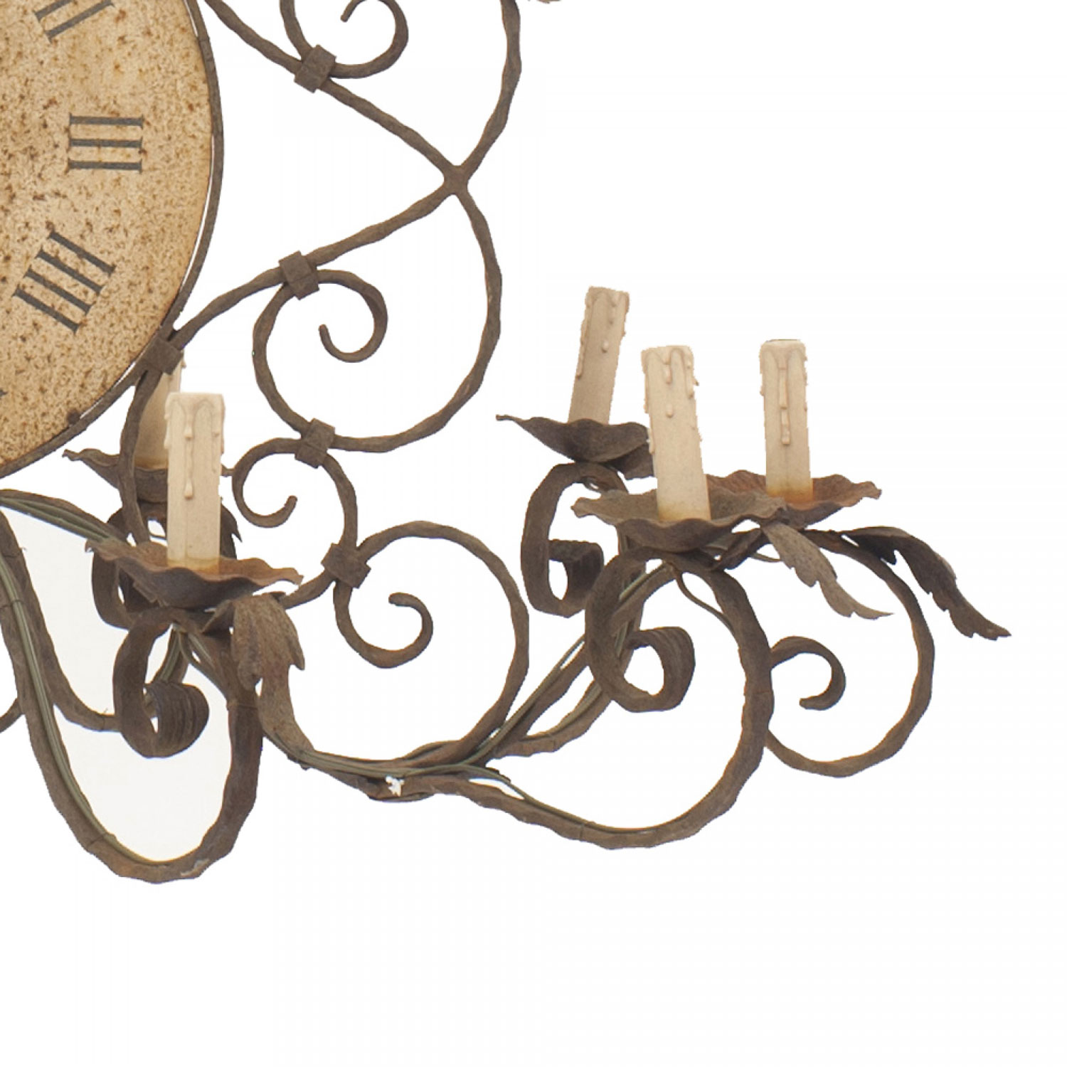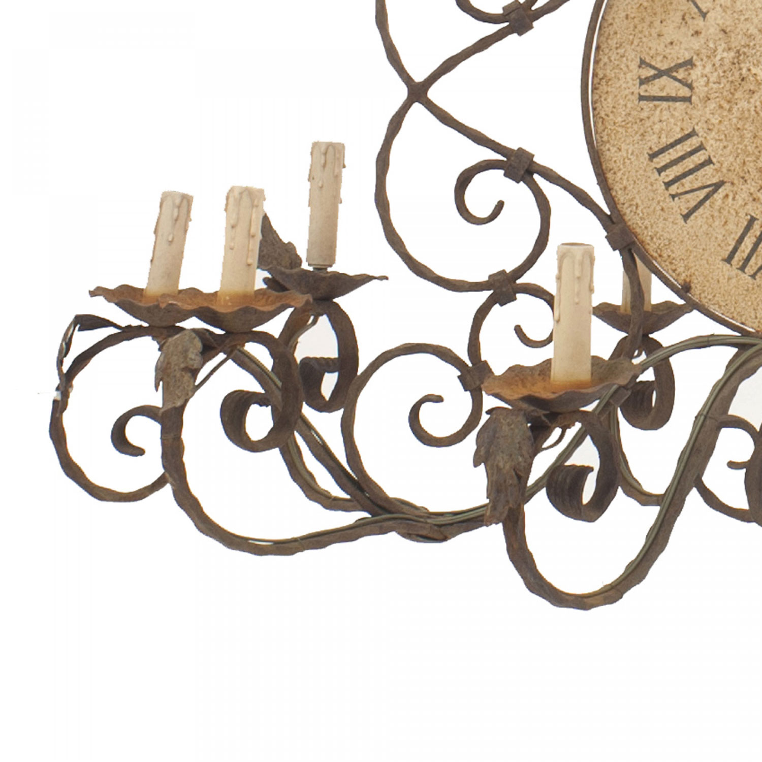 English Country Rustic wrought iron chandelier with 10 scroll arms emanating from a painted central clock face surrounded by a scroll design