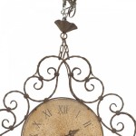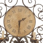 English Country Rustic wrought iron chandelier with 10 scroll arms emanating from a painted central clock face surrounded by a scroll design.
