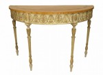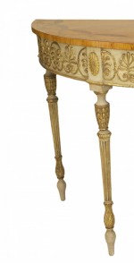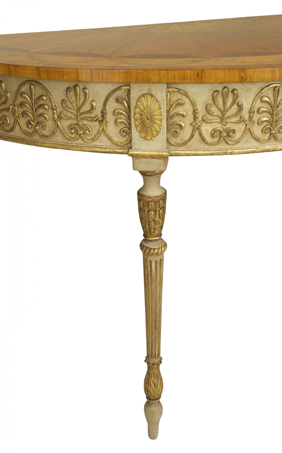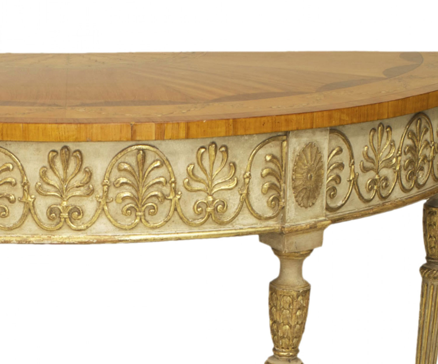 English George III (circa 1780) cream painted and parcel-gilt carved and trimmed demilune console table with a satinwood and inlaid top having a festoon and sunburst design. (Manner of Robert Adam)