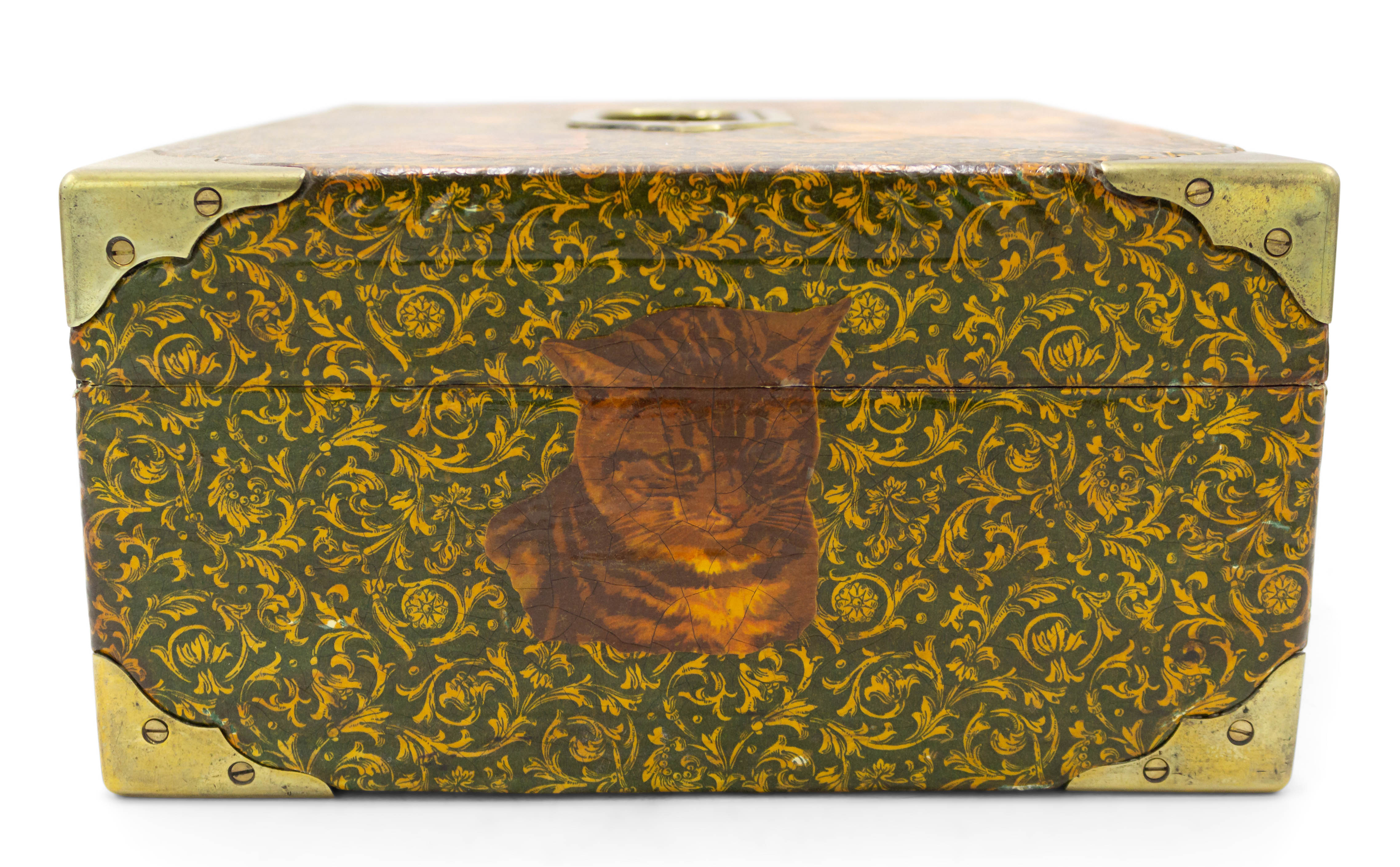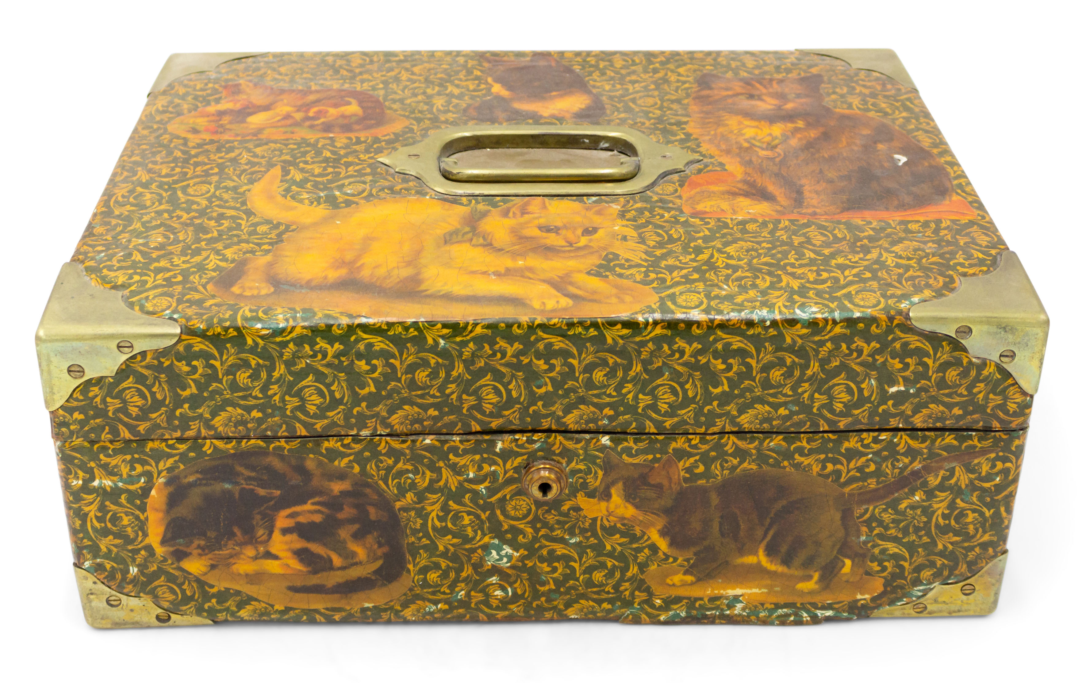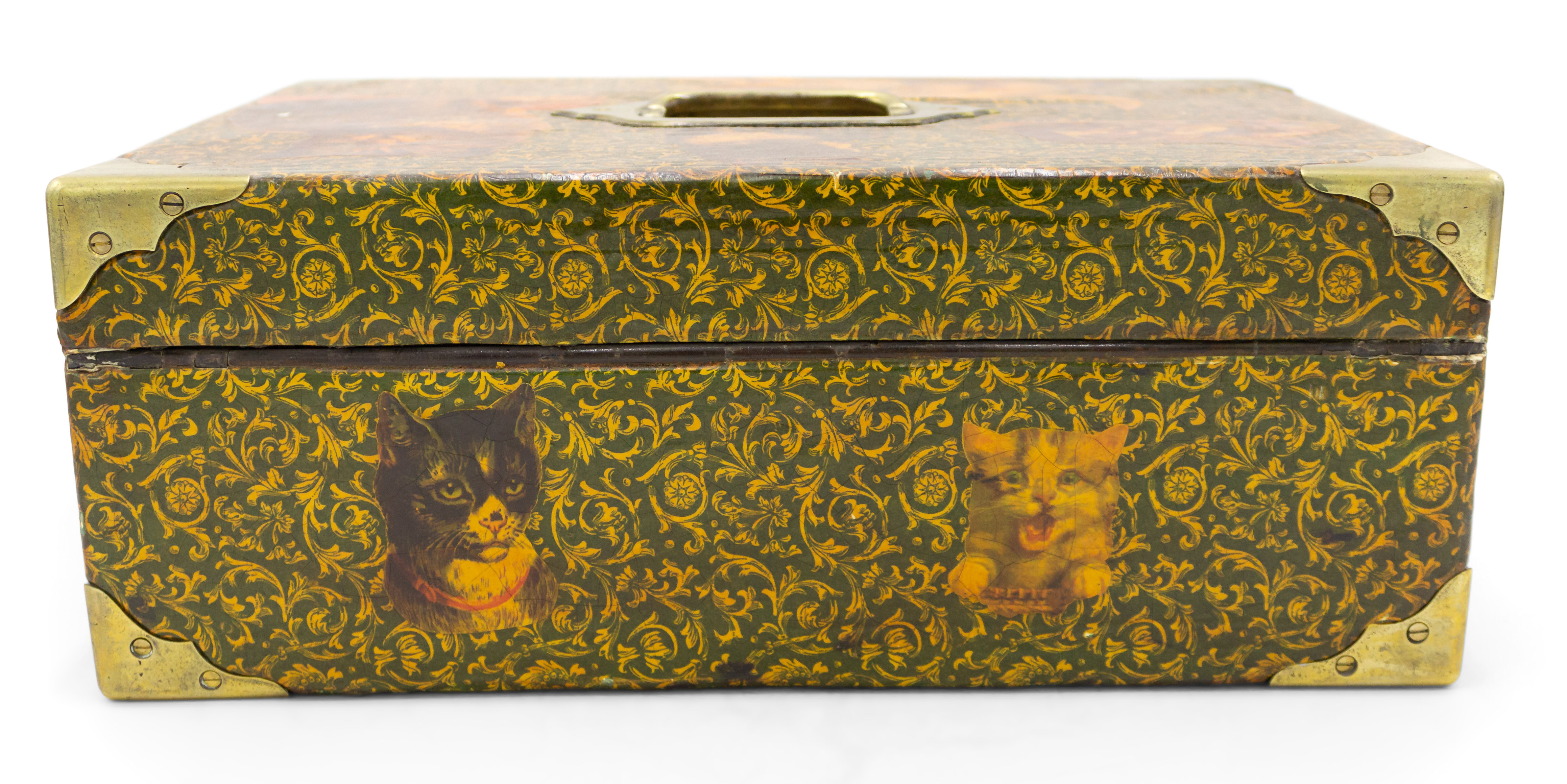 English Victorian-style (20th Century) decoupage decorated box with cat design and brass handle top and corner trim