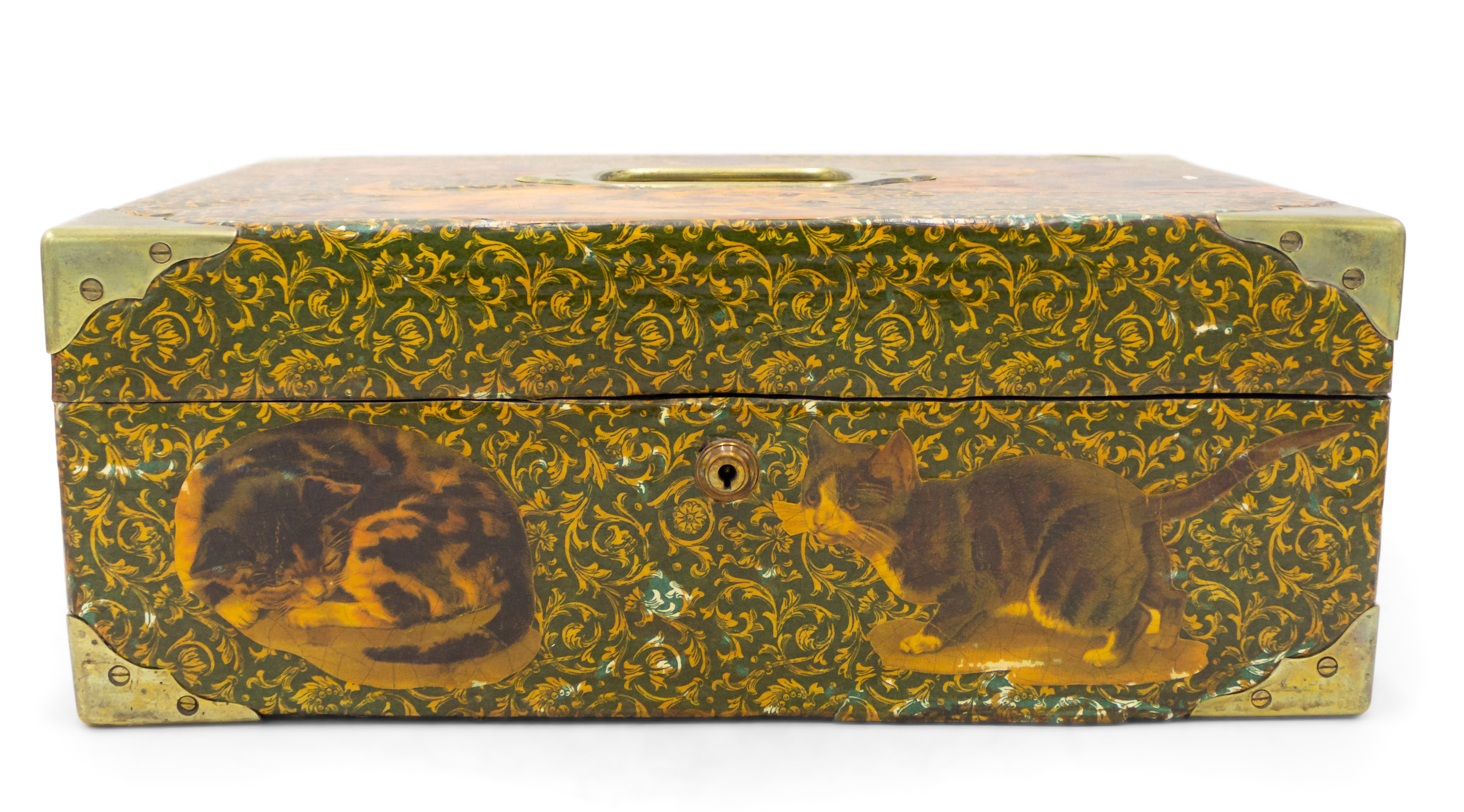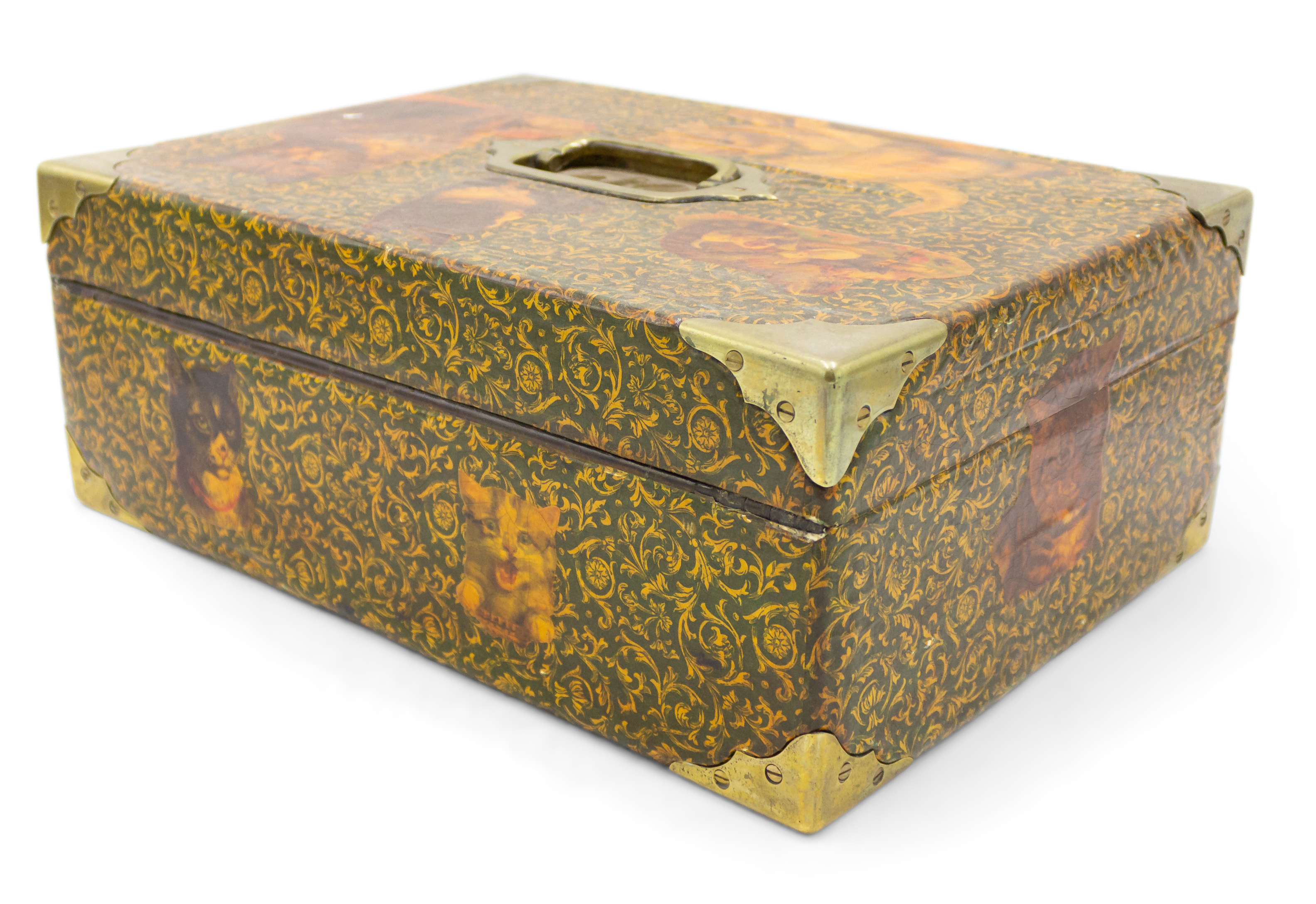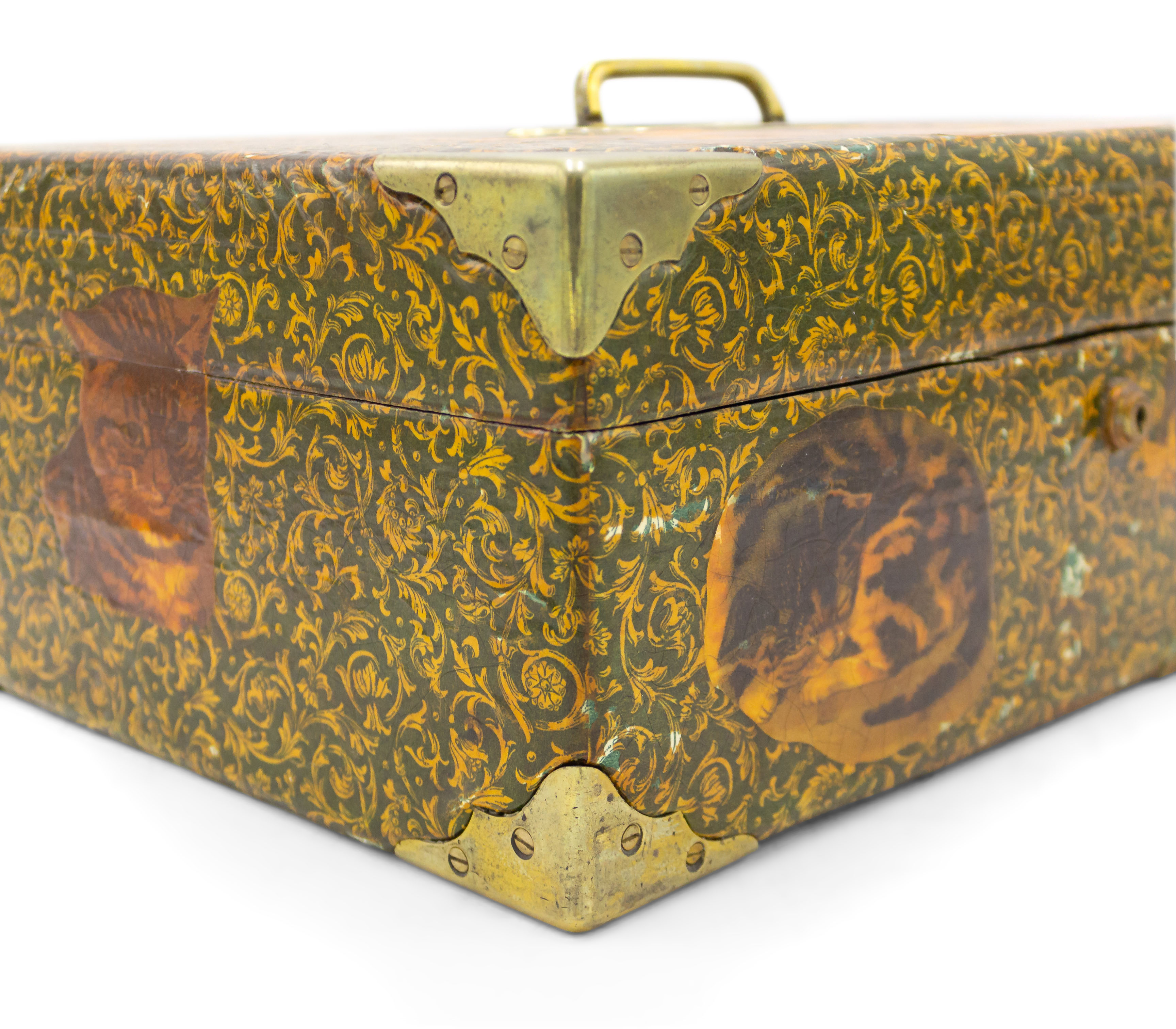 English Victorian-style (20th Century) decoupage decorated box with cat design and brass handle top and corner trim