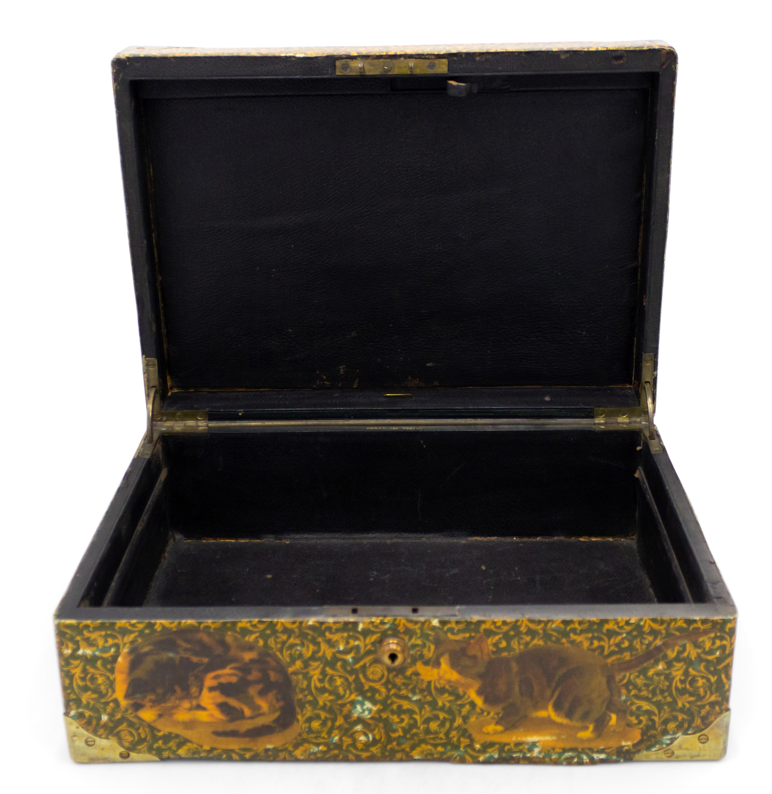 English Victorian-style (20th Century) decoupage decorated box with cat design and brass handle top and corner trim.