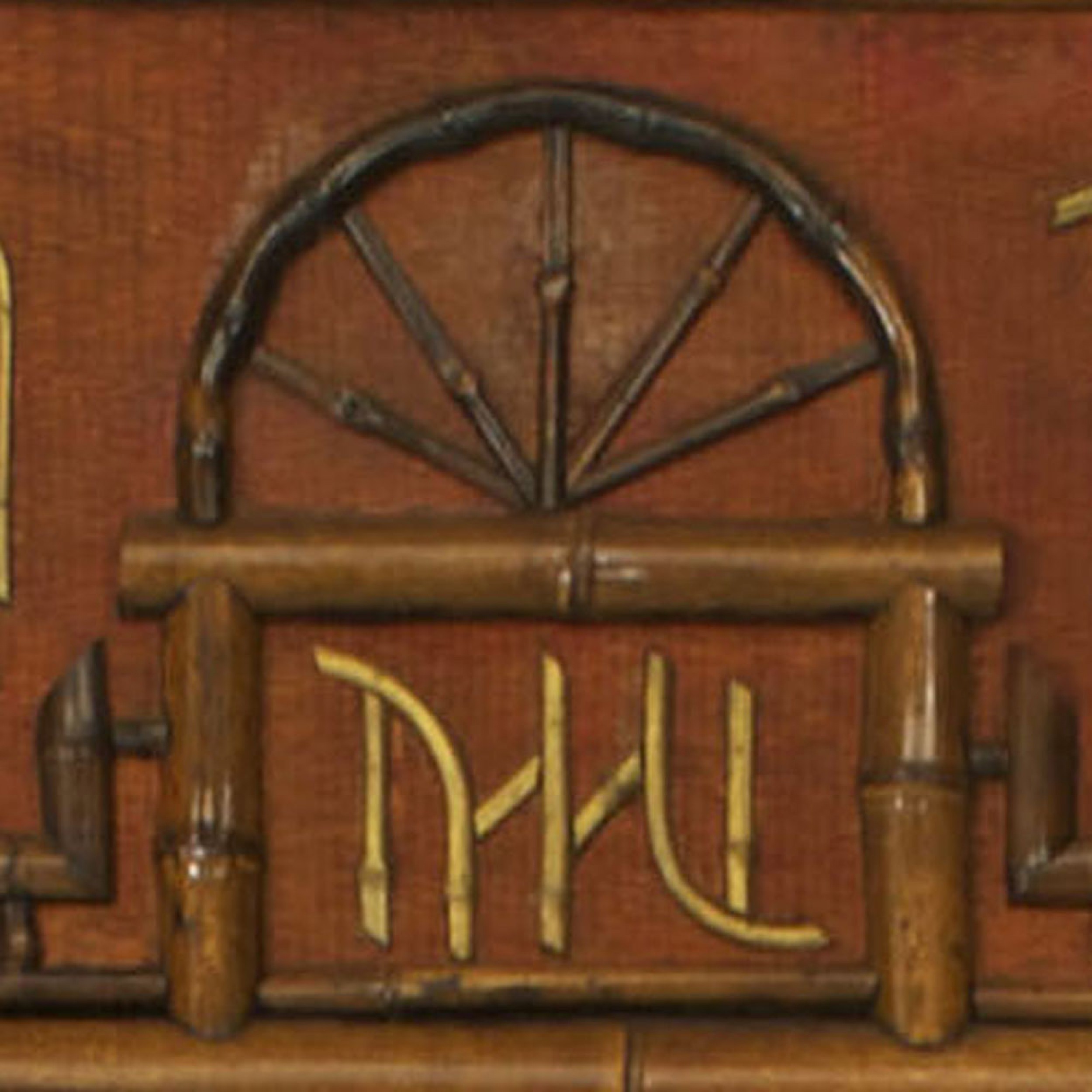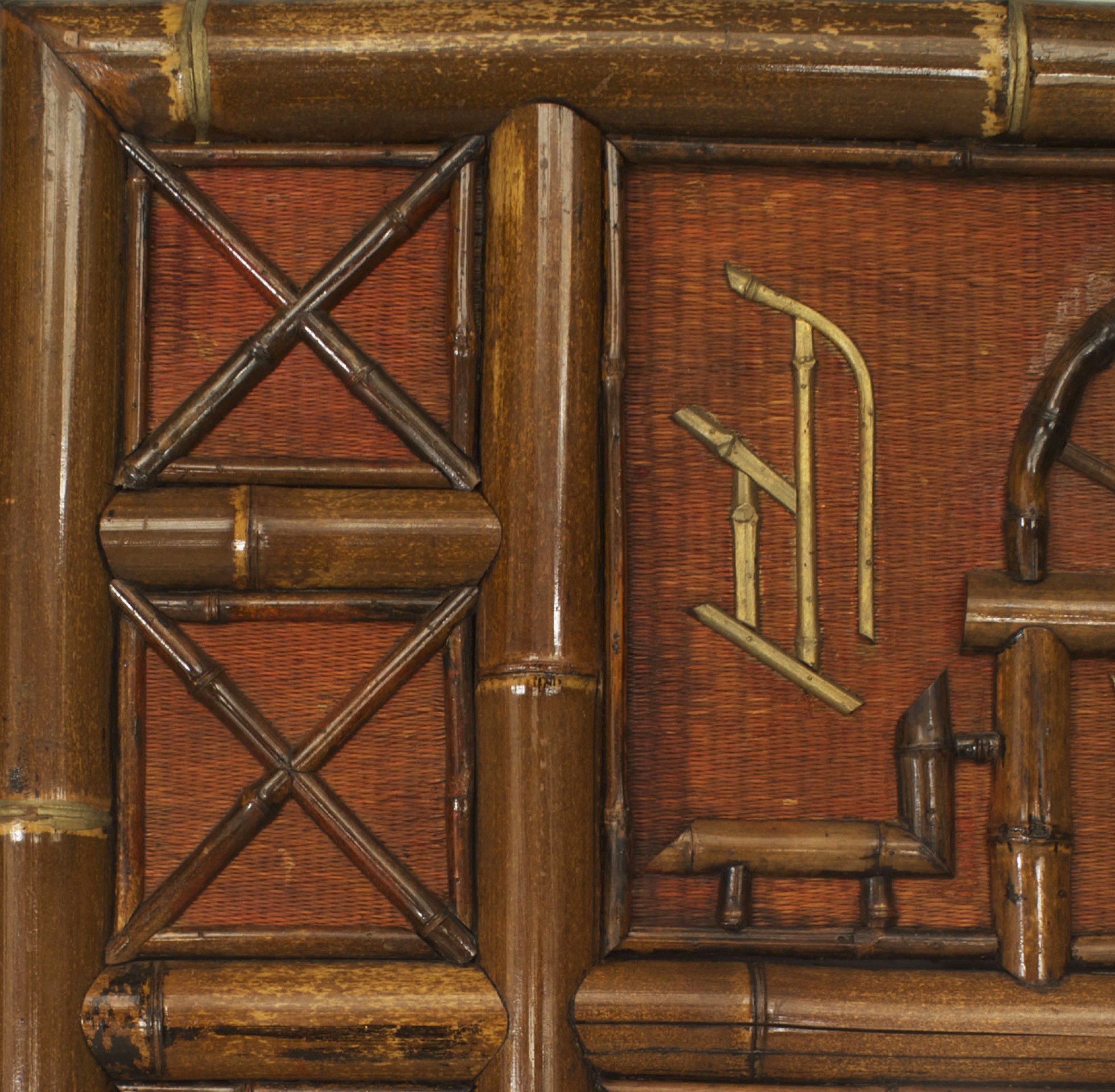English Victorian (19th Century) large rectangular bamboo wall mirror with a red rush matted frame border trimmed with strips of bamboo..