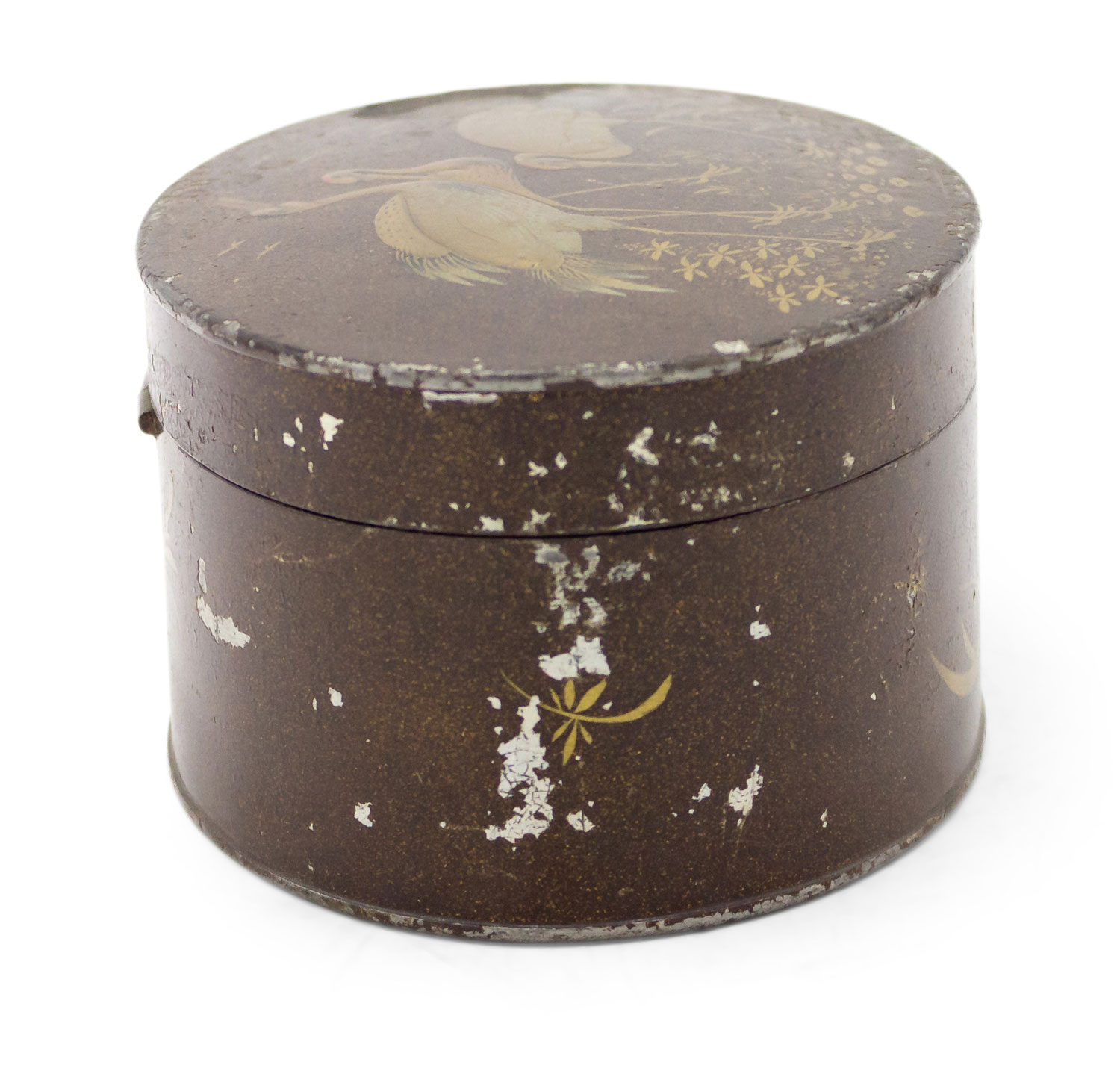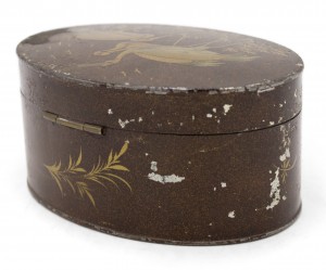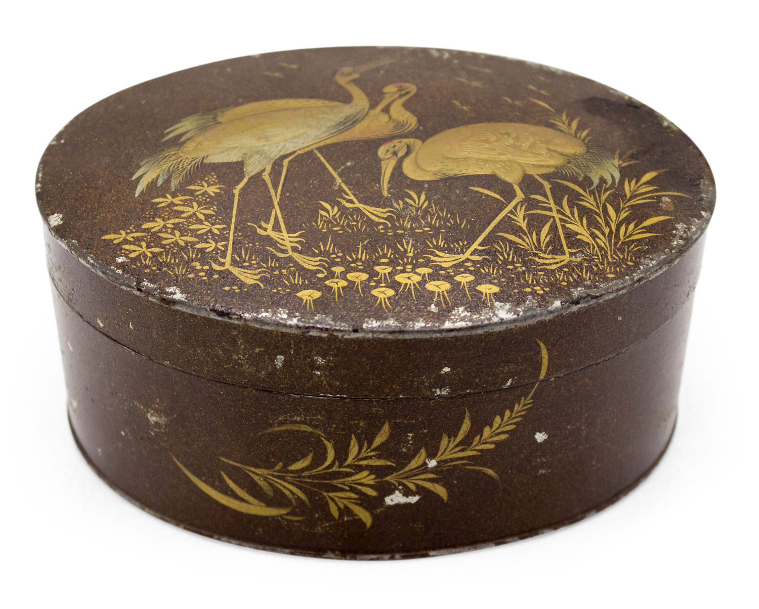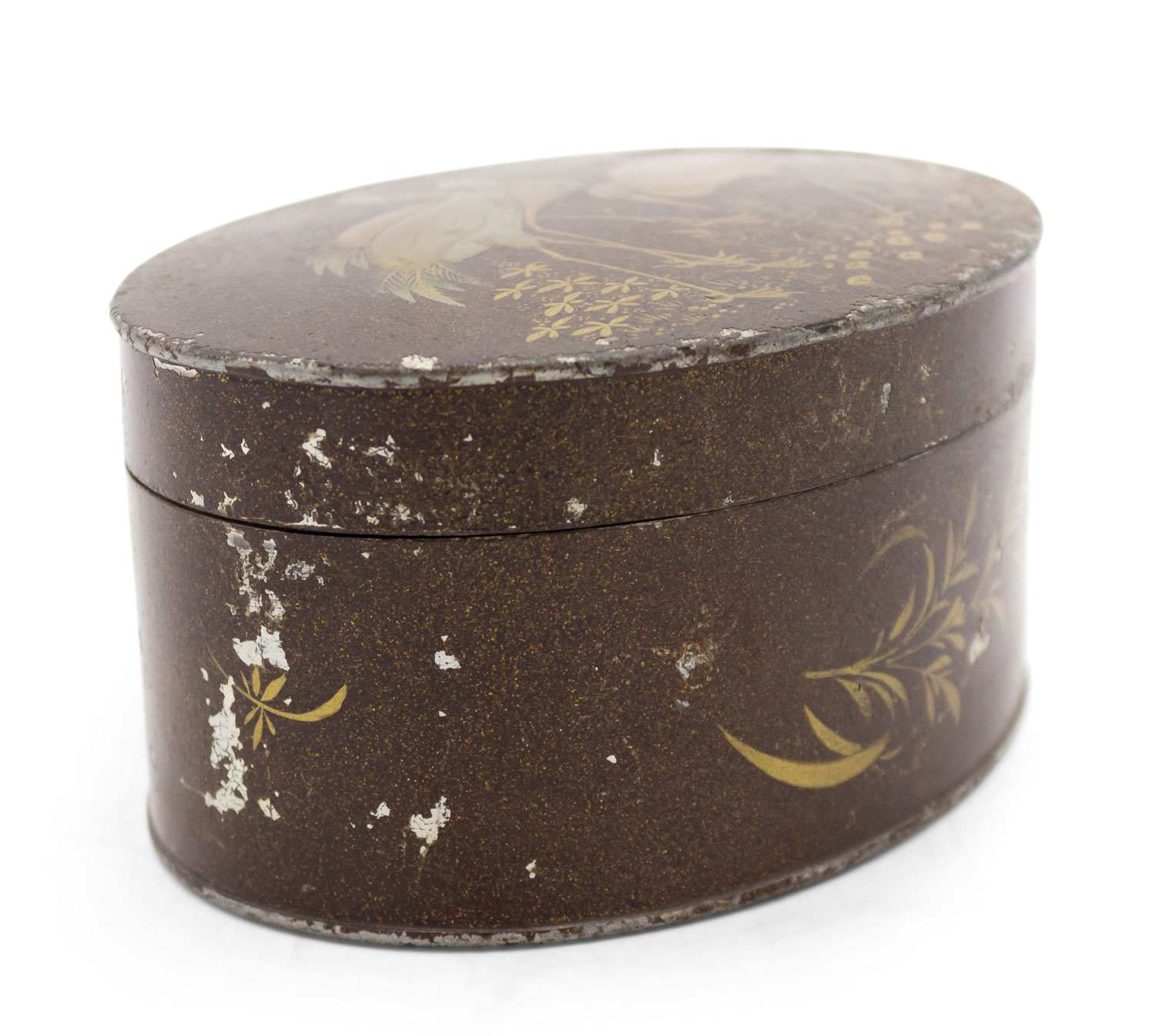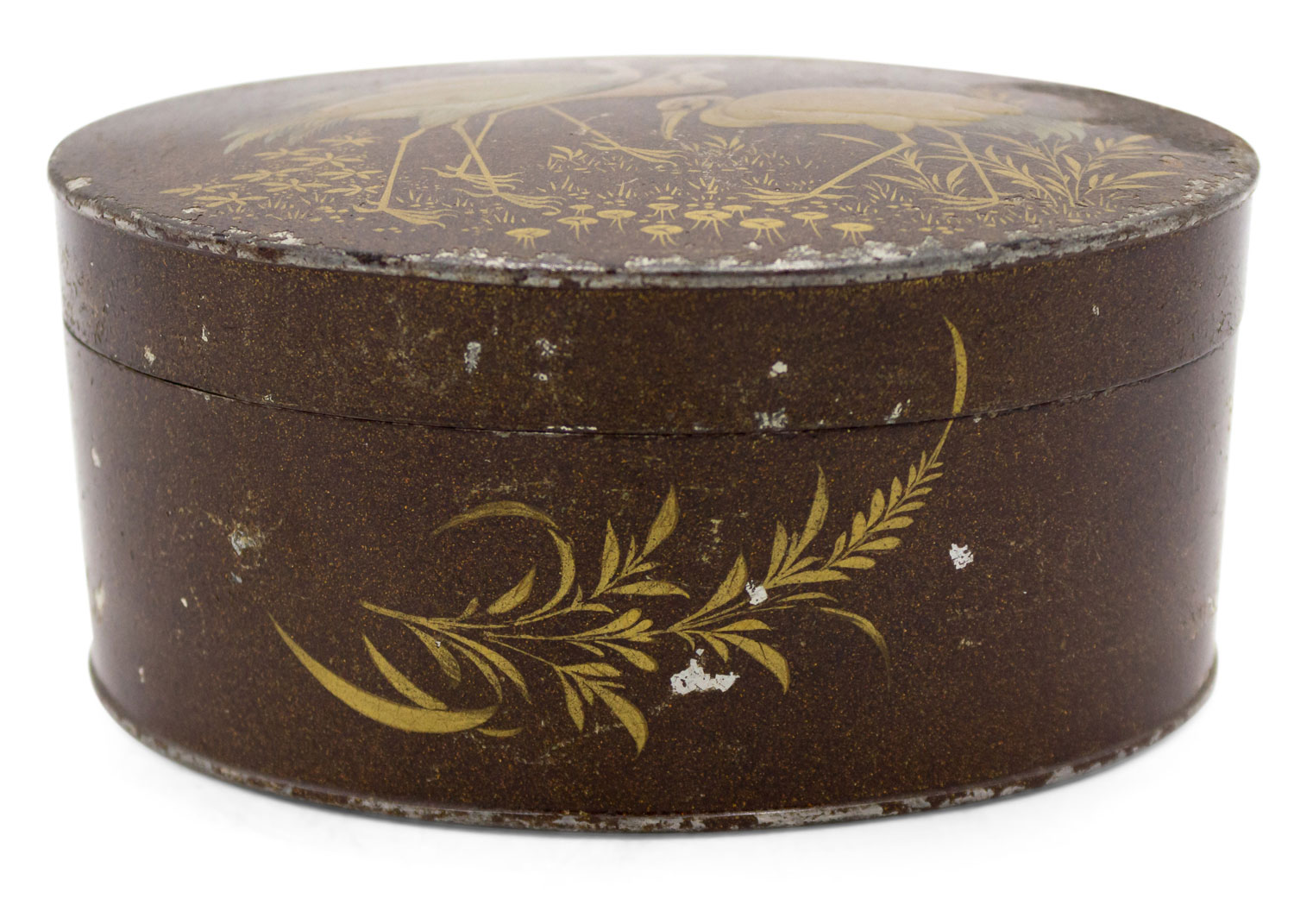 English Victorian brown lacquered tole oval shaped box with three herons on top