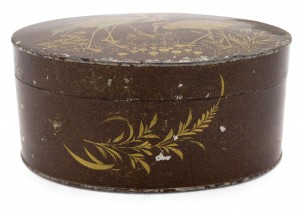 English Victorian brown lacquered tole oval shaped box with three herons on top.
