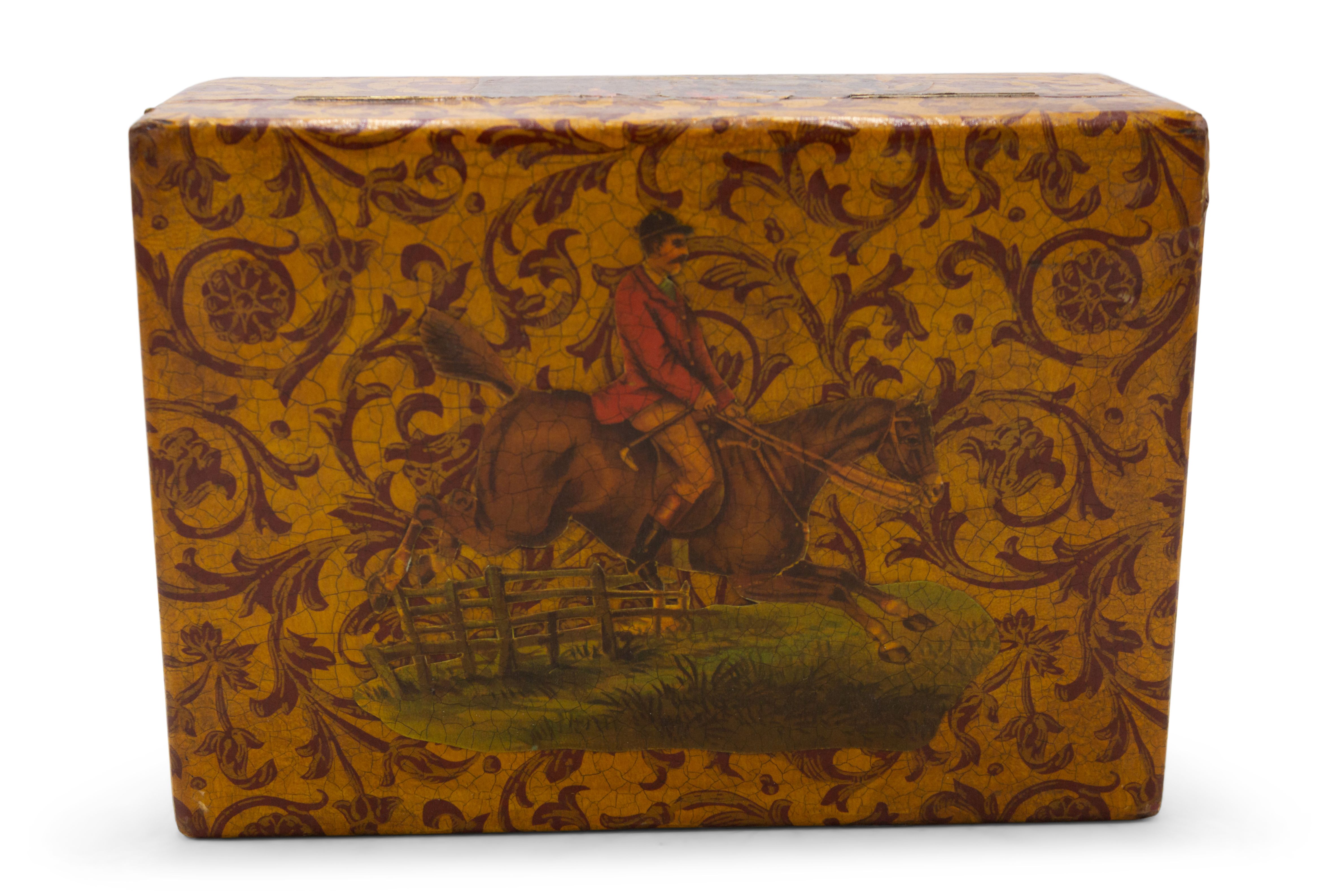 English Victorian-style (20th Century) decoupage decorated box with horse and rider design (signed).