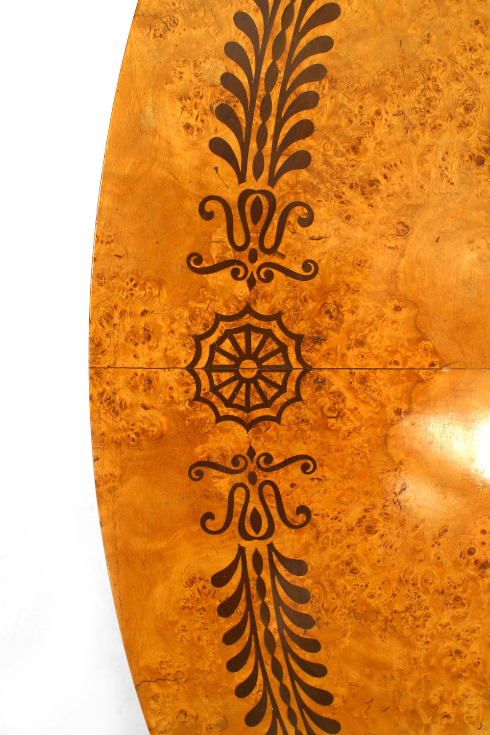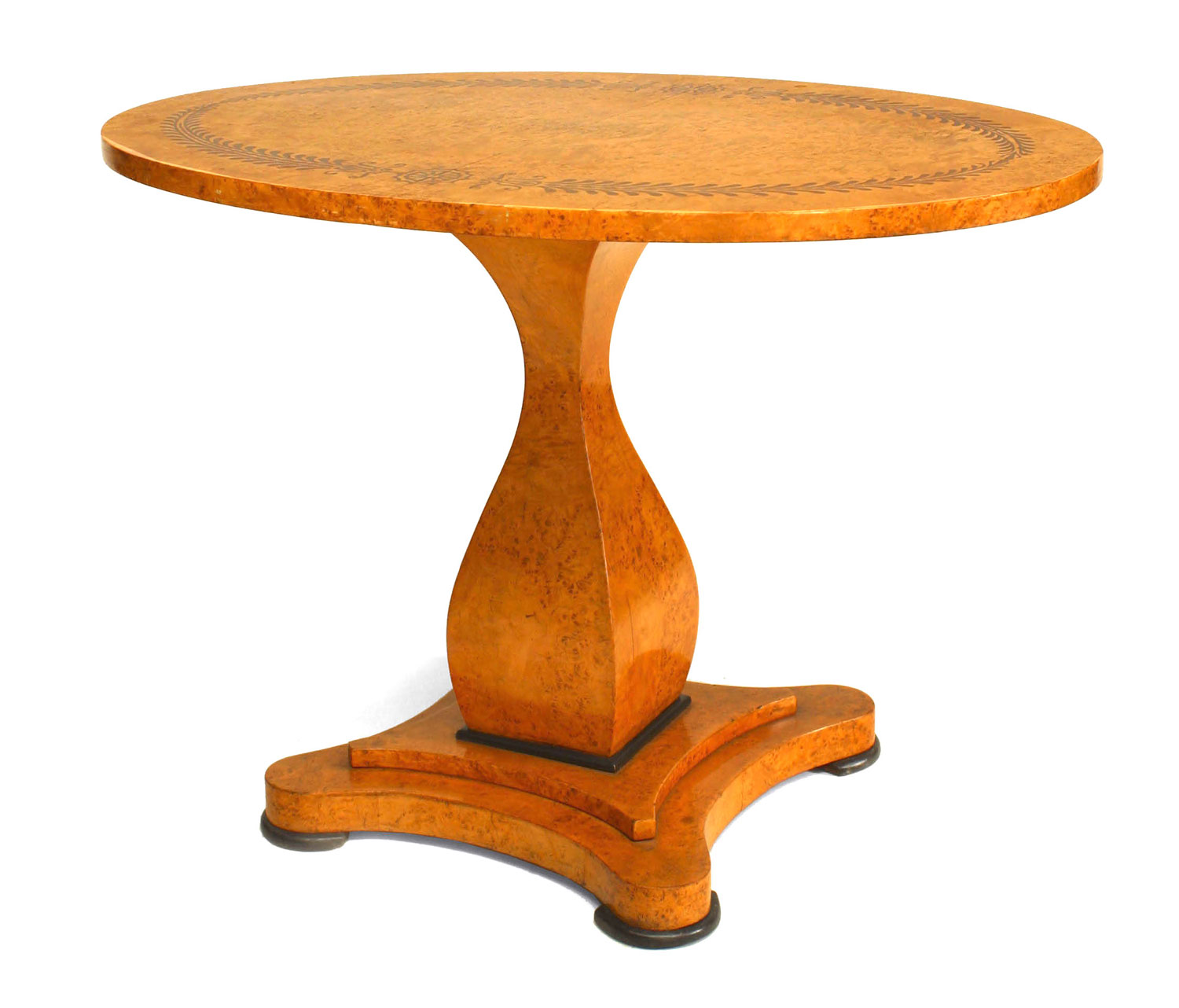 French Charles X-style maple and inlaid oval top center table with pedestal base.