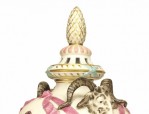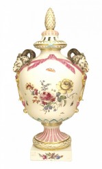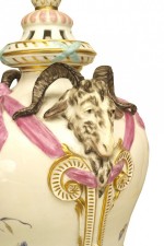 Continental German (Berlin, late 18th Cent) porcelain pink and white decorated urn with a finial top cover and ram head sides, signed on bottom..